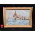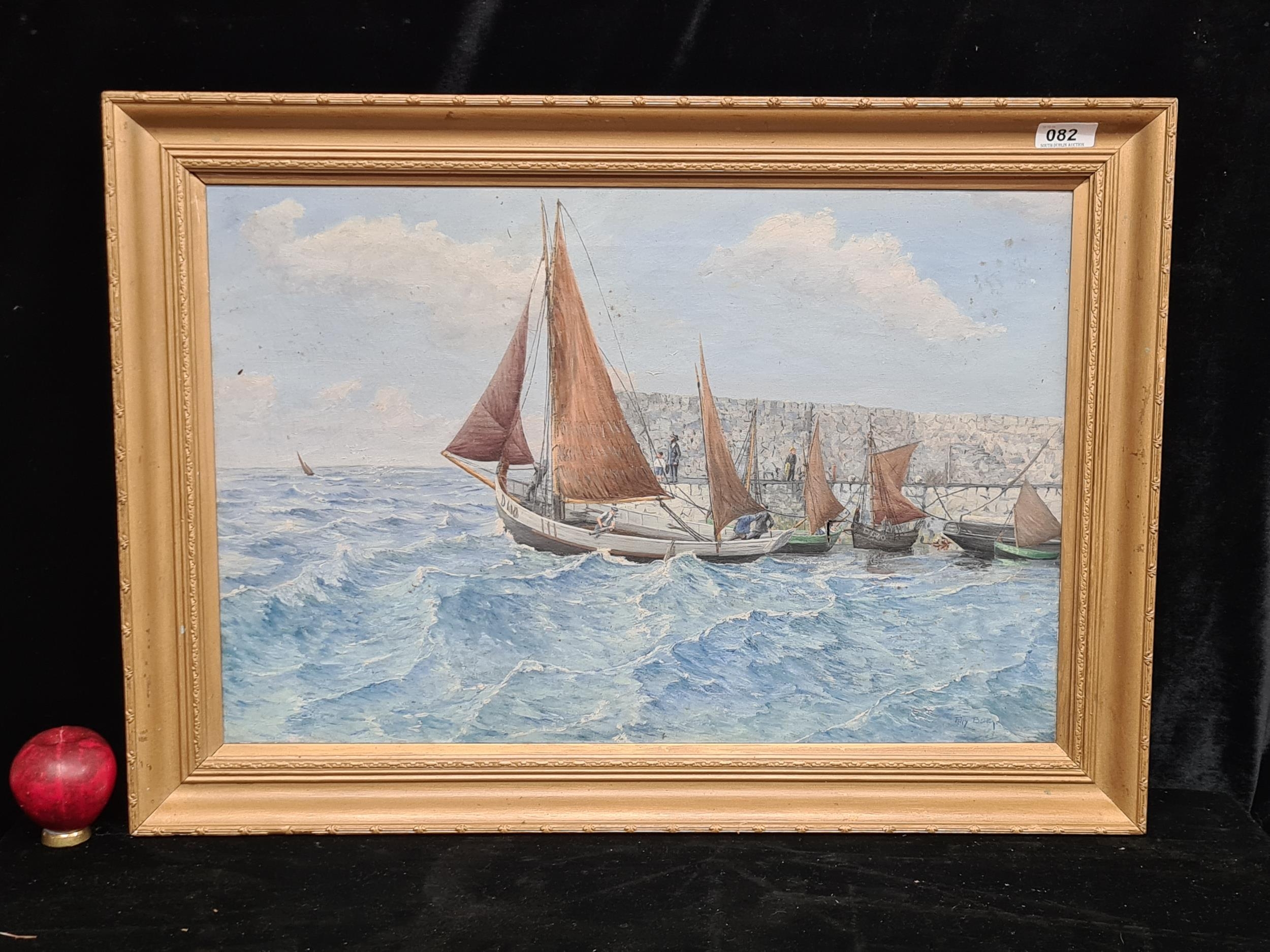 An original 'Percy Brown' oil on canvas painting. Portrays a bustling harbor scene where boats with their sailors preparing to face the impending rough seas. The water is rendered in bold, short, thick brushstrokes, lending it a dynamic, textured quality that enhances the turbulence of the waves. Signed lower right. Housed in a gilt frame. Slight damage to canvas.