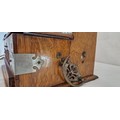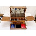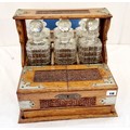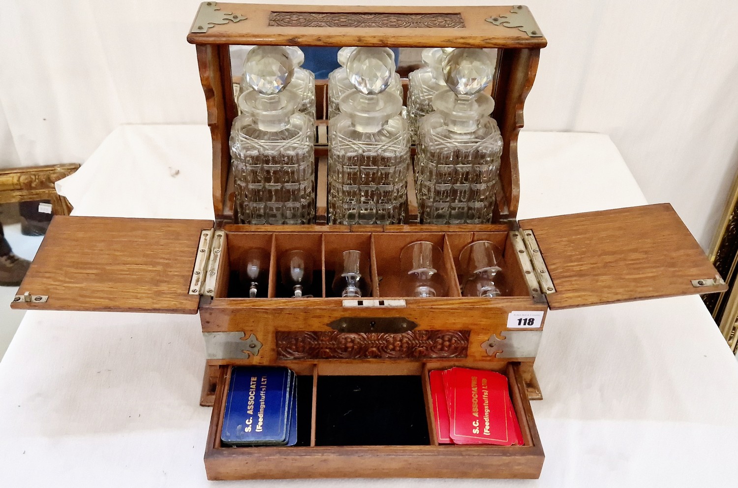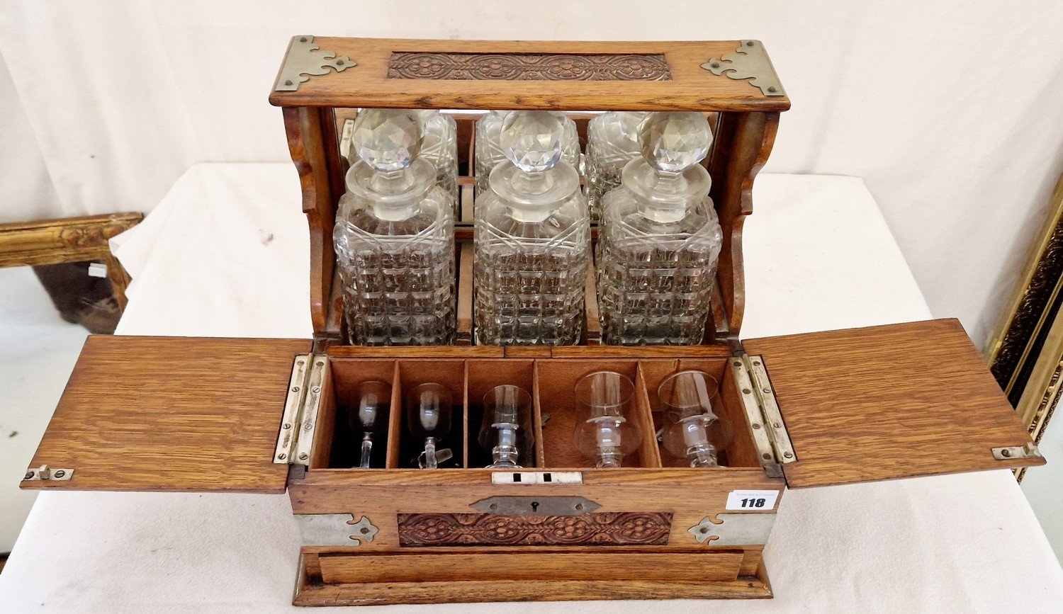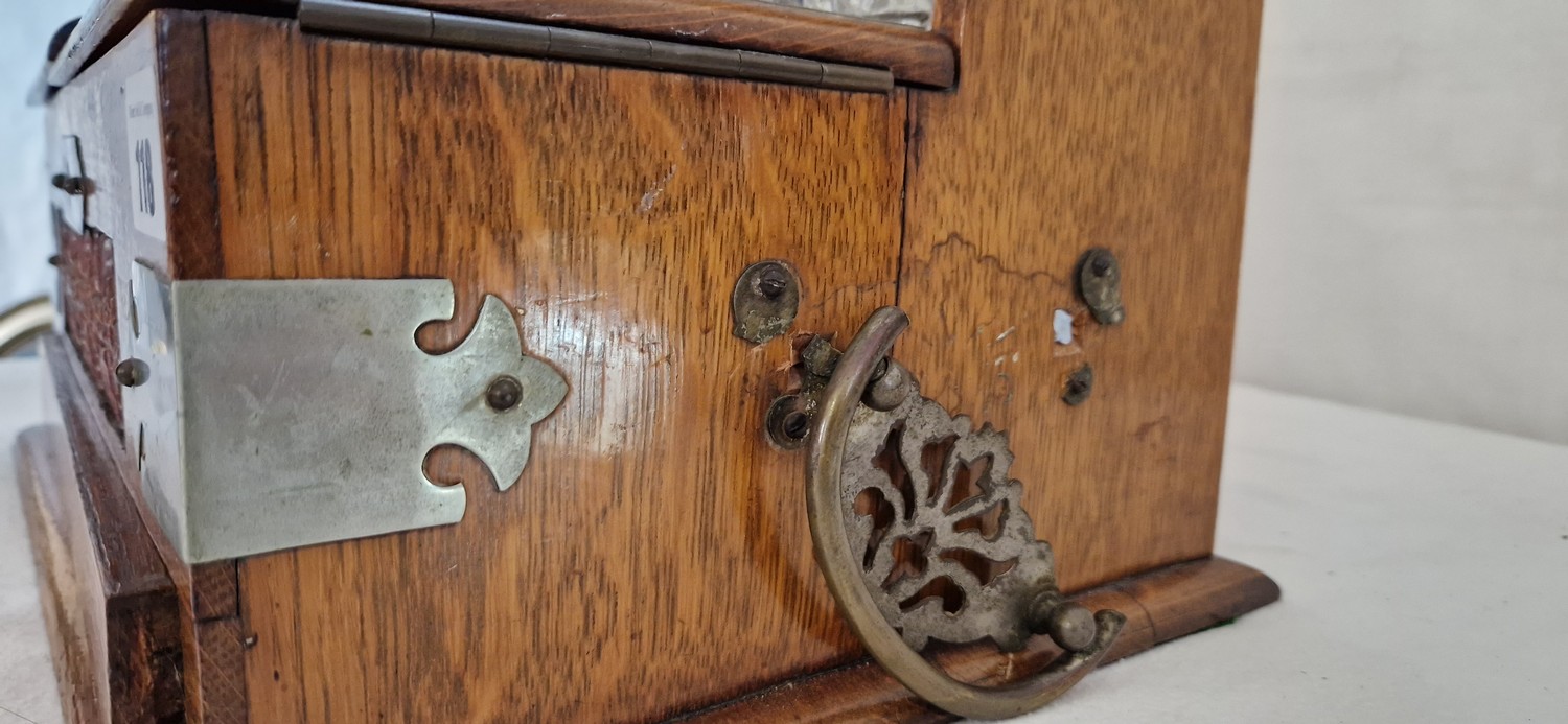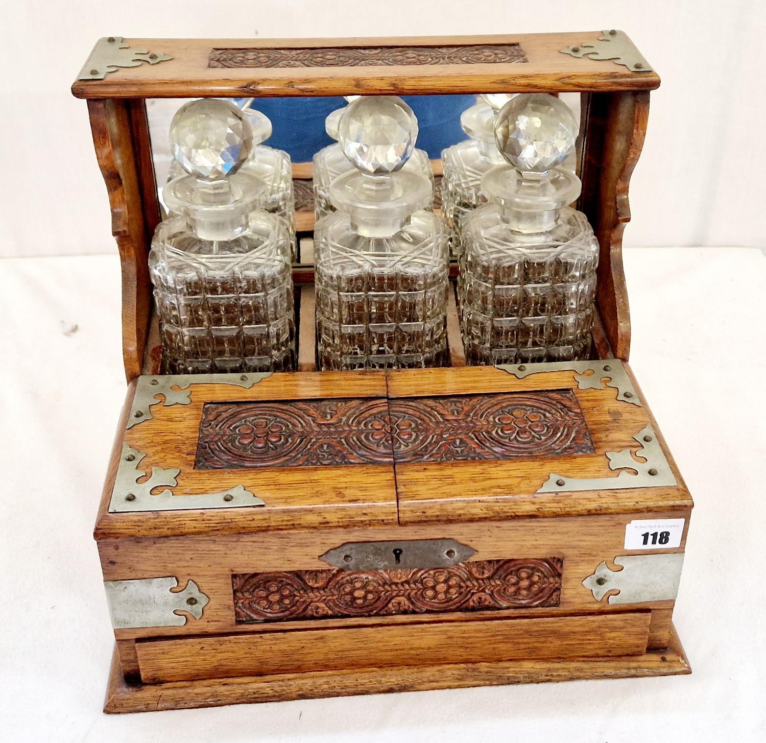 Oak three bottle tantalus with carved decoration and metal mounts and fitted interior