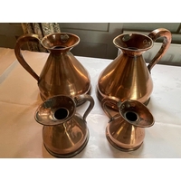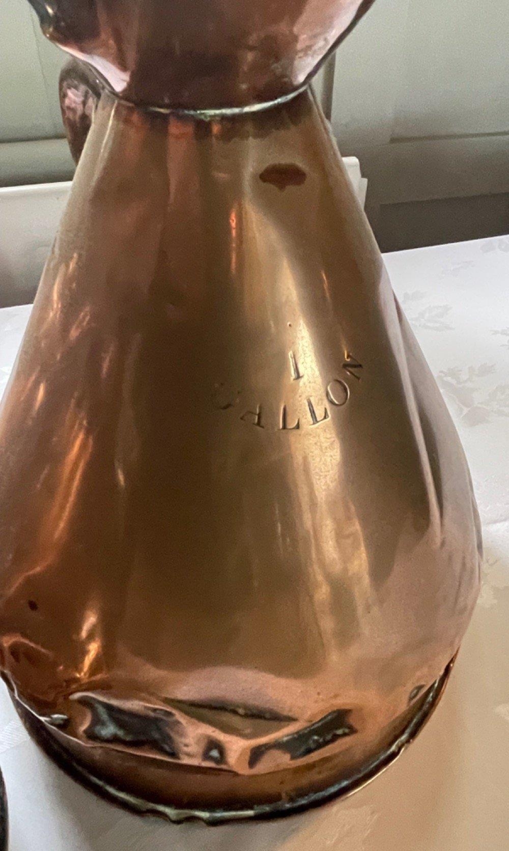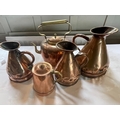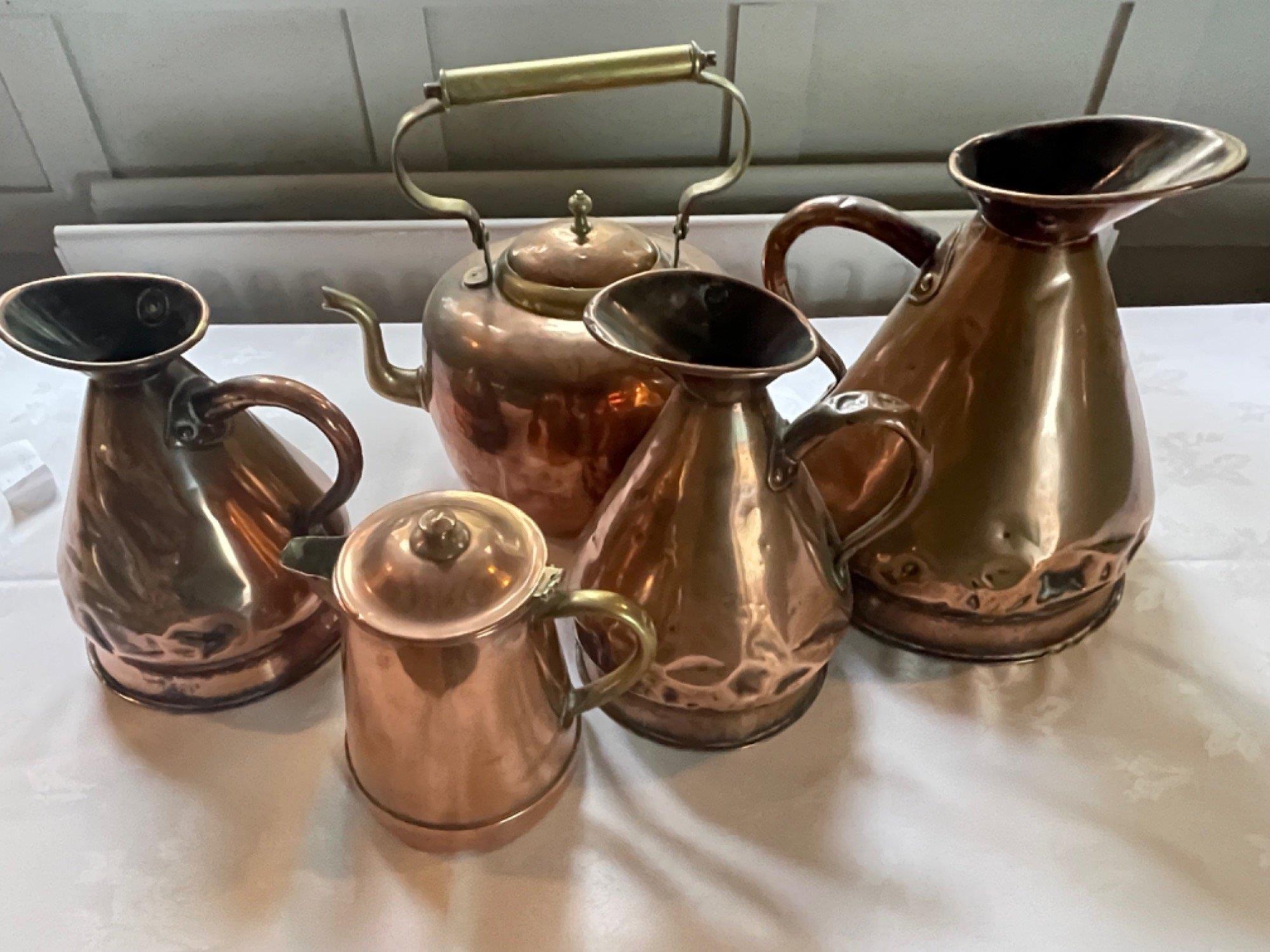 A collection of 5 ANTIQUE copper-ware measuring jugs 1 gallon measure etc - mainly and a copper kettle and lidded pot - tallest item 35cm approx - these items came from an old INN