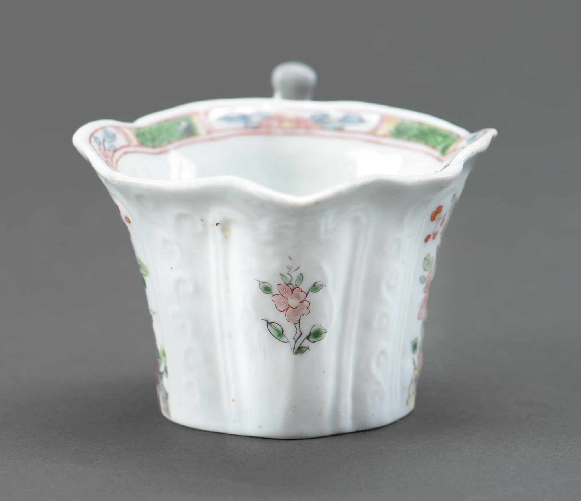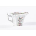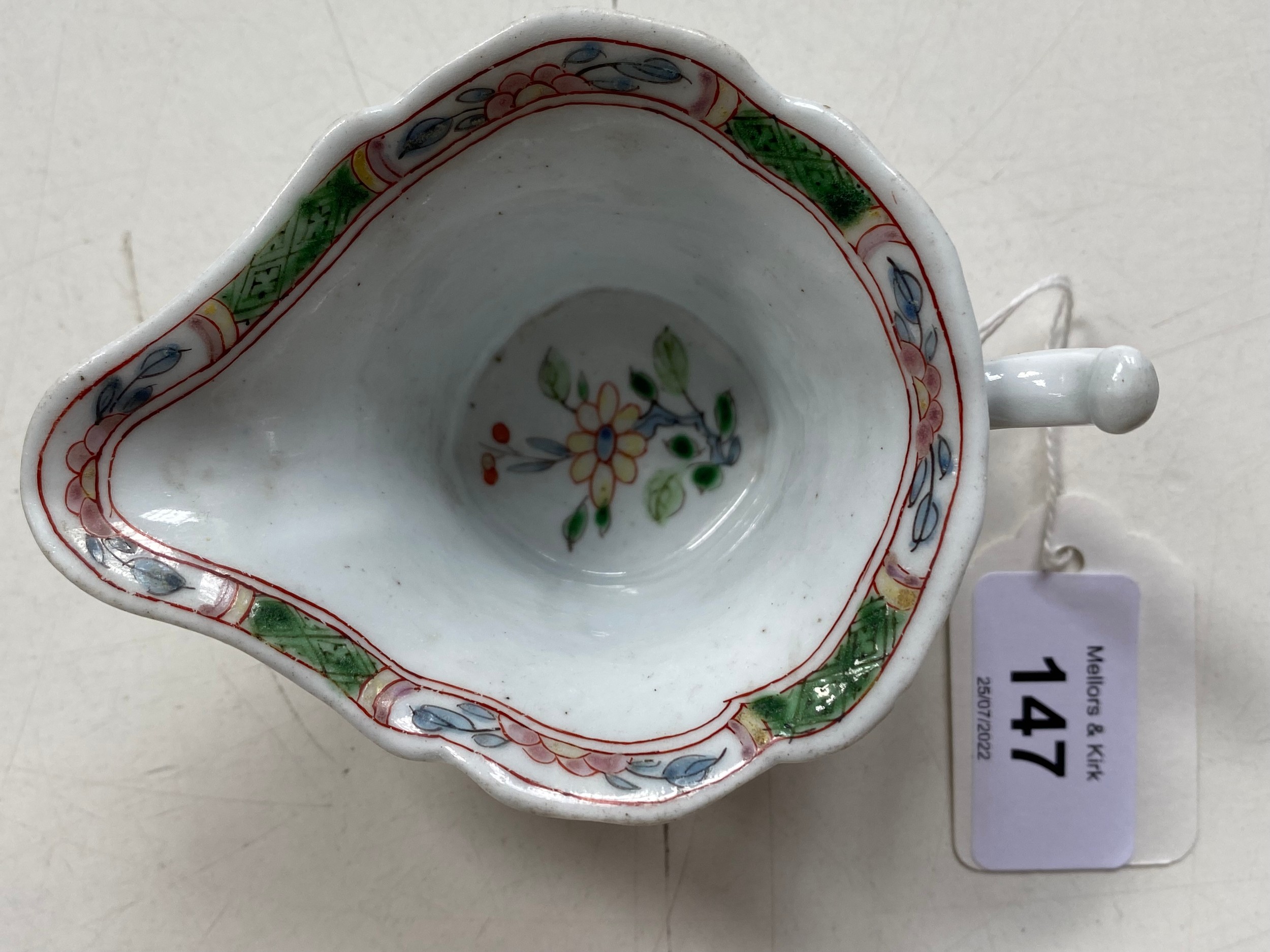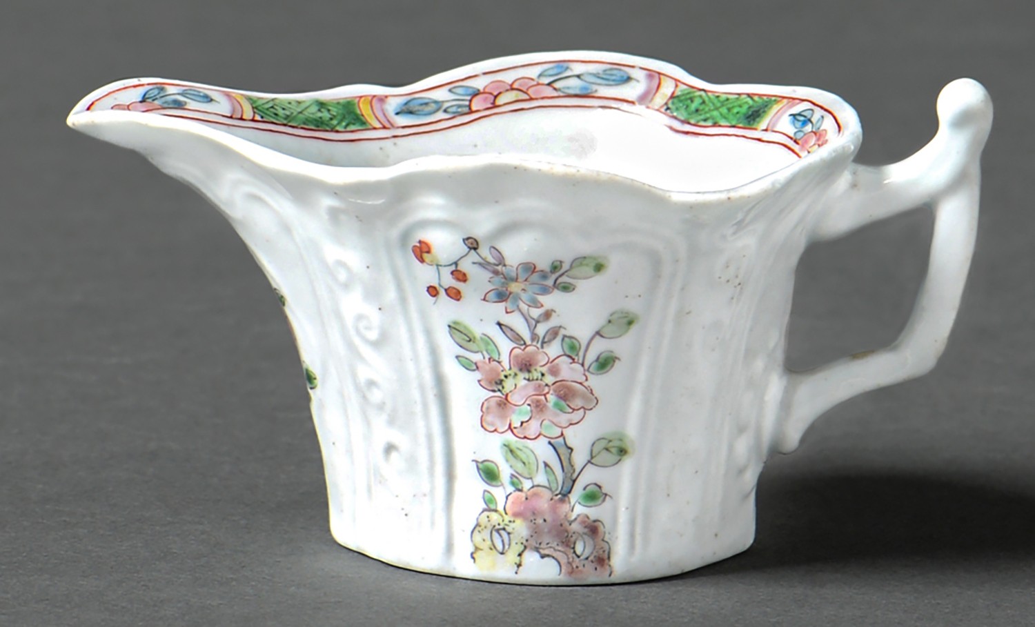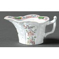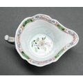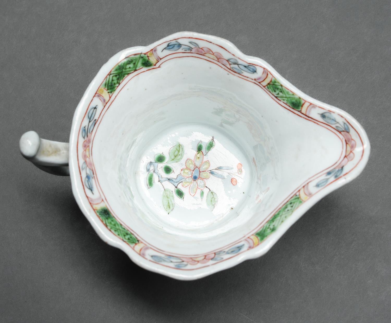 An early Worcester creamboat, c1753-1757, the flared sides moulded with cartouches flanked by scrolls and painted in famille verte enamels and flowers, the interior with a single yellow flower on a blue stem, the inner border with green diaper panels, 10.3cm l