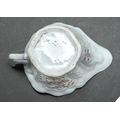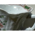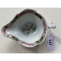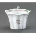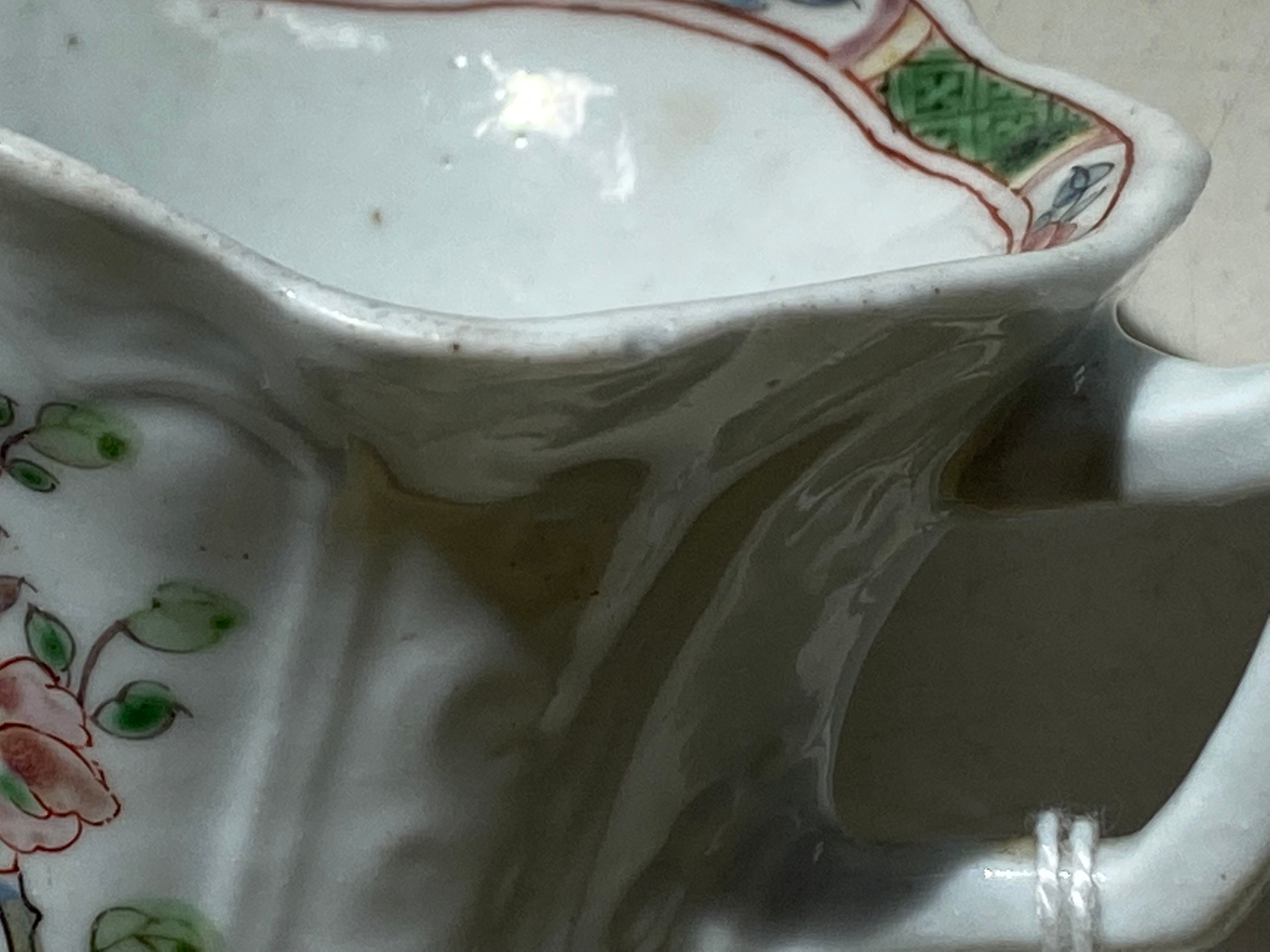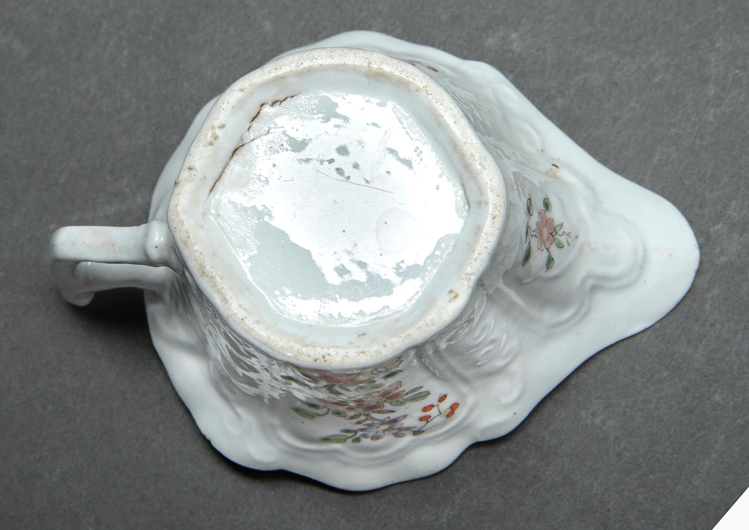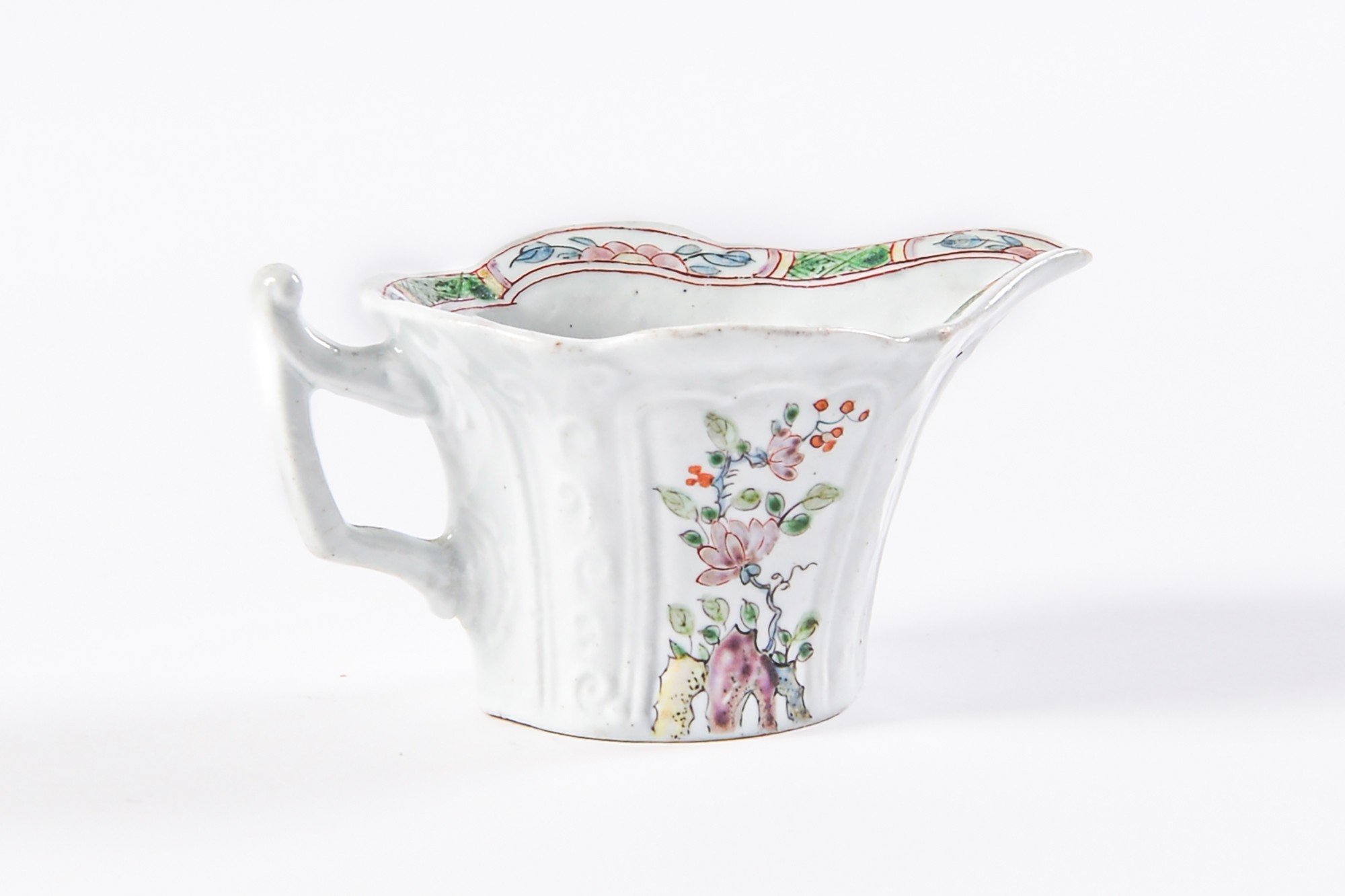 An early Worcester creamboat, c1753-1757, the flared sides moulded with cartouches flanked by scrolls and painted in famille verte enamels and flowers, the interior with a single yellow flower on a blue stem, the inner border with green diaper panels, 10.3cm l