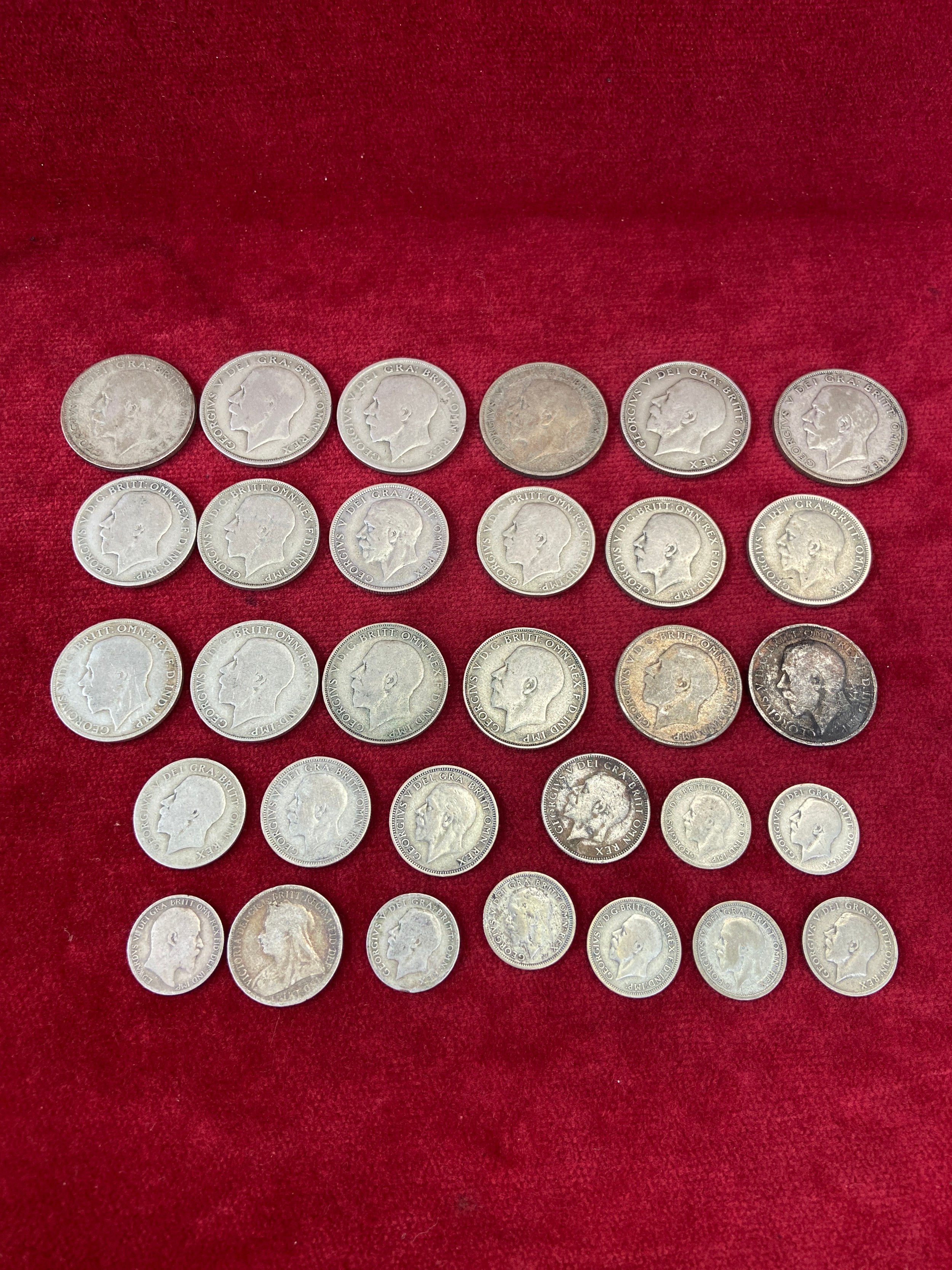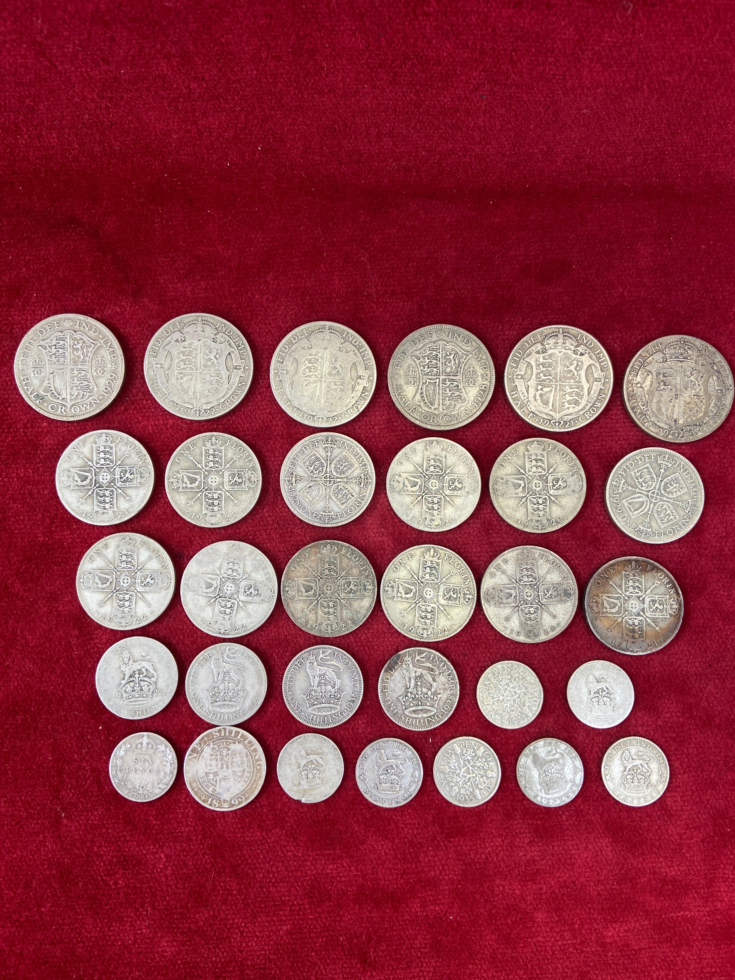 Silver scrap coinage - Mostly 1920-46 (50% silver), including 7x sixpences, 4x shillings, 12x Florins and 6x half crowns. Also a 1904 sixpence and an 1899 shilling (92.5% silver).
