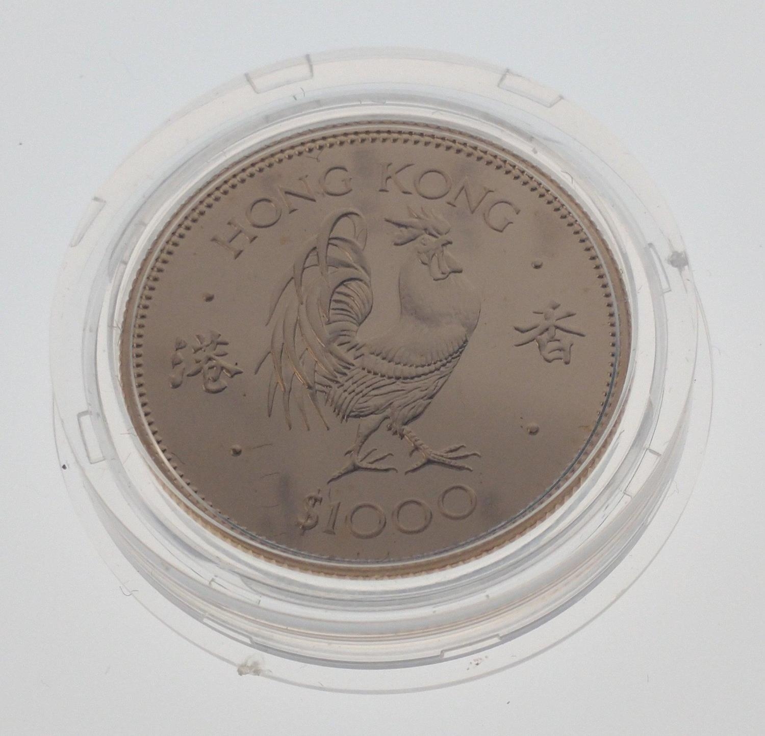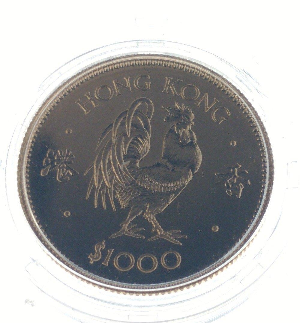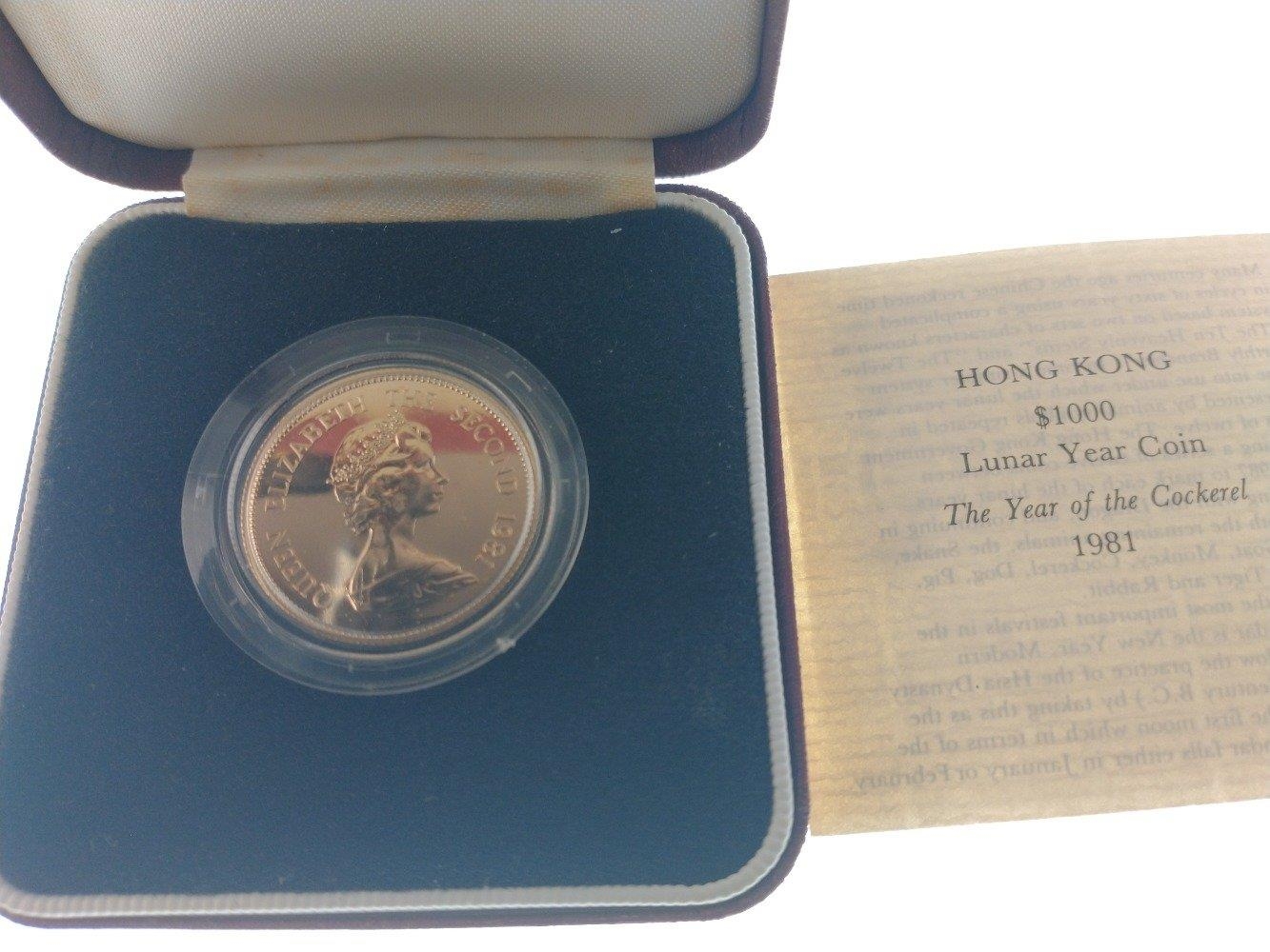 A 1981 HONG KONG $1000 Lunar Year Coin 'The Year Of The Cockerel' struck in 22ct yellow gold within its protective case In 1981 to celebrate the Lunar Year of the Cockerel, the Royal Mint released a very Limited Issue Lunar Cockerel $1000 One Thousand Dollar Gold Proof ...weight 15.98g - comes in original presentation case