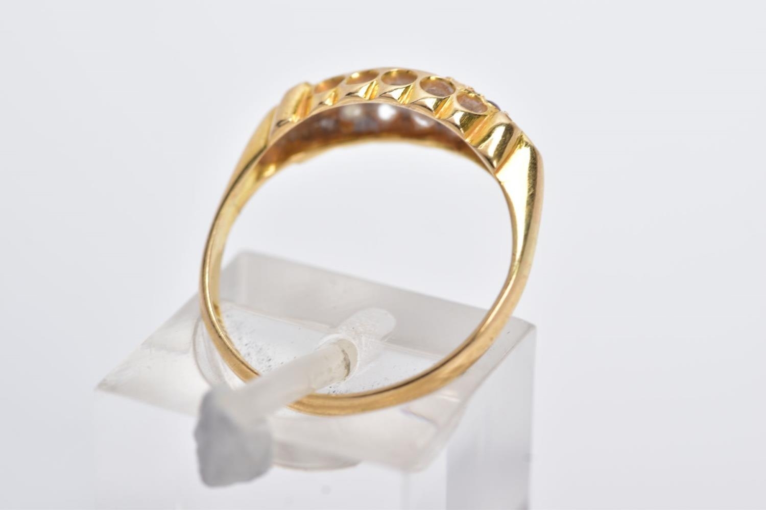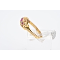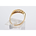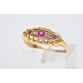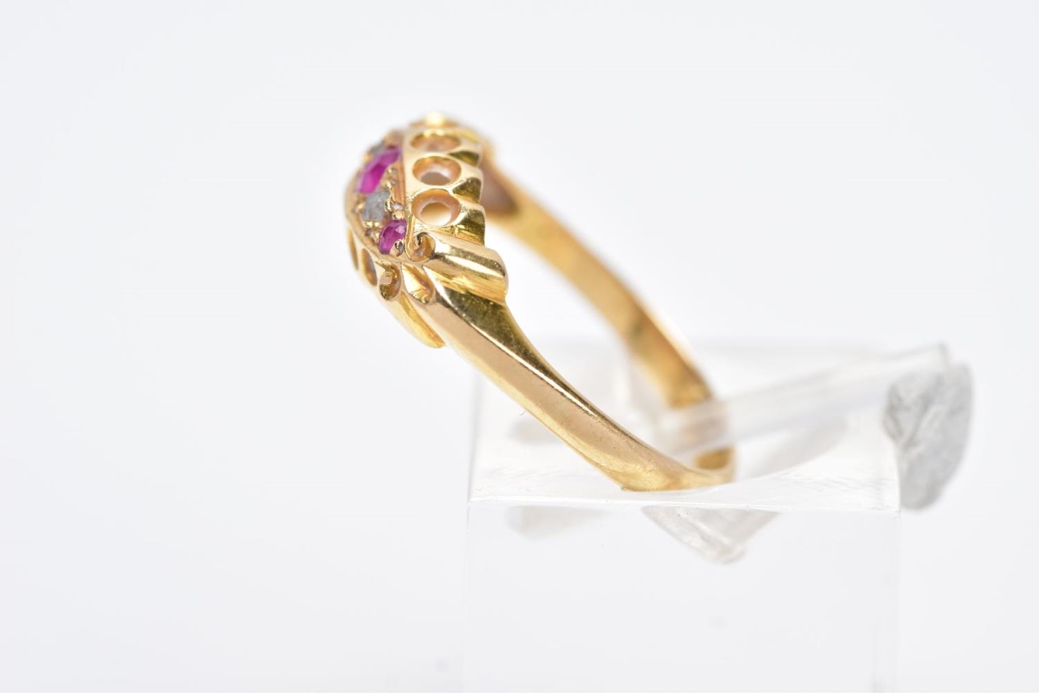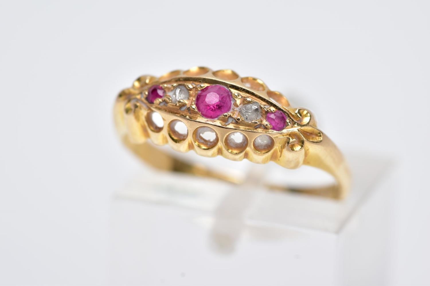 AN EARLY 20TH CENTURY 18CT GOLD BOAT RING, designed with three graduated, circular cut rubies interspaced with two rose cut diamonds, openwork scallop edge gallery and scroll detailed shoulders, hallmarked 18ct gold 1918, ring size K, approximate gross weight 2.2 grams (Condition Report:- overall condition good, general light wear)
