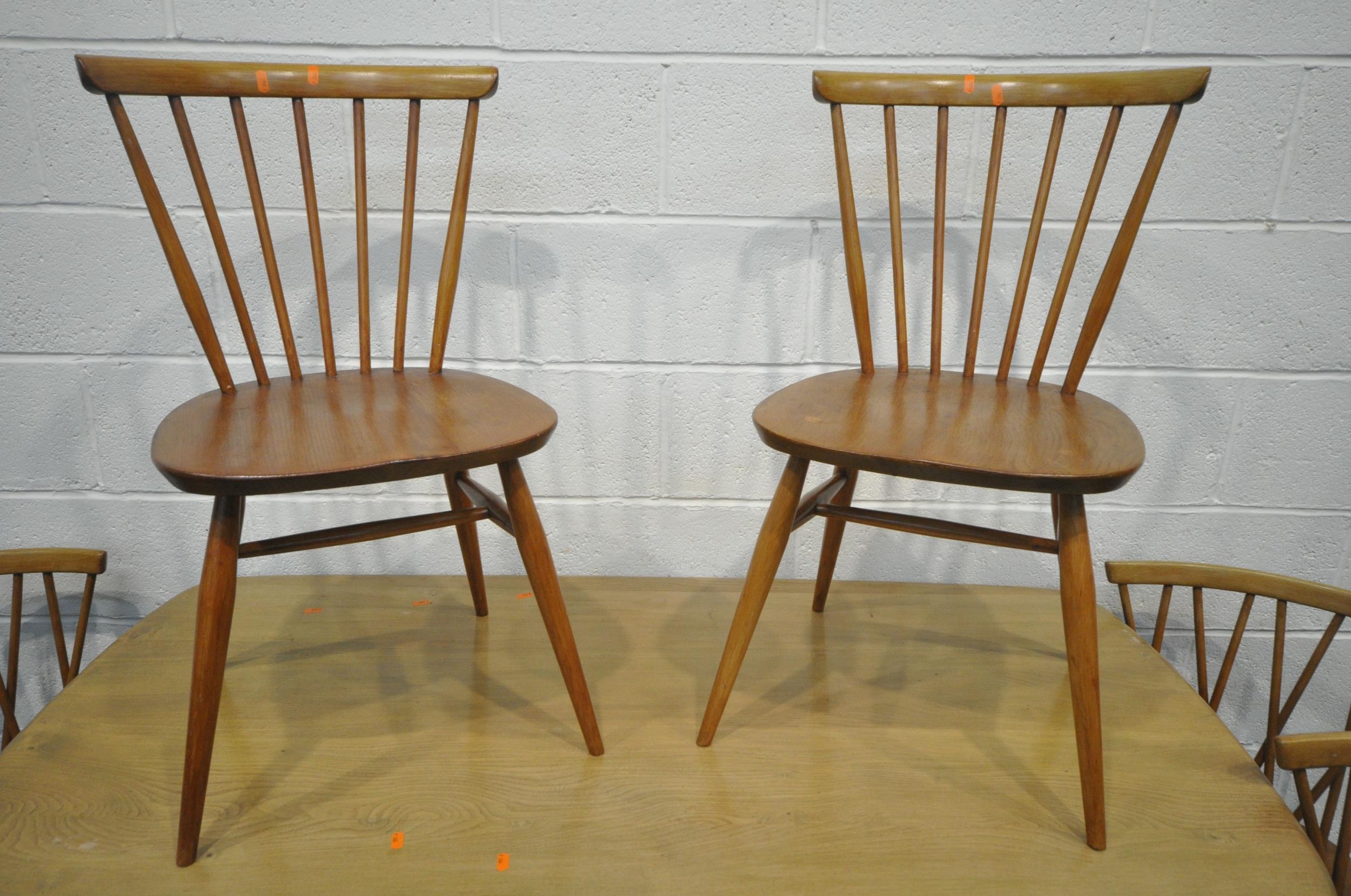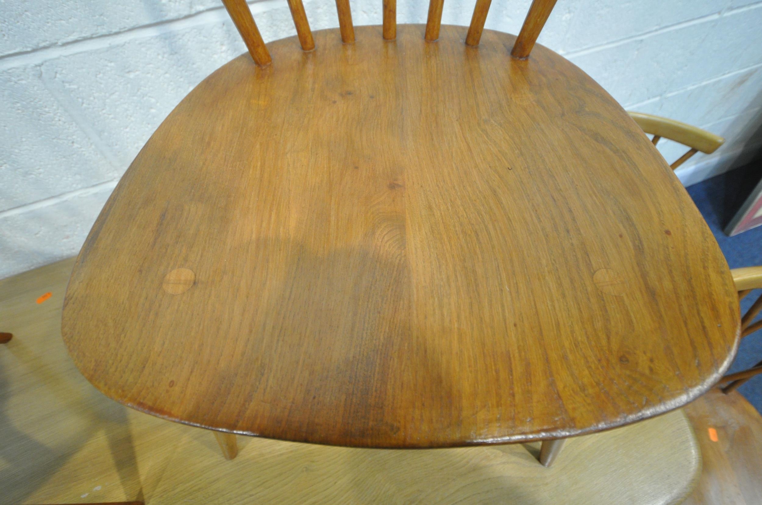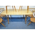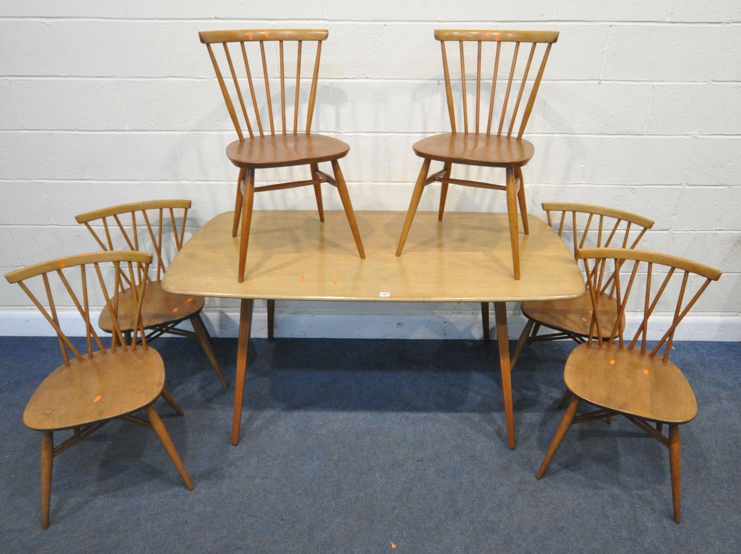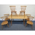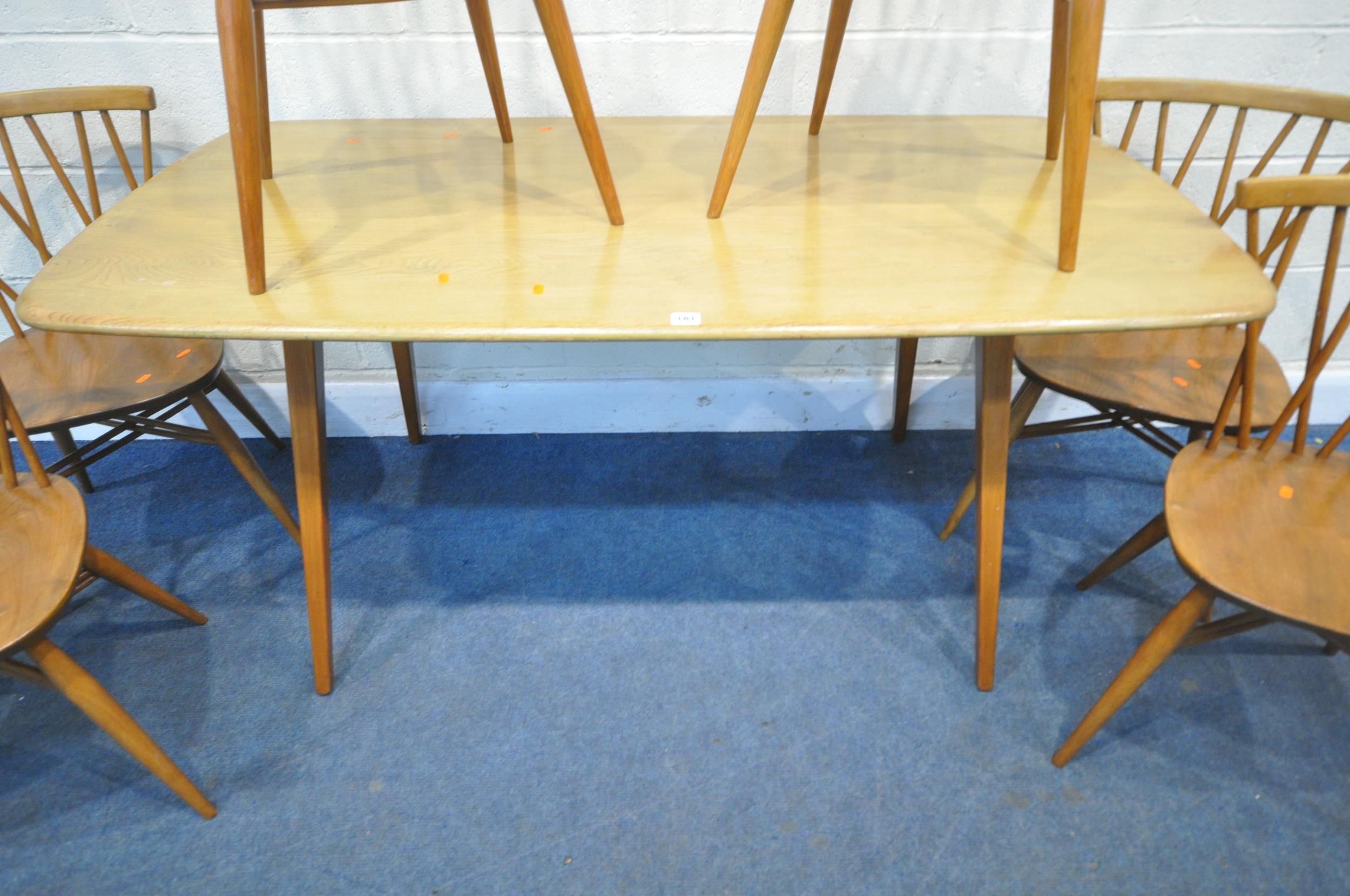 LUCIAN ERCOLANI, AN ERCOL MID-CENTURY ELM AND BEECH RECTANGULAR DINING TABLE, raised on square tapered legs, model 382, length 153cm x depth 77cm x height 74cm, a set of four Windsor lattice back chairs, model 306, along with a pair of model 449 chairs, condition report: all with imperfections, such as wobbly frames, marks, scuffs, stains, discolouration, other wear and usage (7)