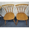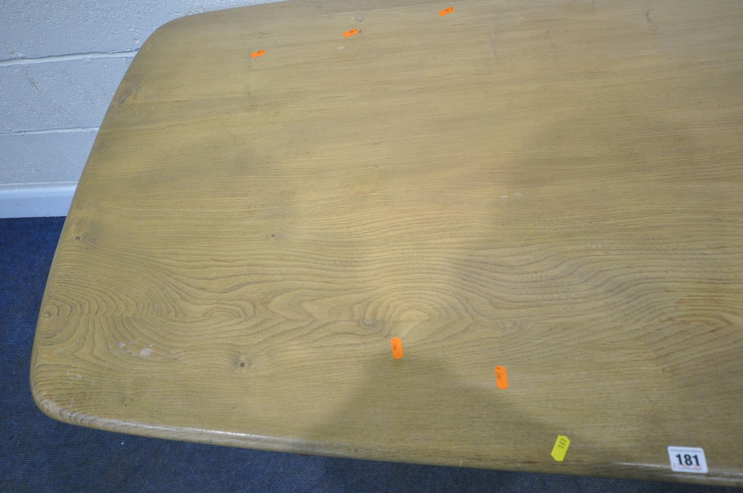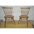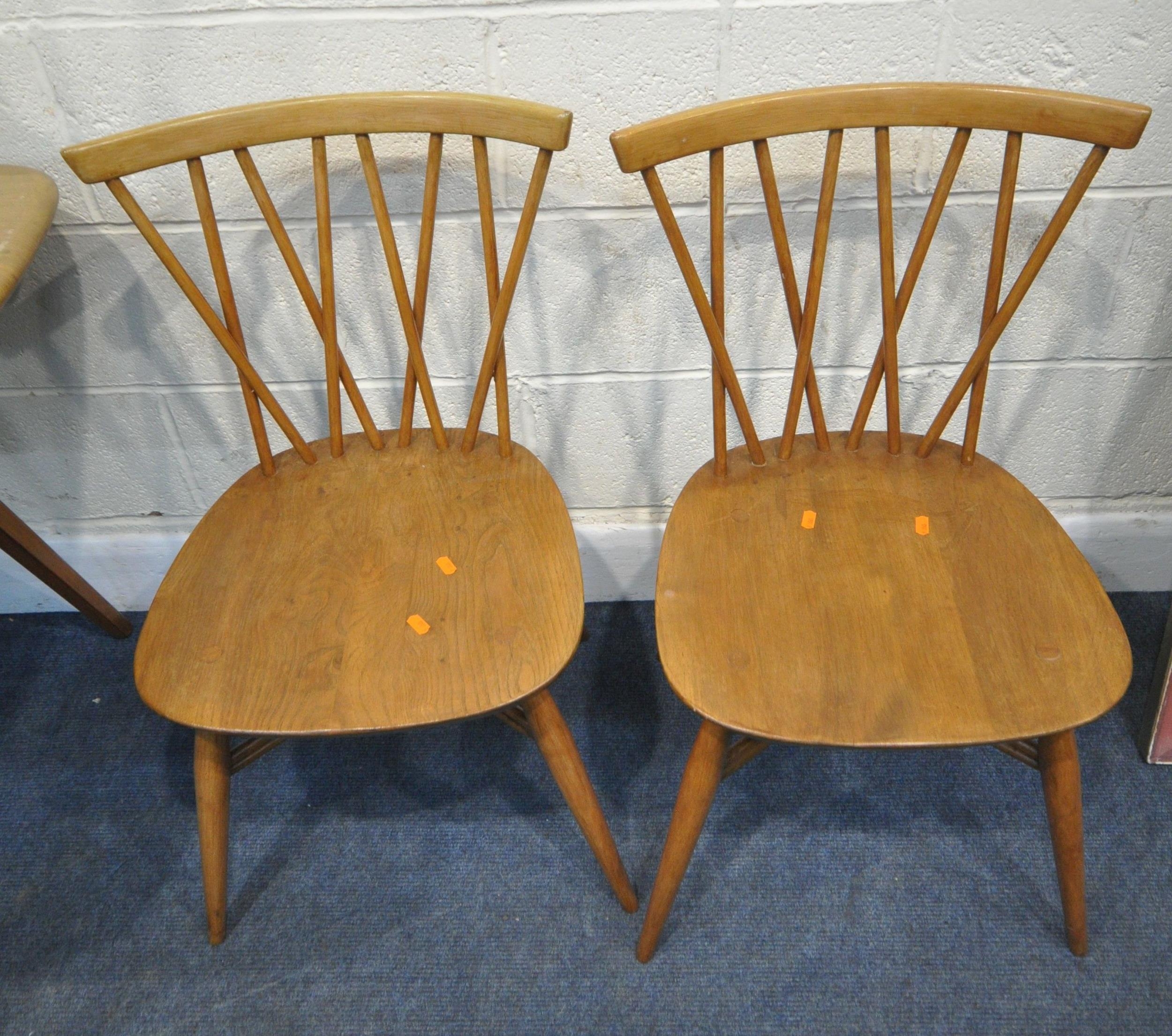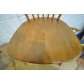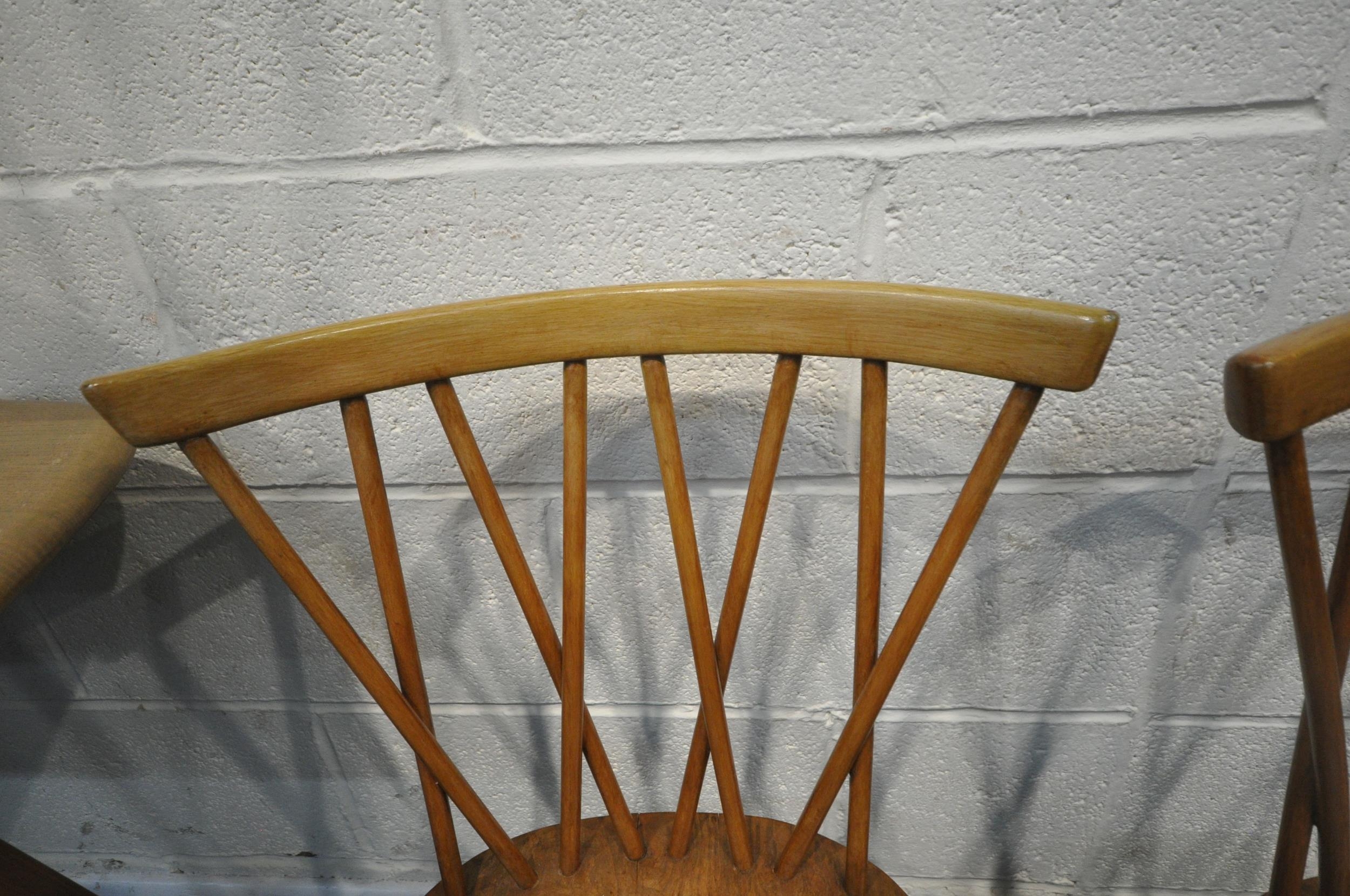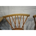 LUCIAN ERCOLANI, AN ERCOL MID-CENTURY ELM AND BEECH RECTANGULAR DINING TABLE, raised on square tapered legs, model 382, length 153cm x depth 77cm x height 74cm, a set of four Windsor lattice back chairs, model 306, along with a pair of model 449 chairs, condition report: all with imperfections, such as wobbly frames, marks, scuffs, stains, discolouration, other wear and usage (7)