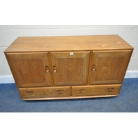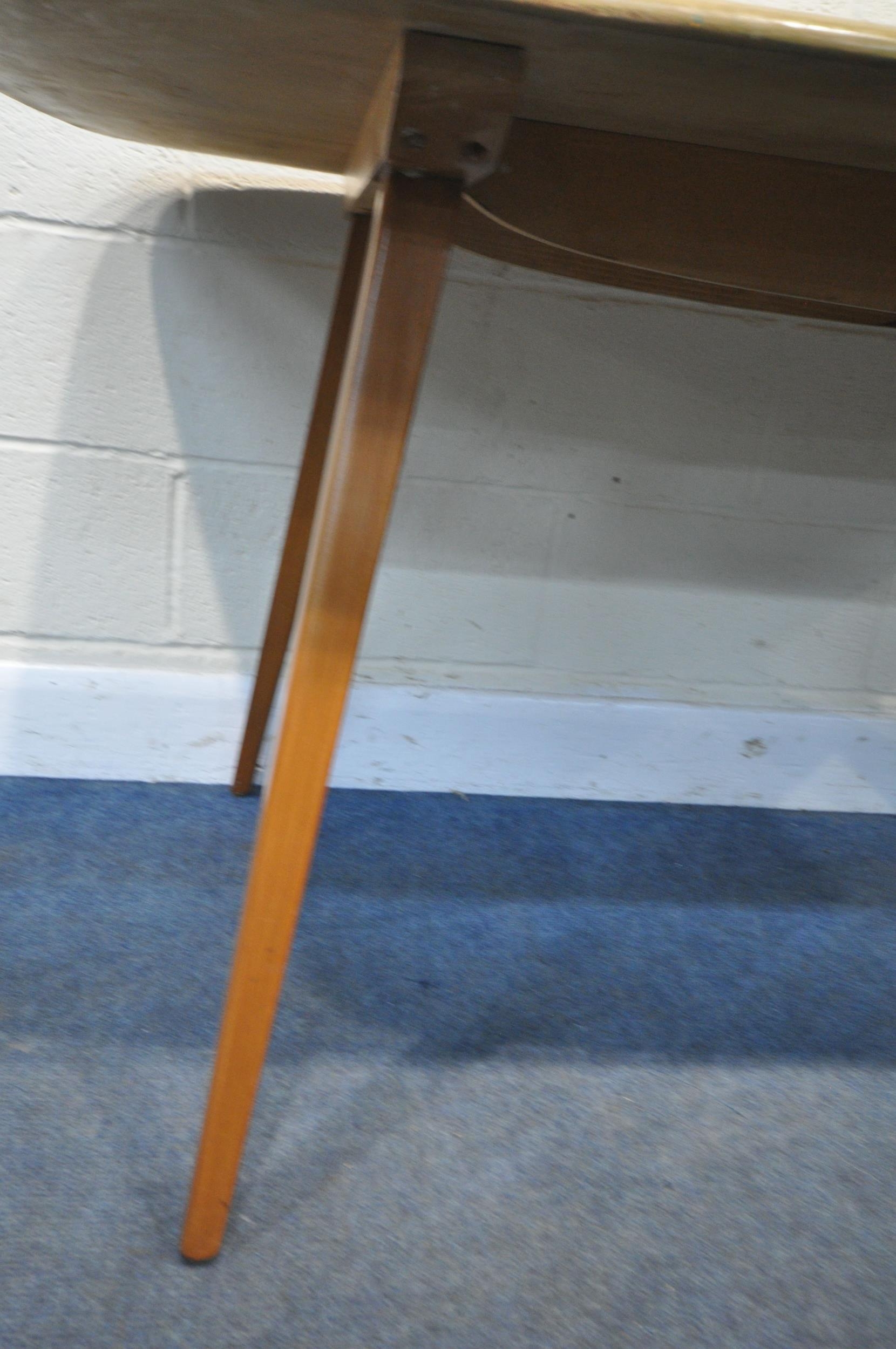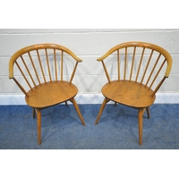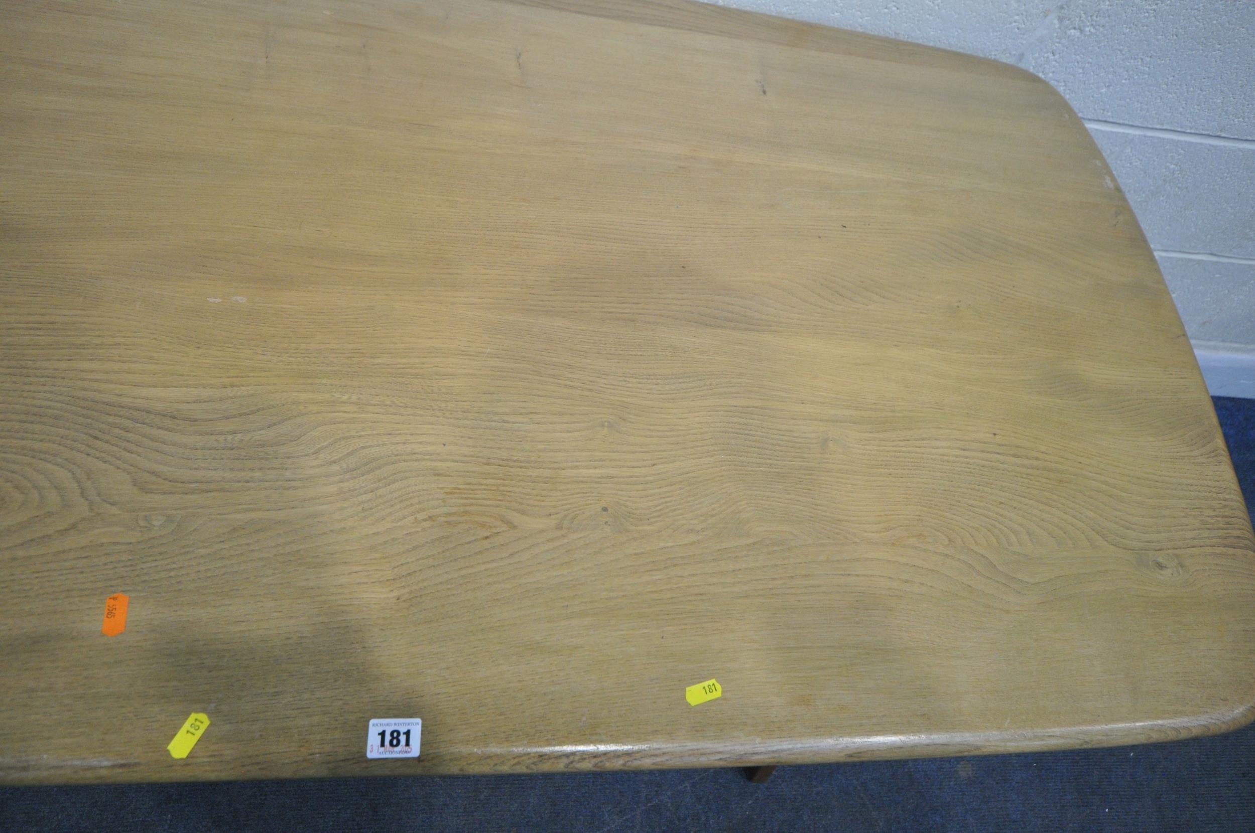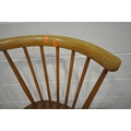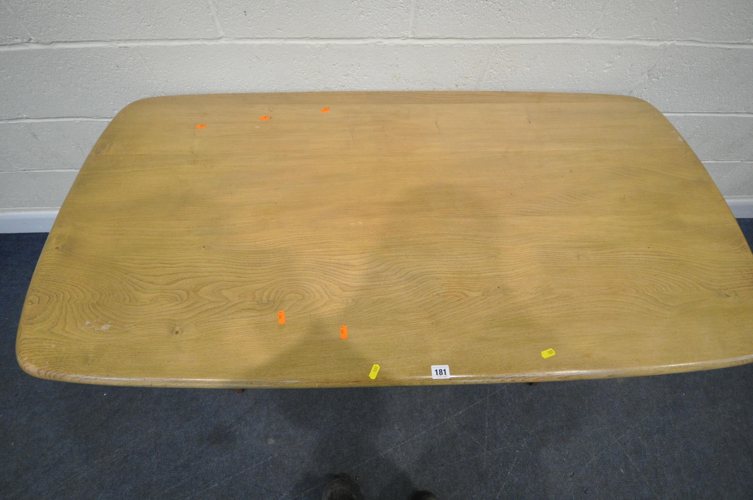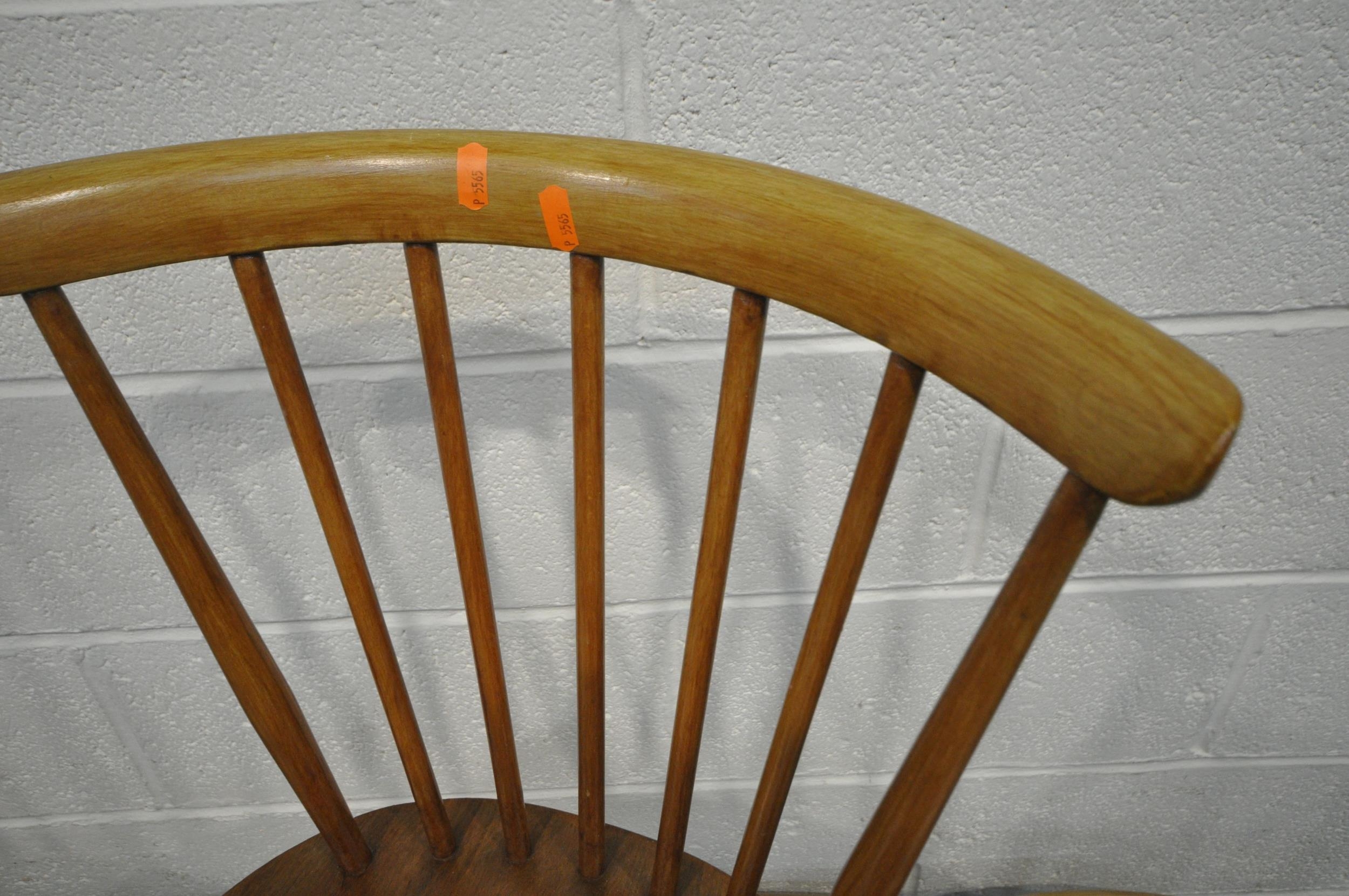 LUCIAN ERCOLANI, AN ERCOL MID-CENTURY ELM AND BEECH RECTANGULAR DINING TABLE, raised on square tapered legs, model 382, length 153cm x depth 77cm x height 74cm, a set of four Windsor lattice back chairs, model 306, along with a pair of model 449 chairs, condition report: all with imperfections, such as wobbly frames, marks, scuffs, stains, discolouration, other wear and usage (7)
