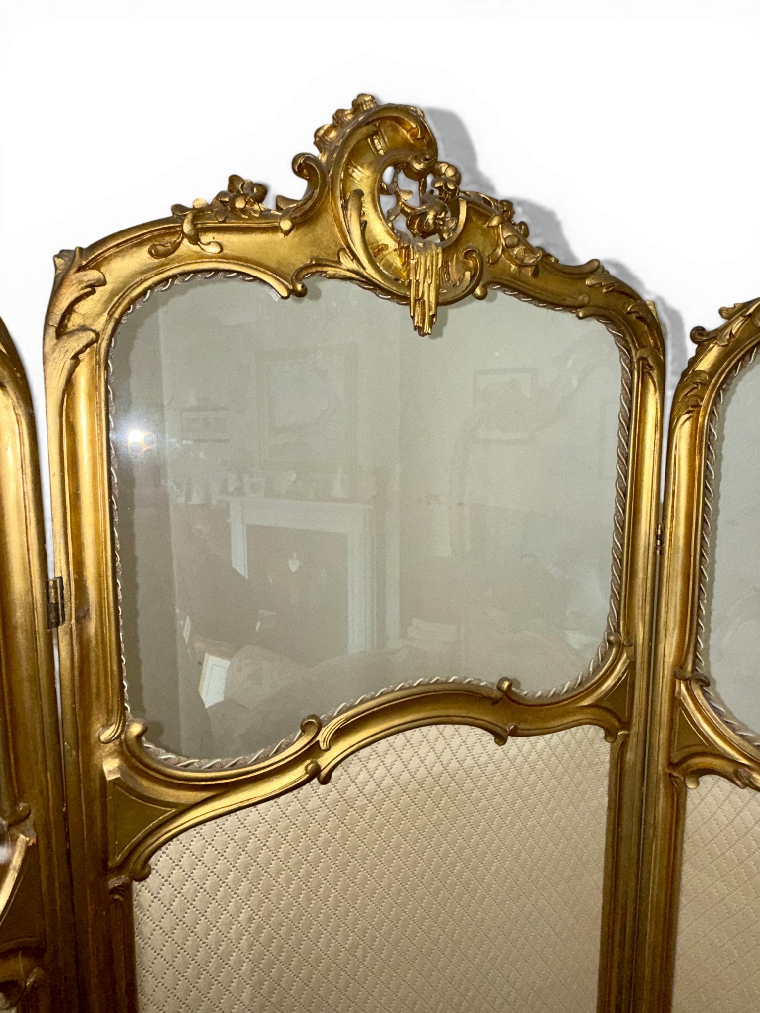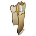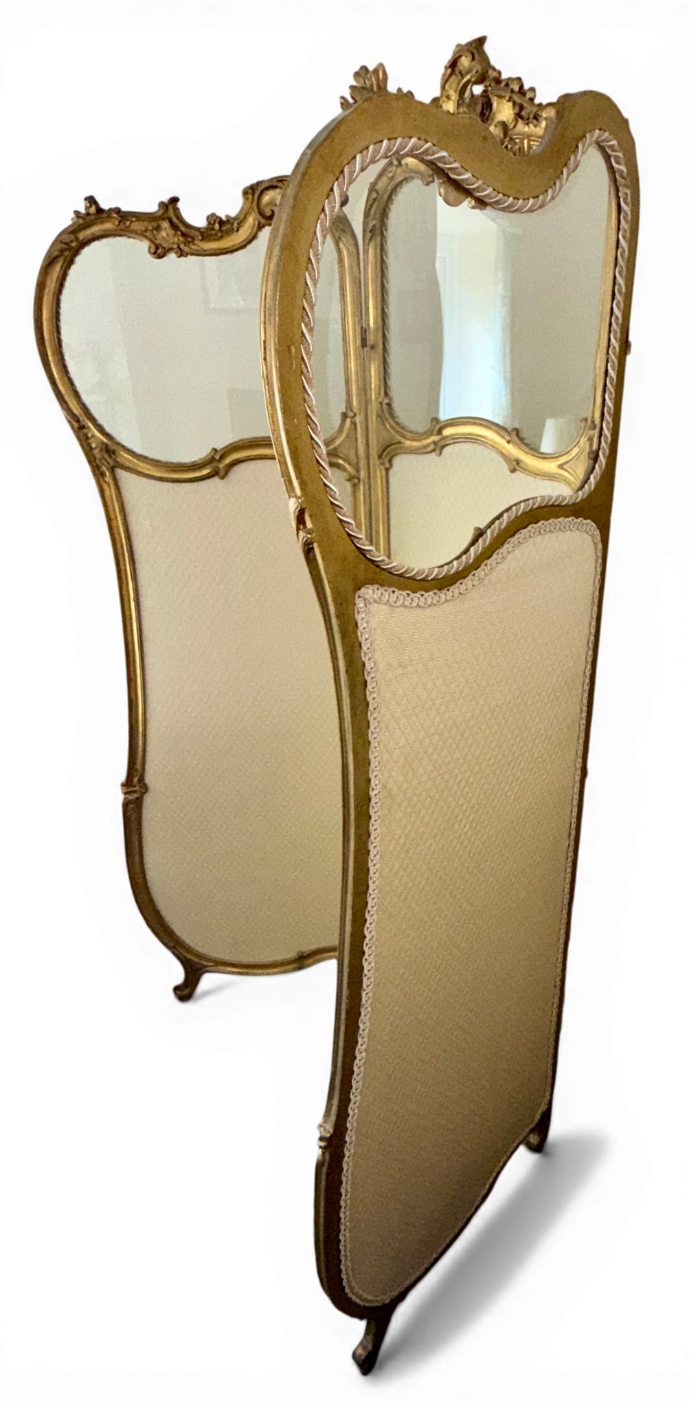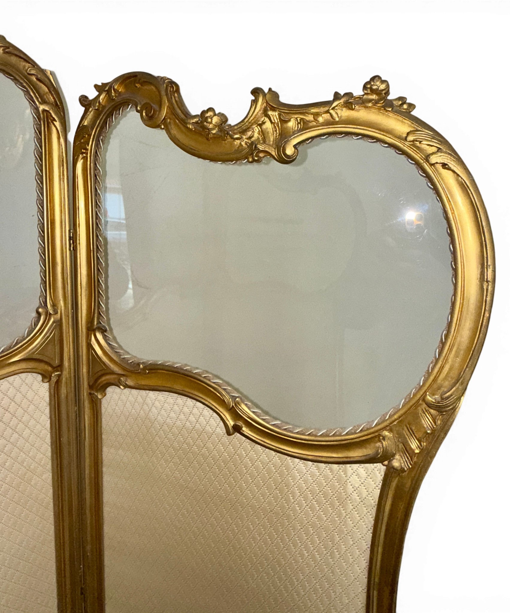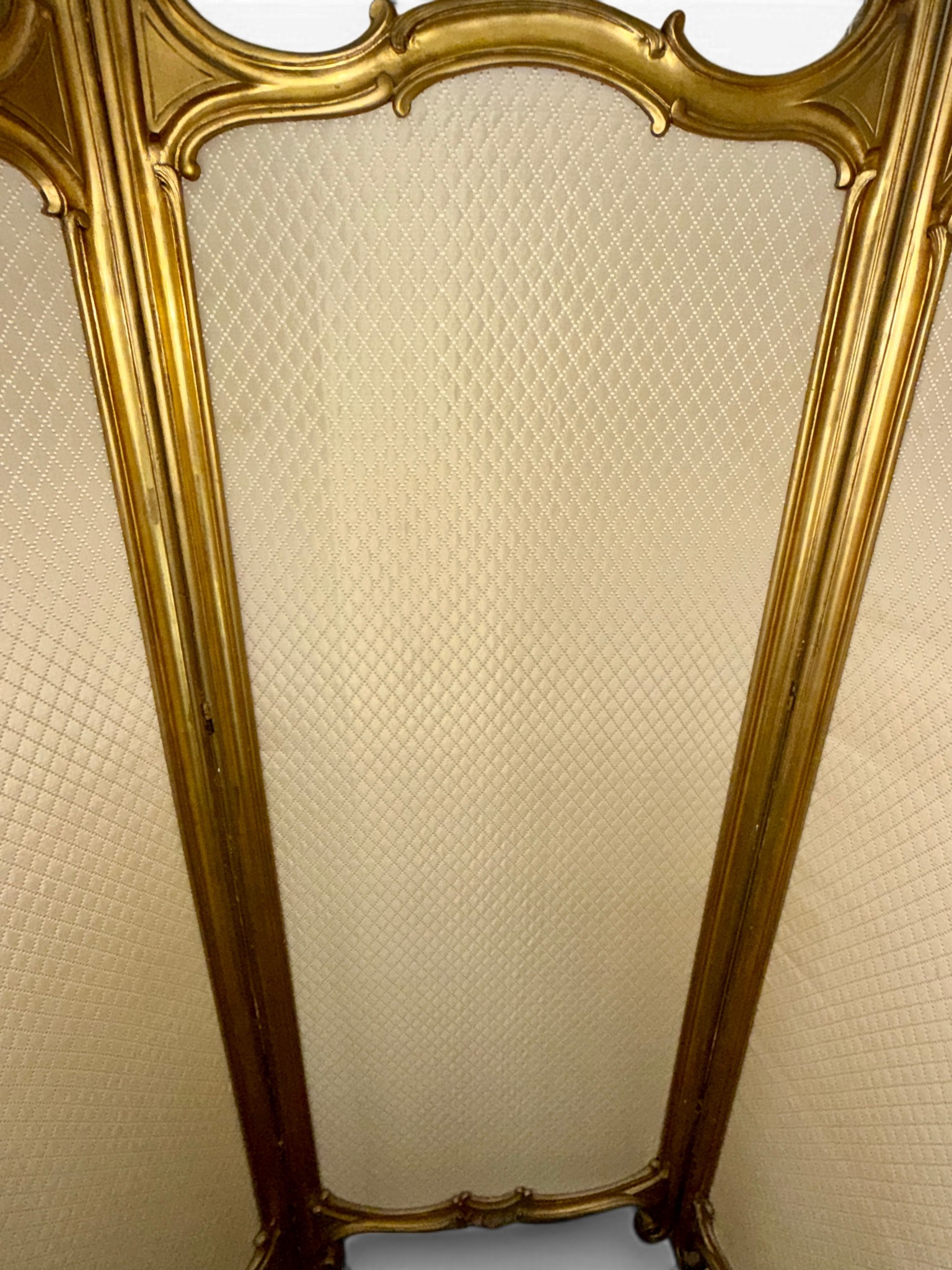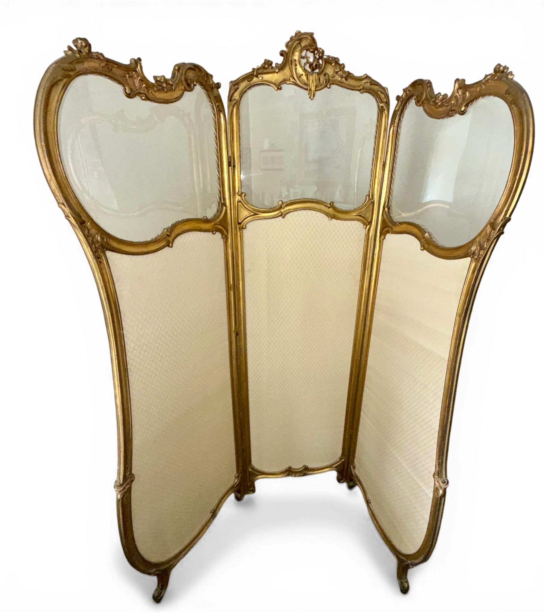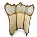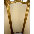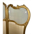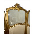 A Dutch 19thC giltwood and upholstered three fold dressing screen with glazed panels to top. Bearing Voorkant cabinet makers marks. 158cm w x 185cm h.