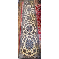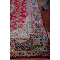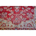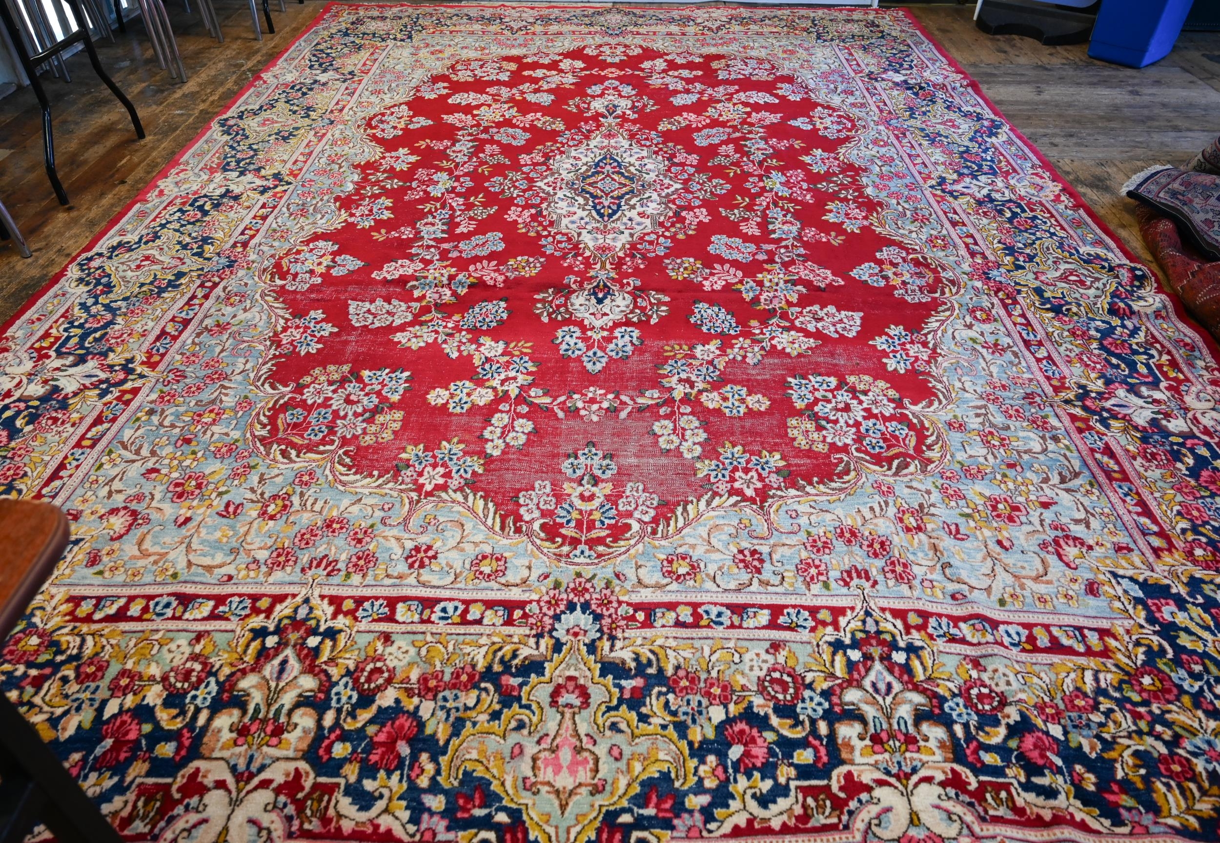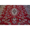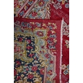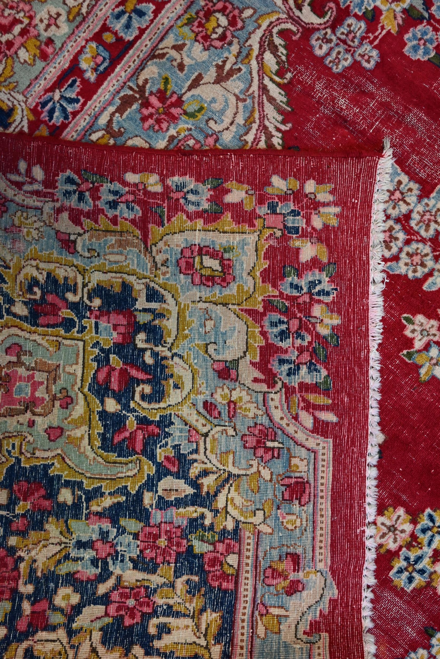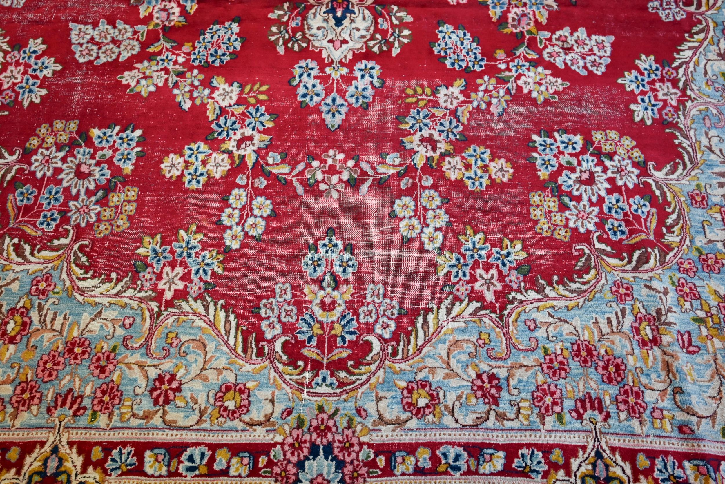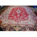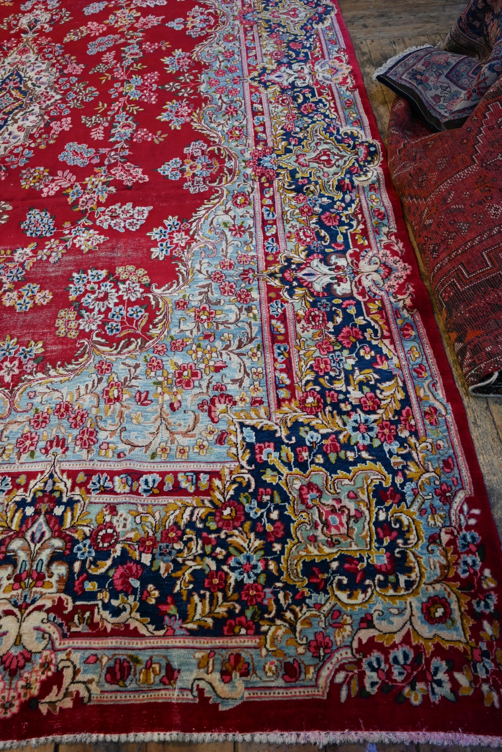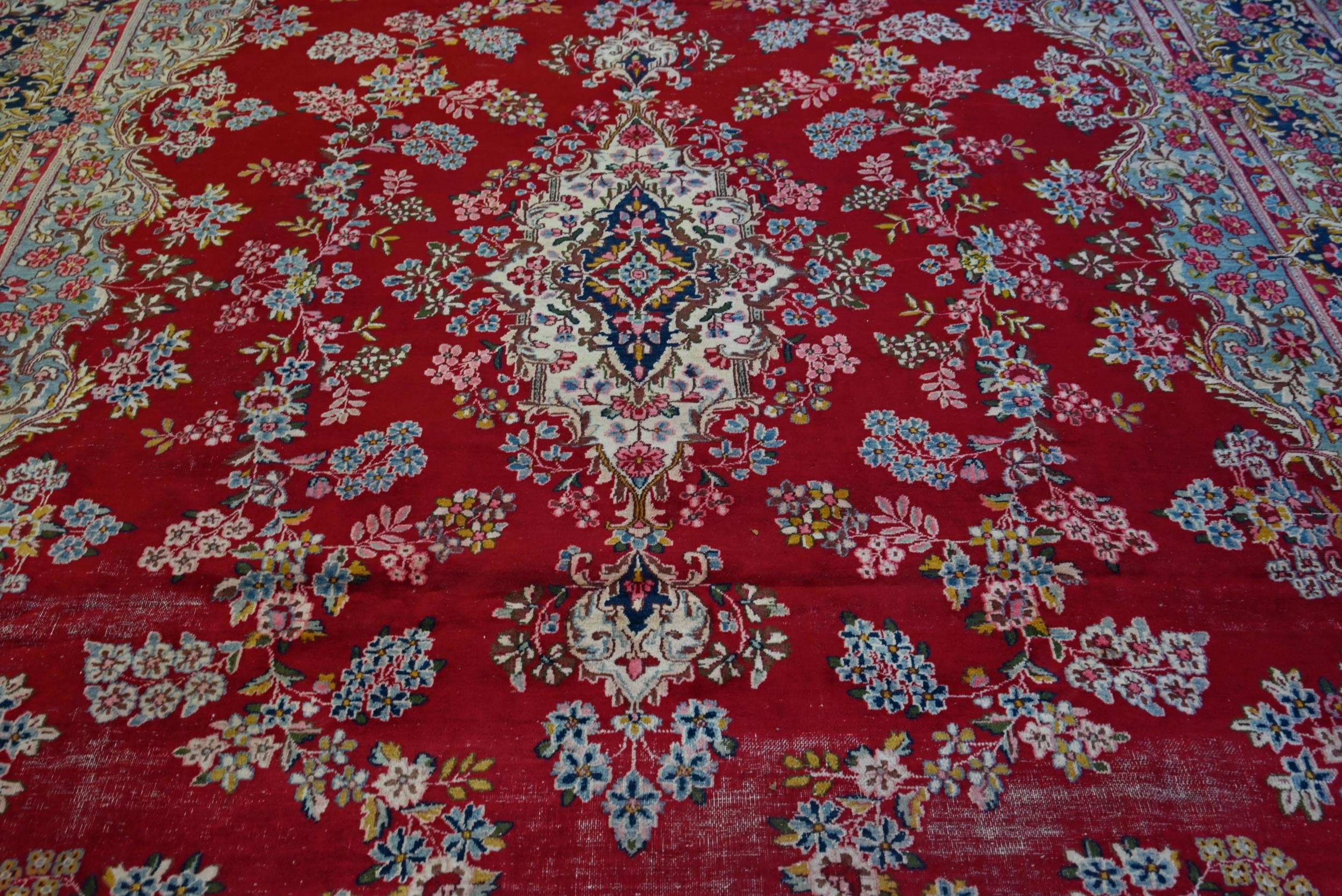 A large Persian Kerman red ground carpet with traditional floral design around the central medallion, within conforming navy blue borders, 440 cm x 300 cm