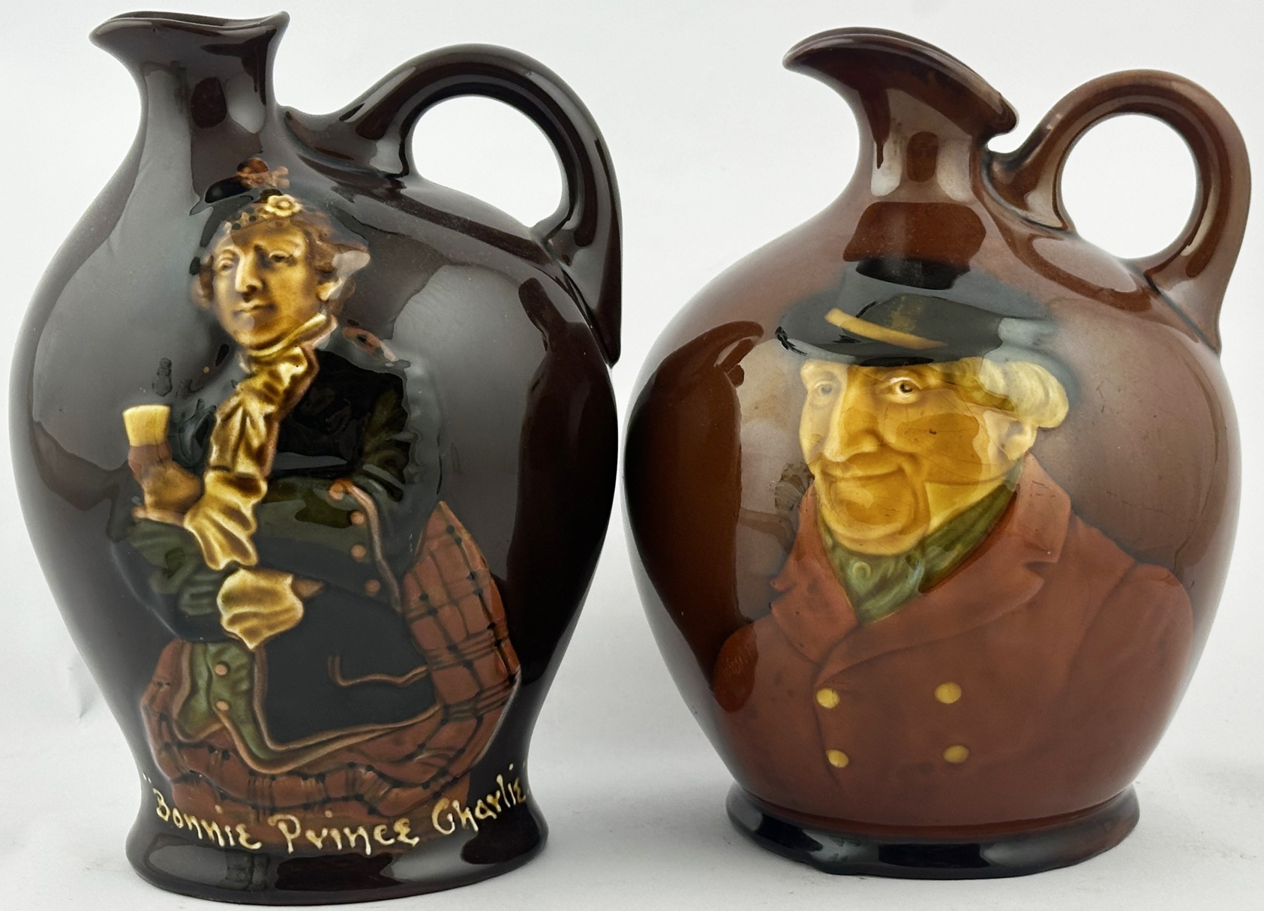 KINGSWARE FLASK DUO. Tallest 6.75ins. BONNIE PRINCE CHARLIE & SPORTING SQUIRE. Royal Doulton base p.m. (2)