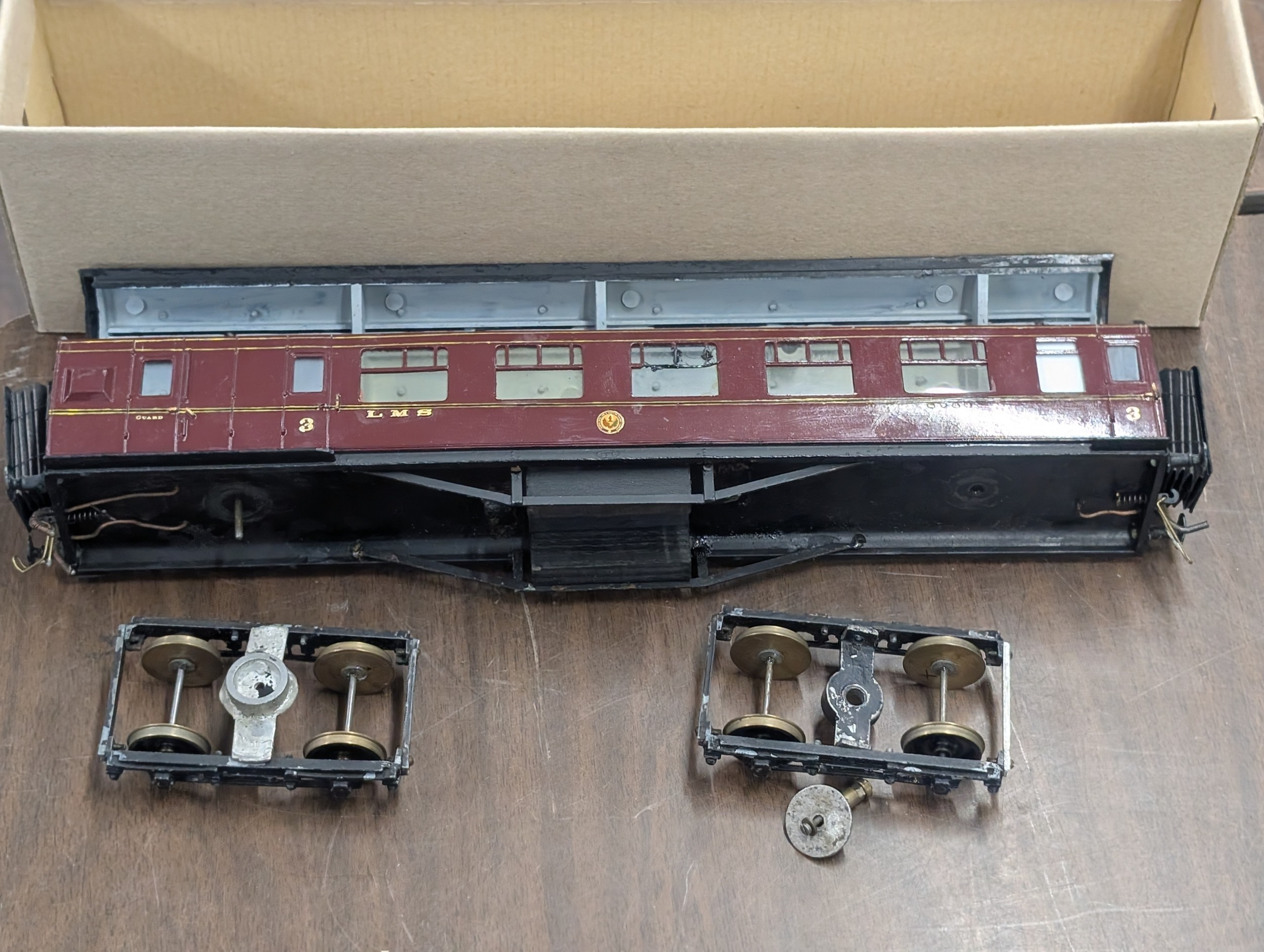 O Gauge LMS Maroon 3rd Class Corridor Brake Coach, Boxed as found