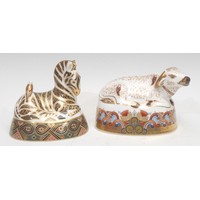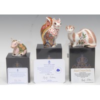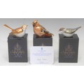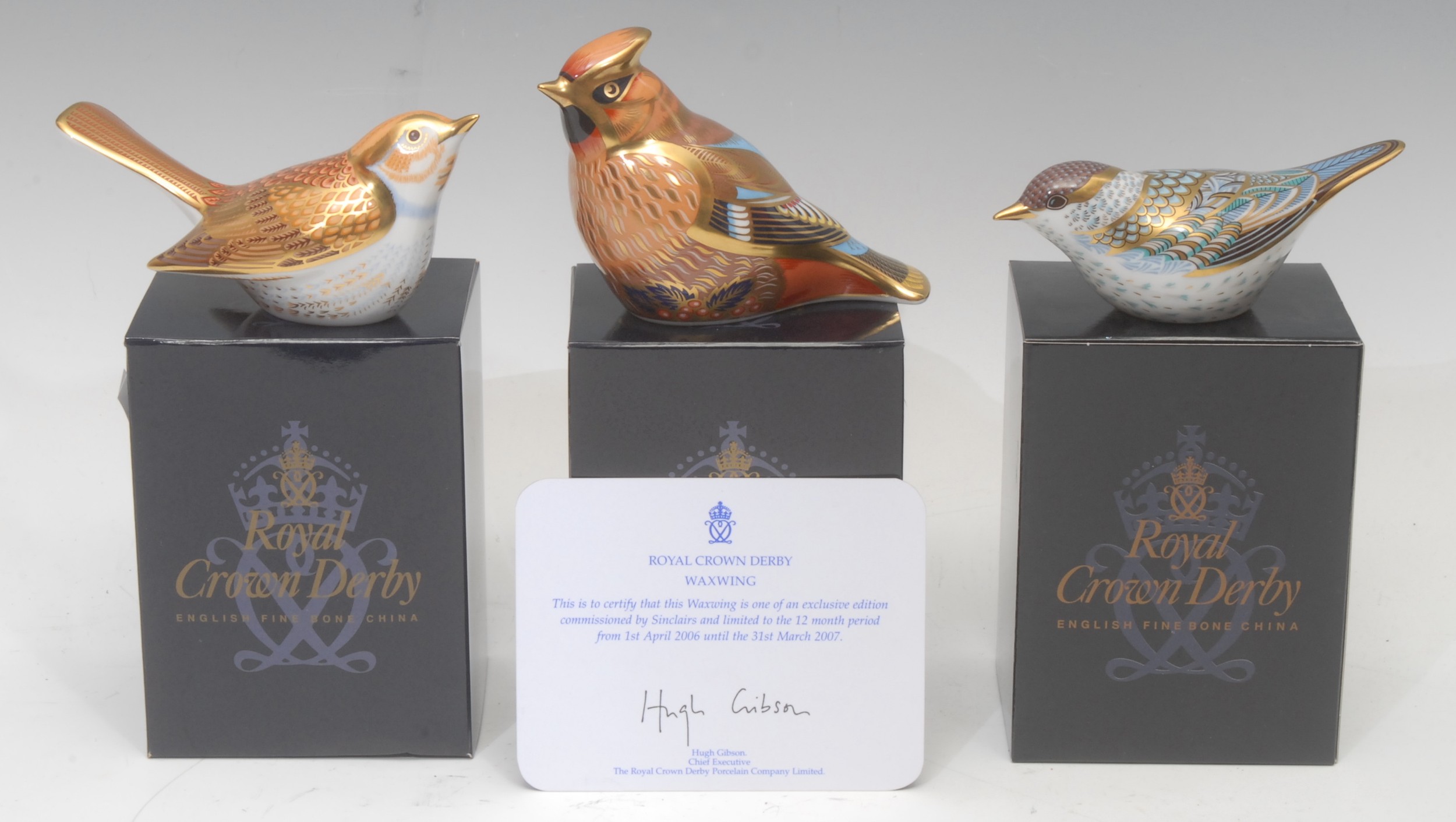 A Royal Crown Derby paperweight, Waxwing, Sinclairs exclusive limited edition for the year 2006 - 2007, gold stopper, 8.5cm high, printed mark in red, certificate, boxed; others, Nightingale, gold stopper, 13cm long, printed mark in red, signed in gold by Sue Rowe, boxed; Blackcap Warbler, gold stopper, 13cm long, printed mark, boxed (3)
