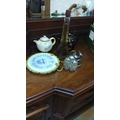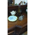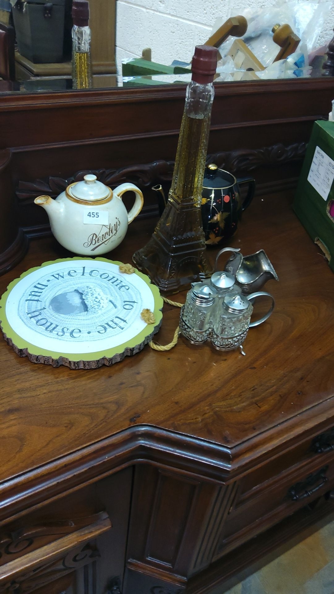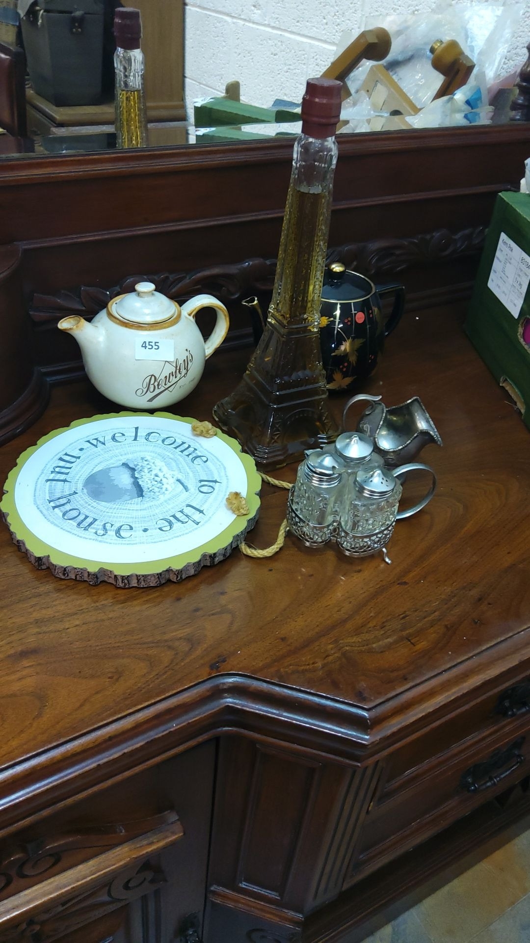 Mixed lot includes a Bewley's teapot, Eiffel Tower bottle, decorative sign, black teapot, and a set of vintage-style salt and pepper shakers.
