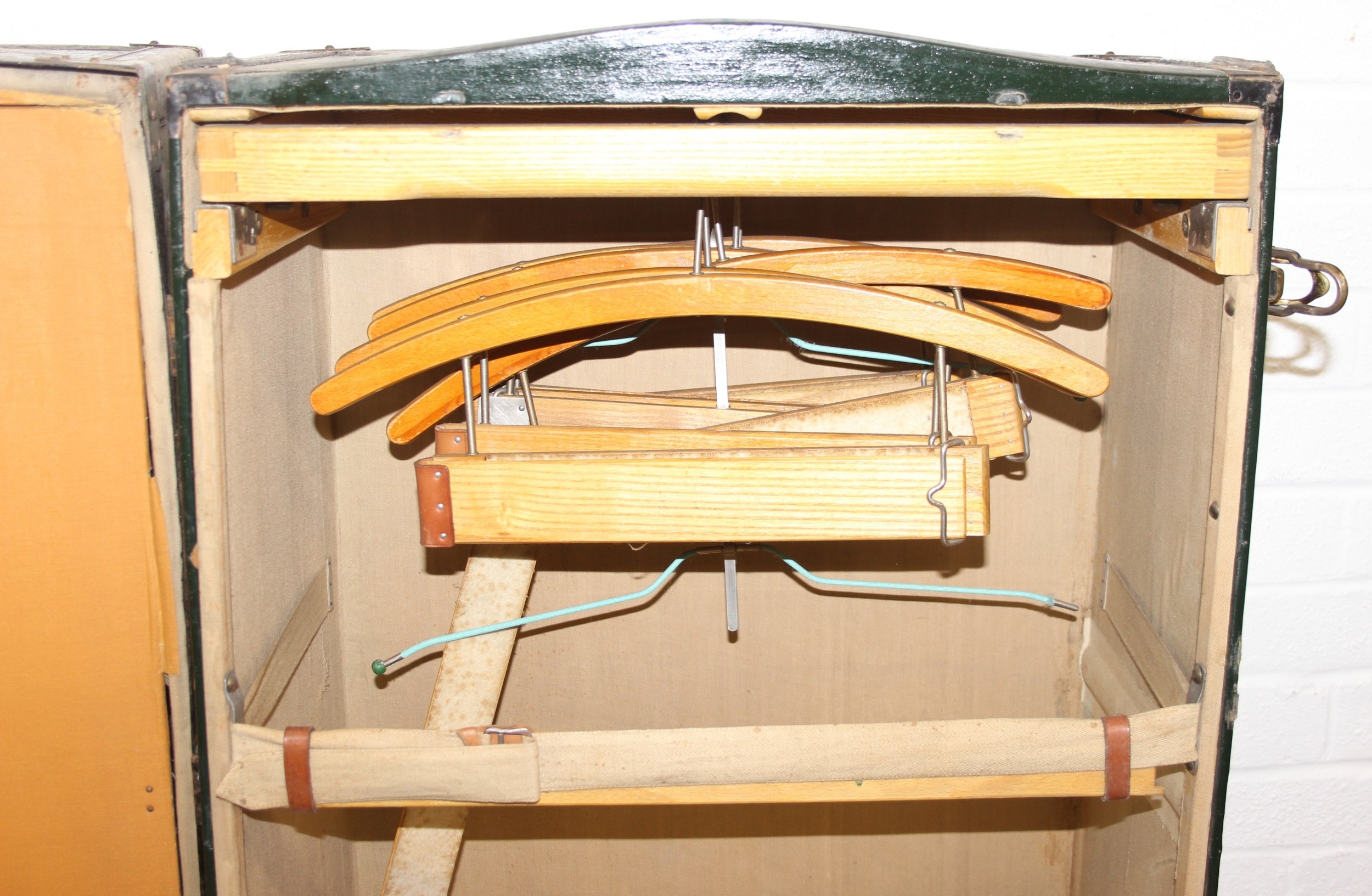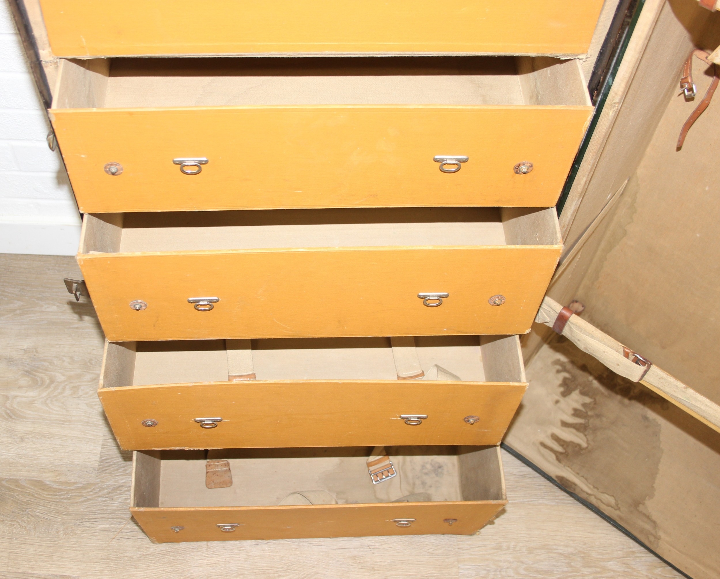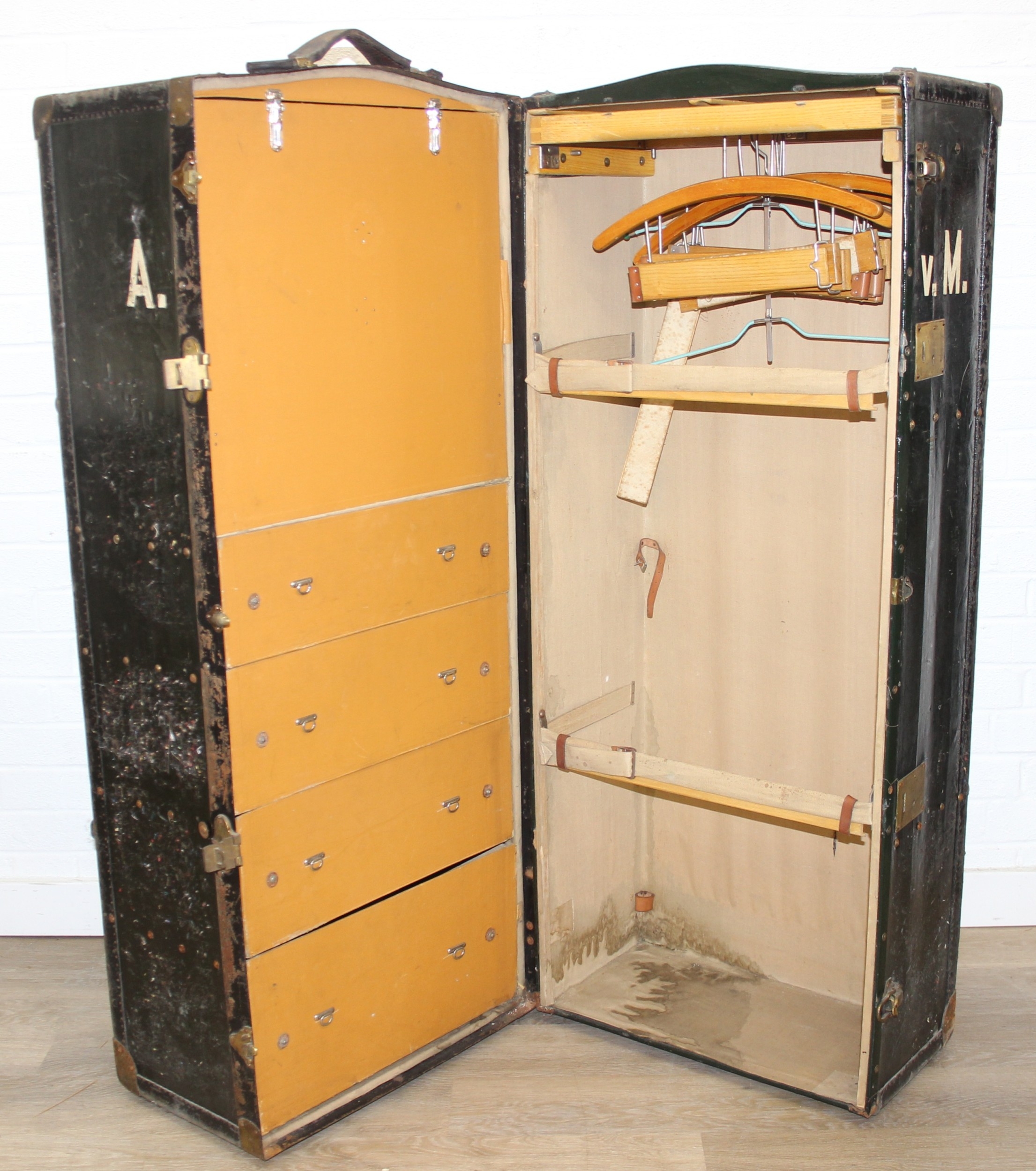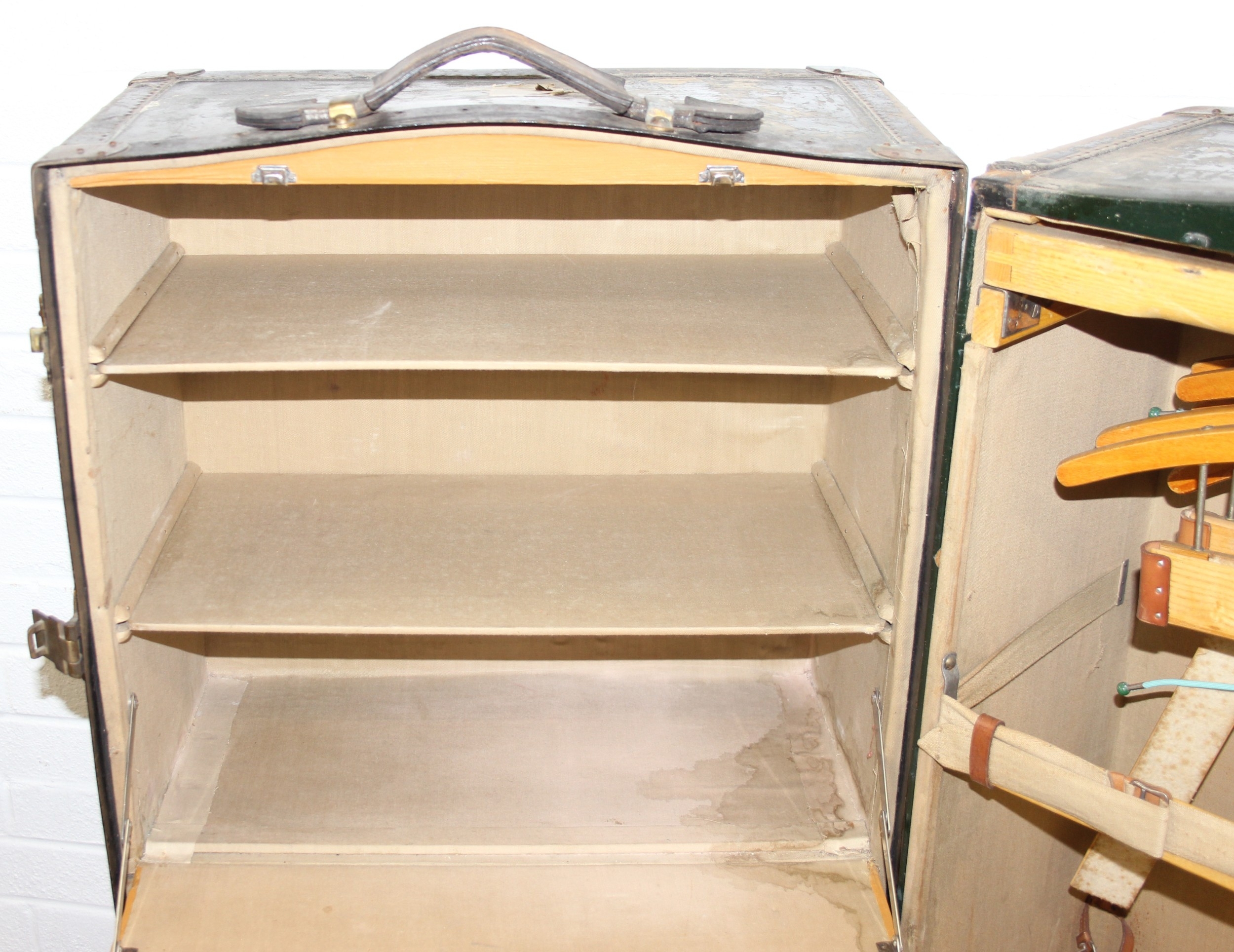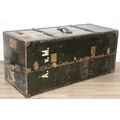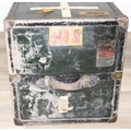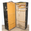 Campaign wardrobe trunk with various travel stickers, approx 60cm x 54cm x 131cm
