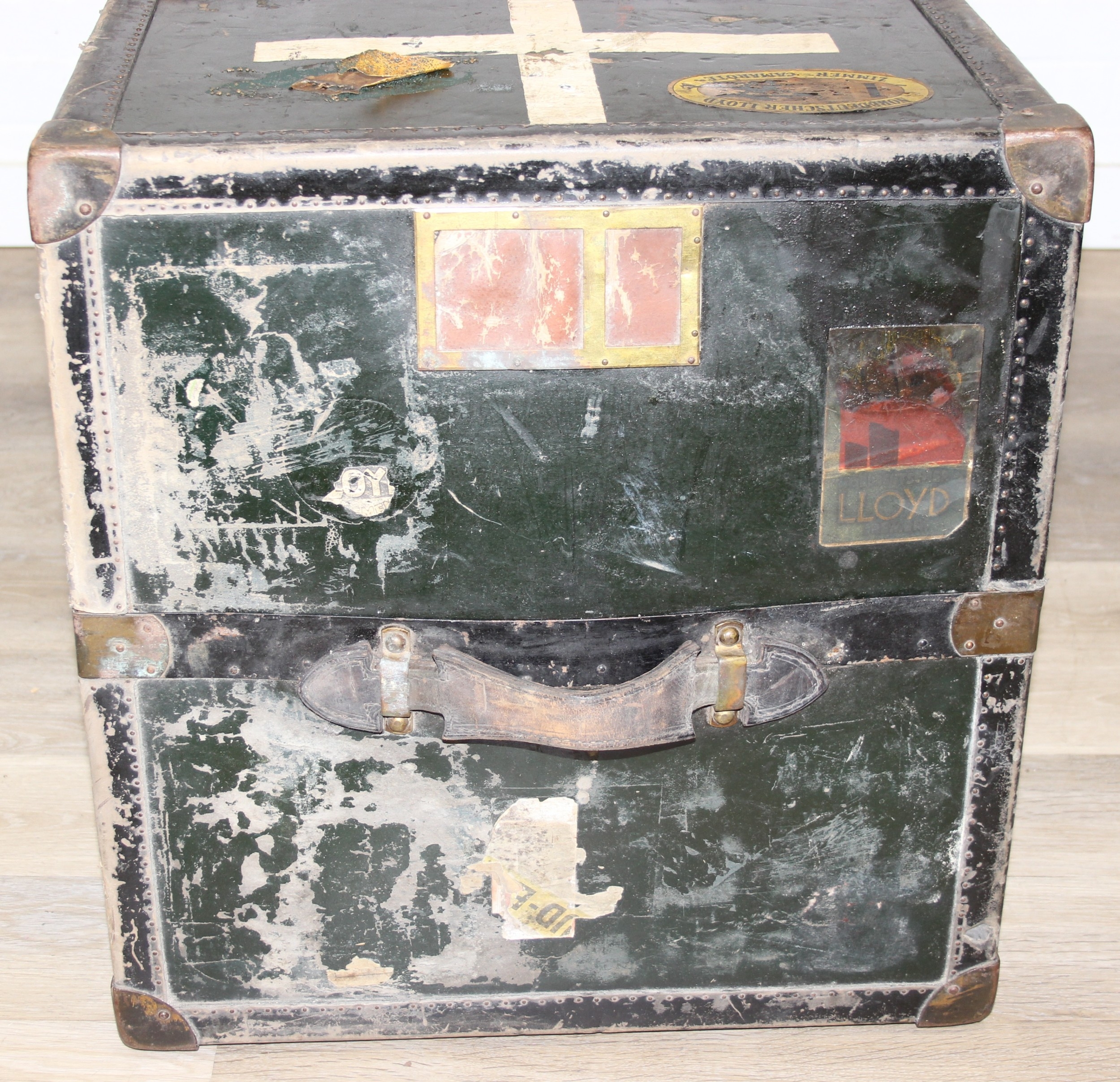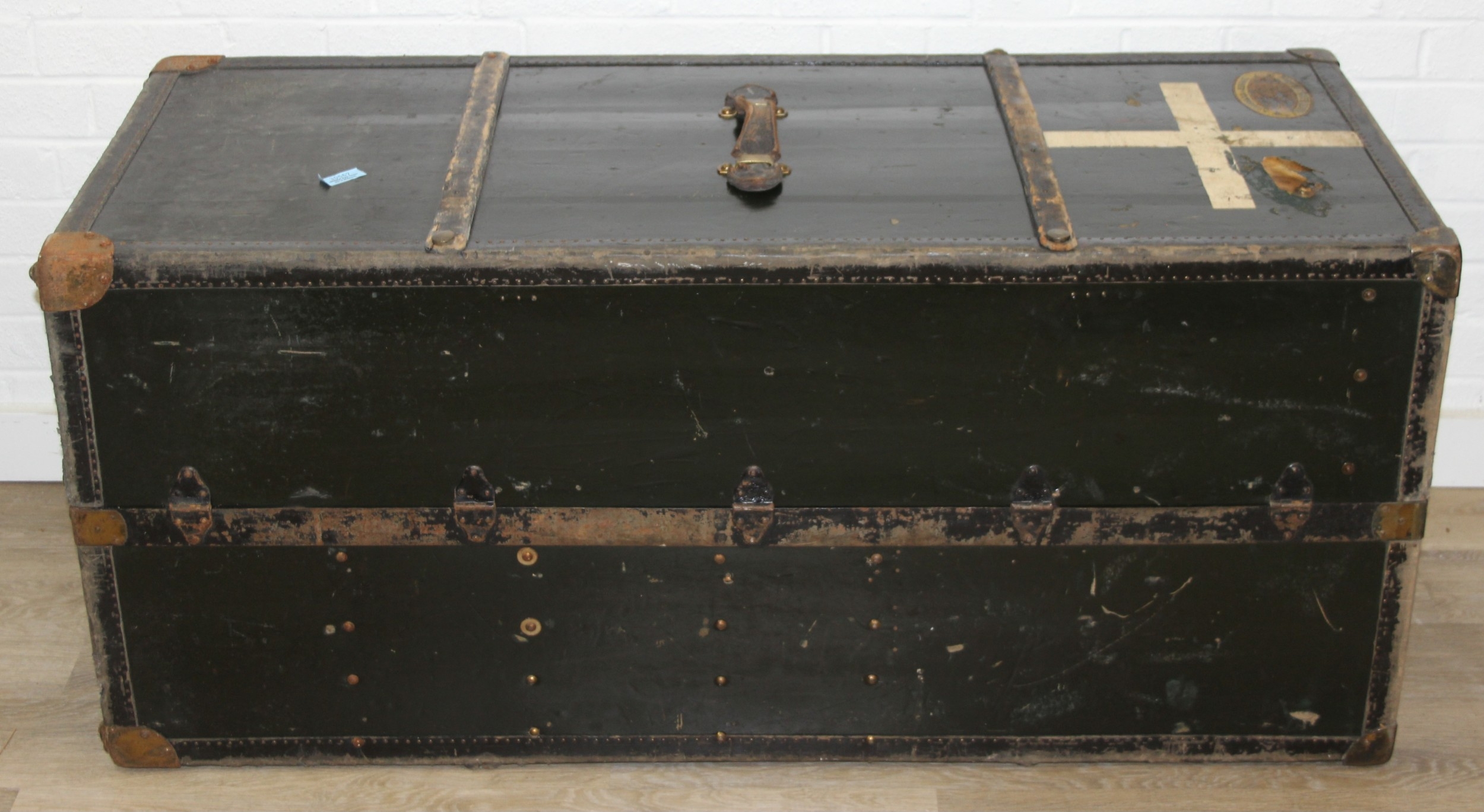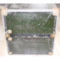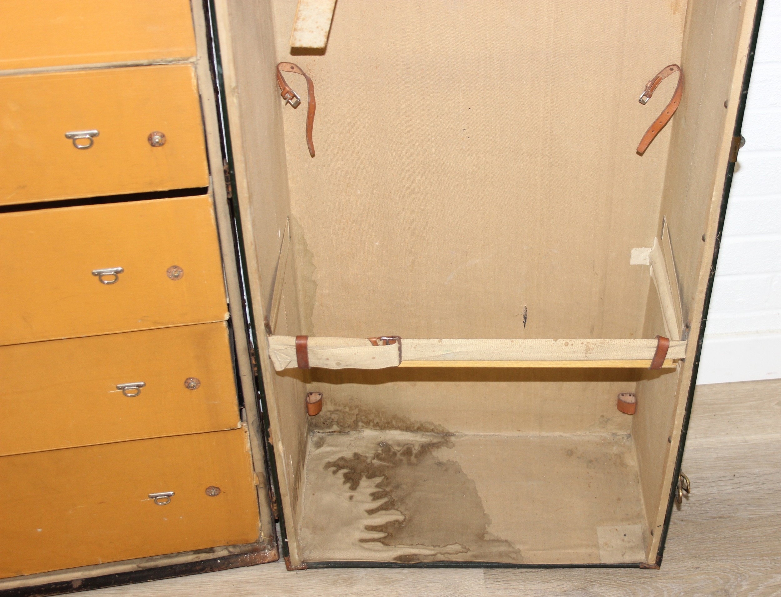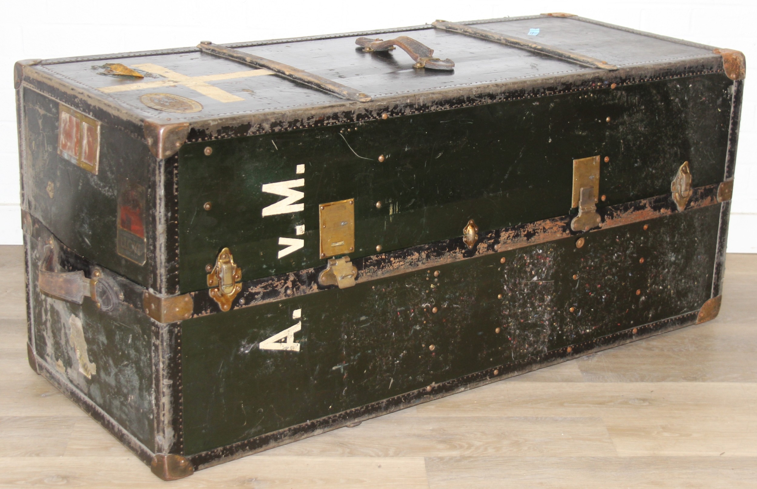 Campaign wardrobe trunk with various travel stickers, approx 60cm x 54cm x 131cm