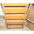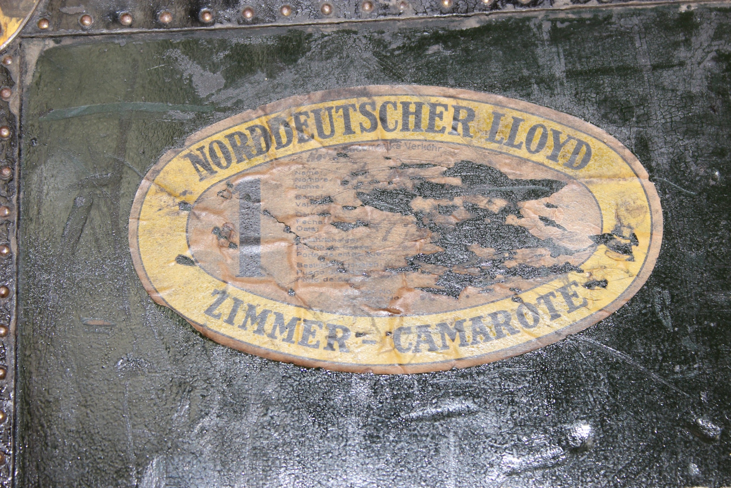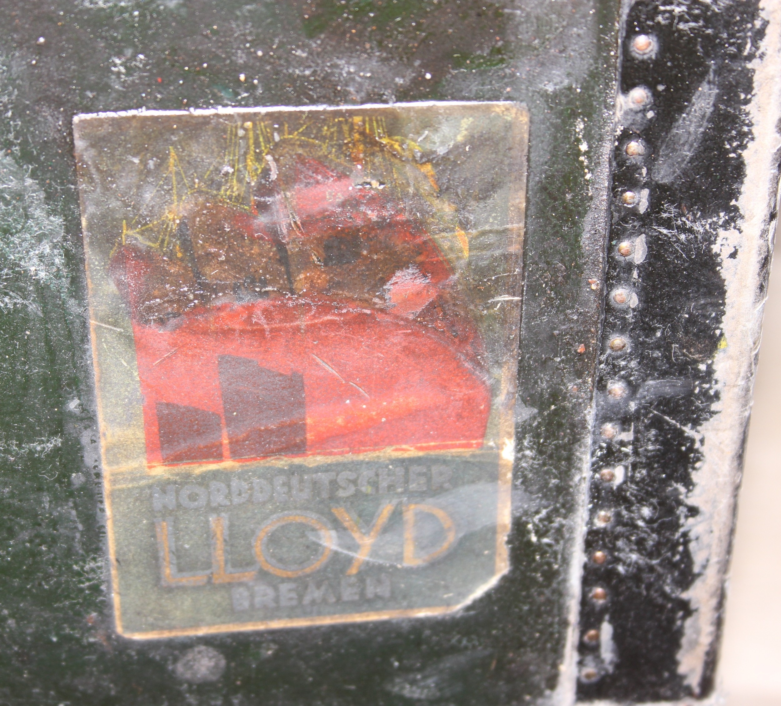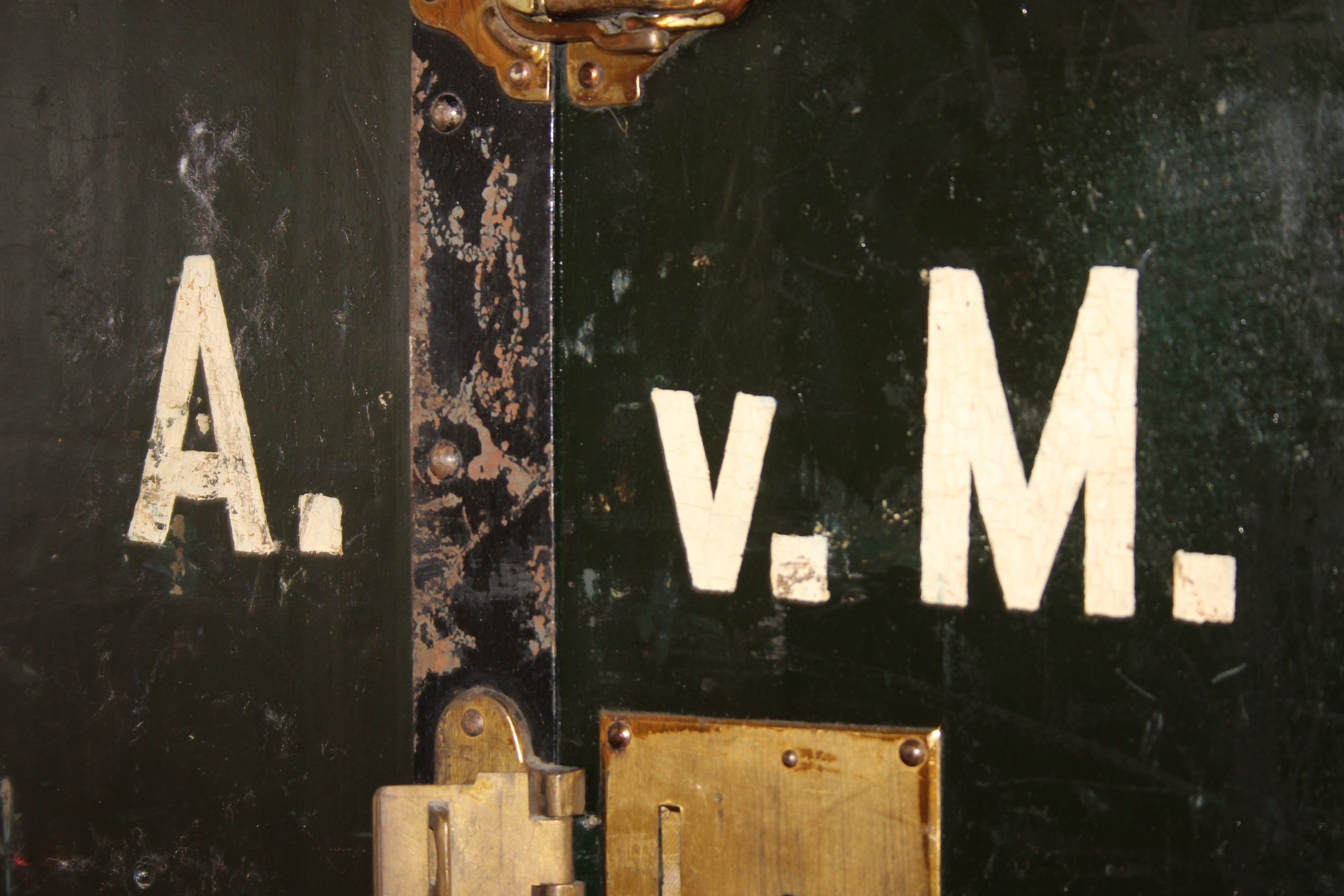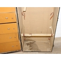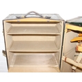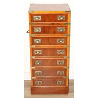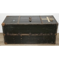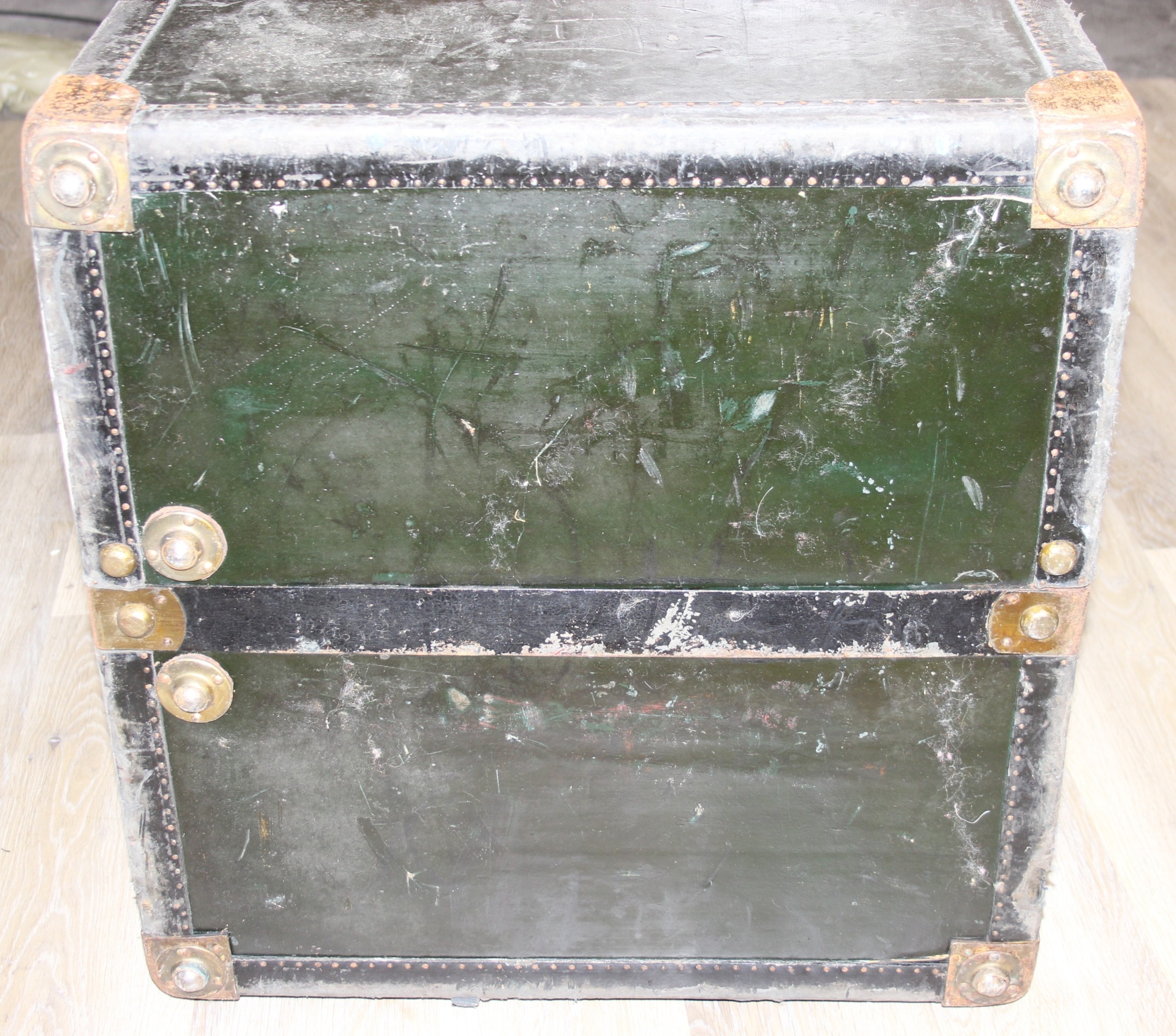 Campaign wardrobe trunk with various travel stickers, approx 60cm x 54cm x 131cm