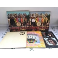 Five Beatles LPs comprising two coloured vinyl pressings of Sgt Pepper, a French white vinyl pressing of the White Album and others.