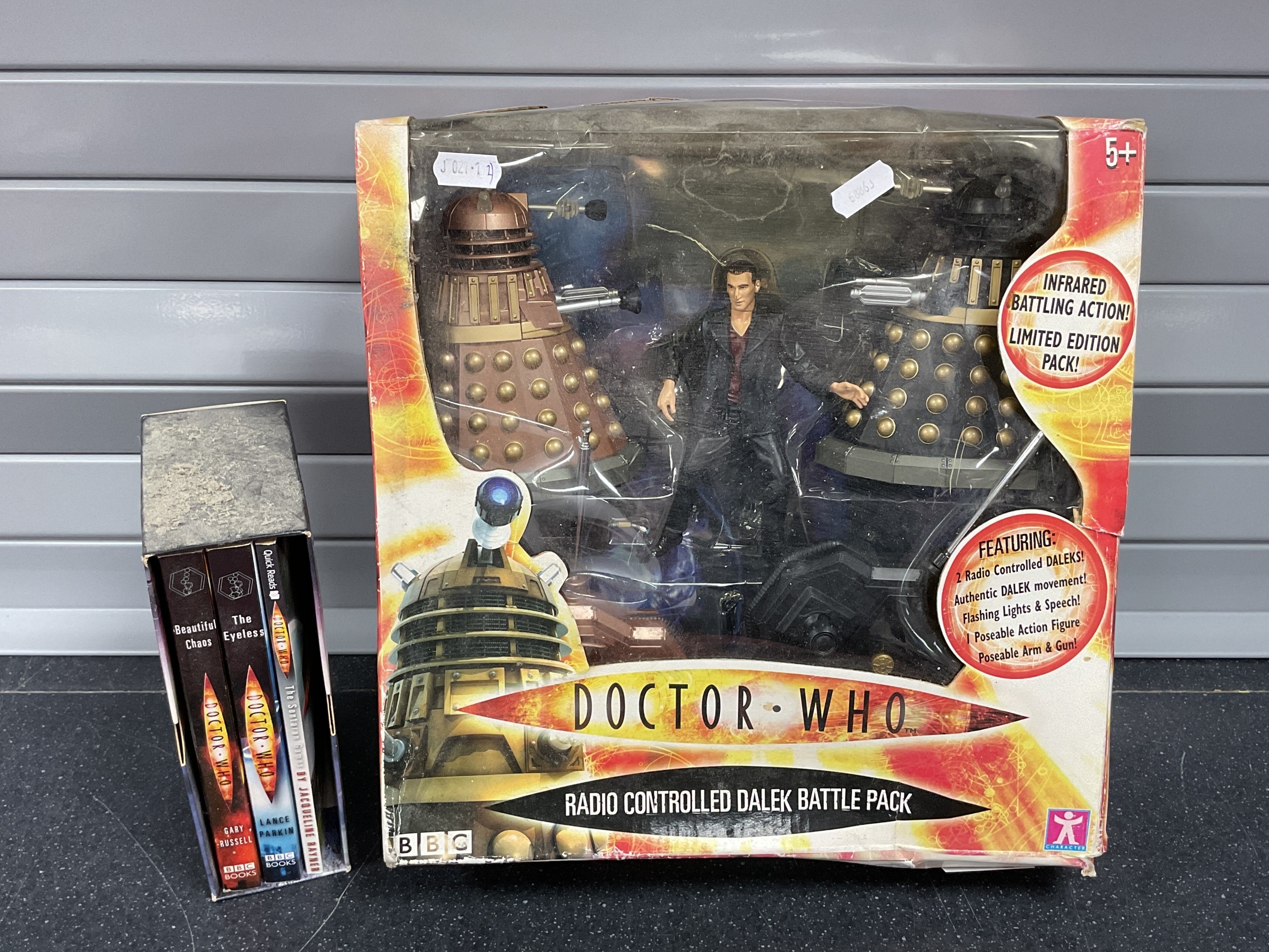 A Character Doctor Who Radio Controlled Dalek Battle Pack. Small parts may be missing, signs of play, untested. Crushing and damage to box. Together with three Doctor Who books.