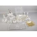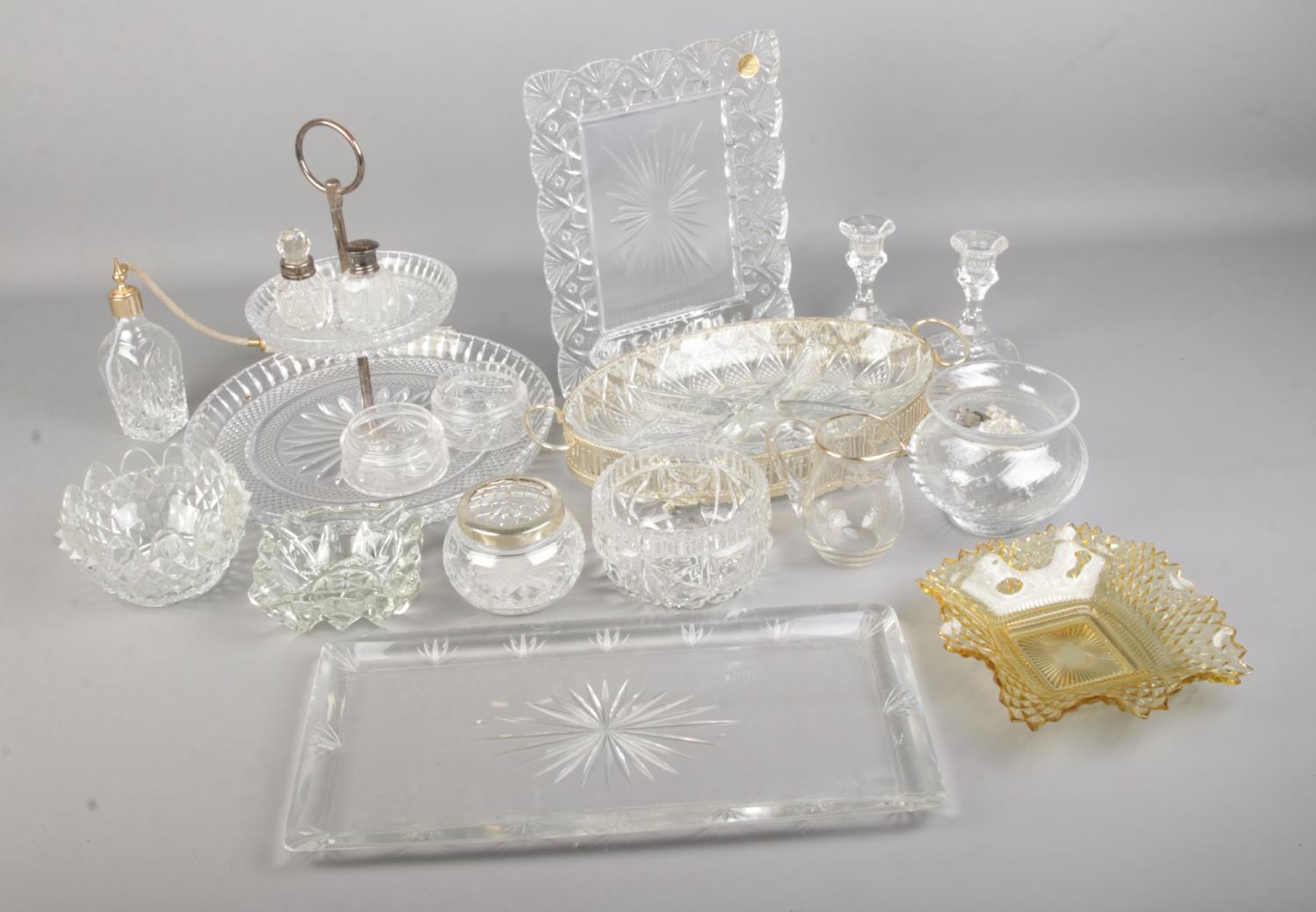 A collection of cut glass including a Cristal D'arques frame, silver topped bottles, cake stand, fruit bowl etc