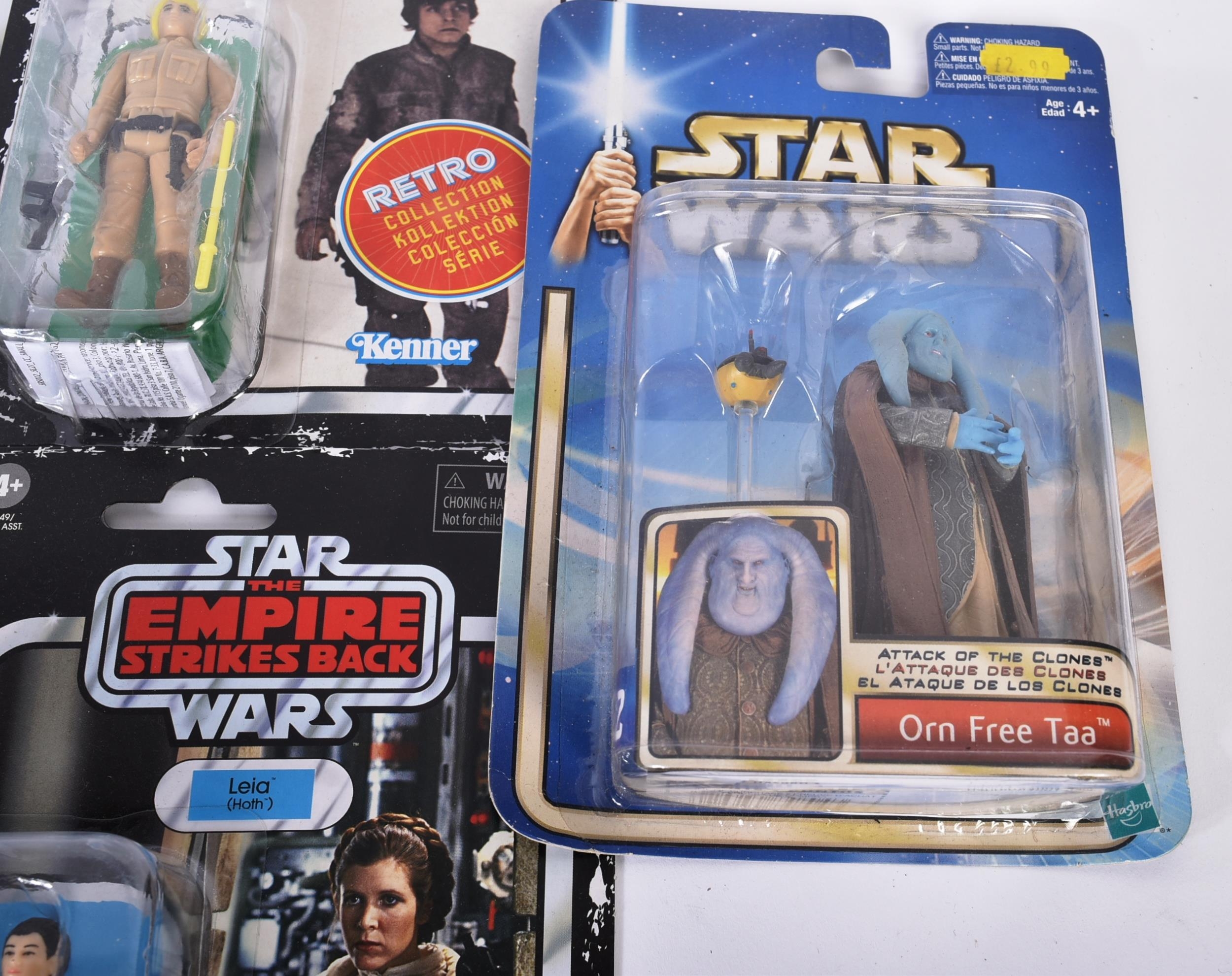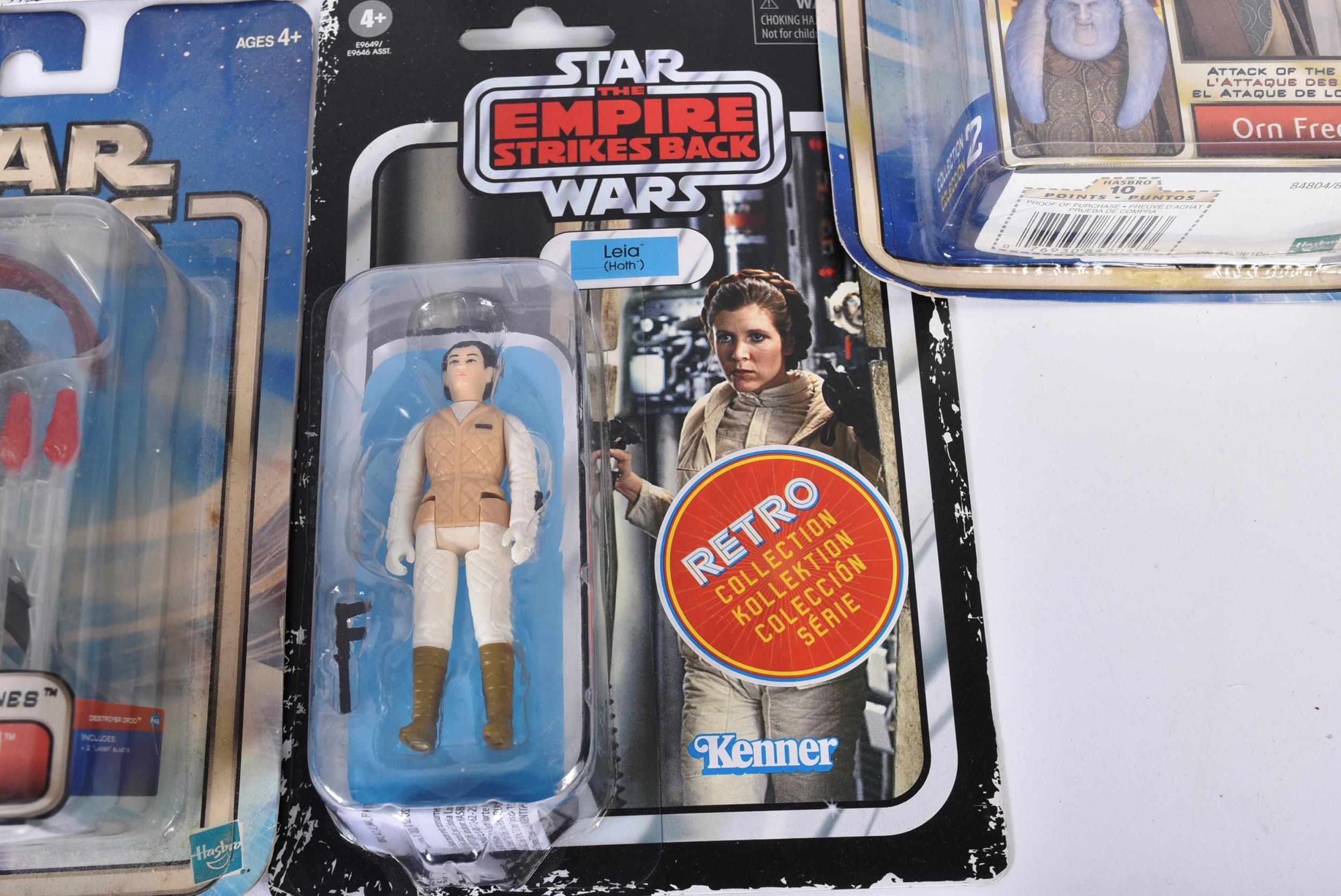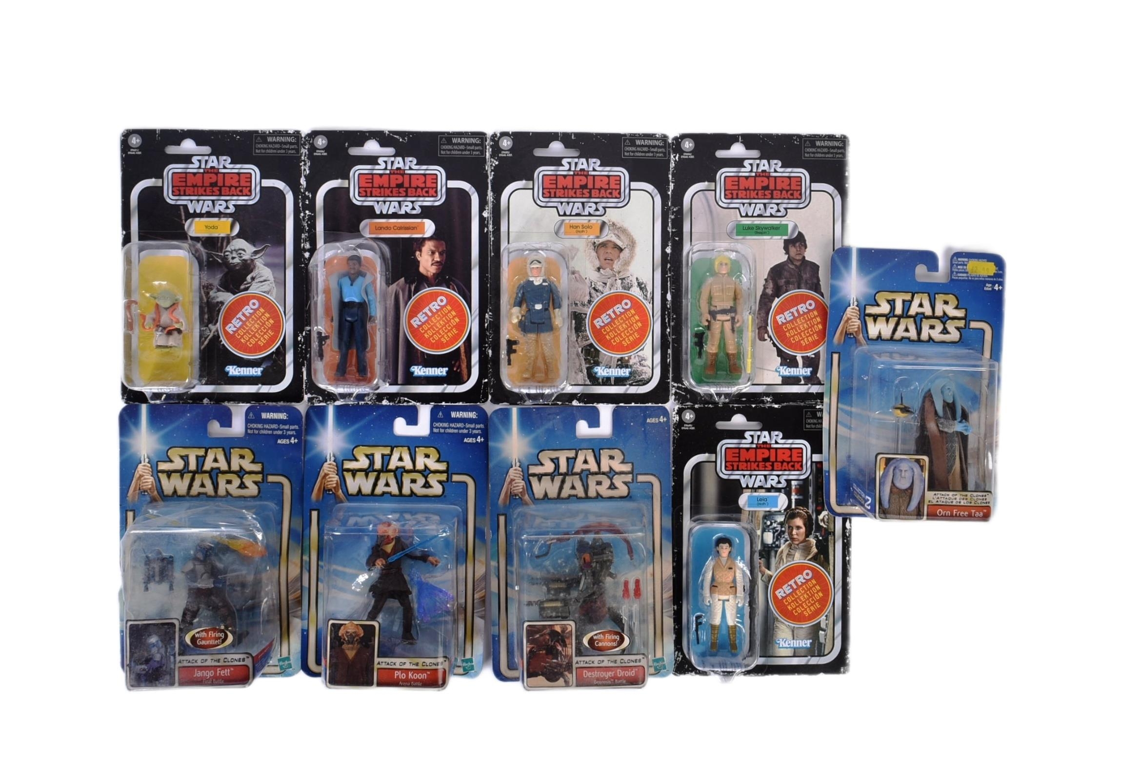 Star Wars - a collection of assorted carded Star Wars action figures to include Kenner ' Retro Collection ' (Leia Hoth, Luke Bespin, Lando, Han Solo Hoth and Yoda) and x4 Hasbro Attack Of The Clones (Jango Fett, Plo Koon, Destroyer Droid and Orn Free Taa). Contents sealed.