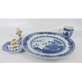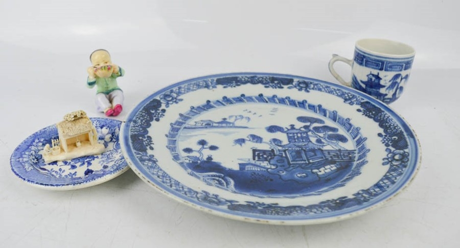 A group of blue and white 19th century ceramics, a Royal Doulton Chinese boy, and small carving.