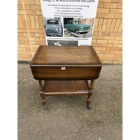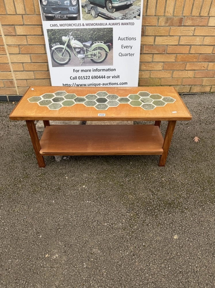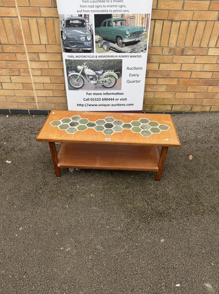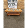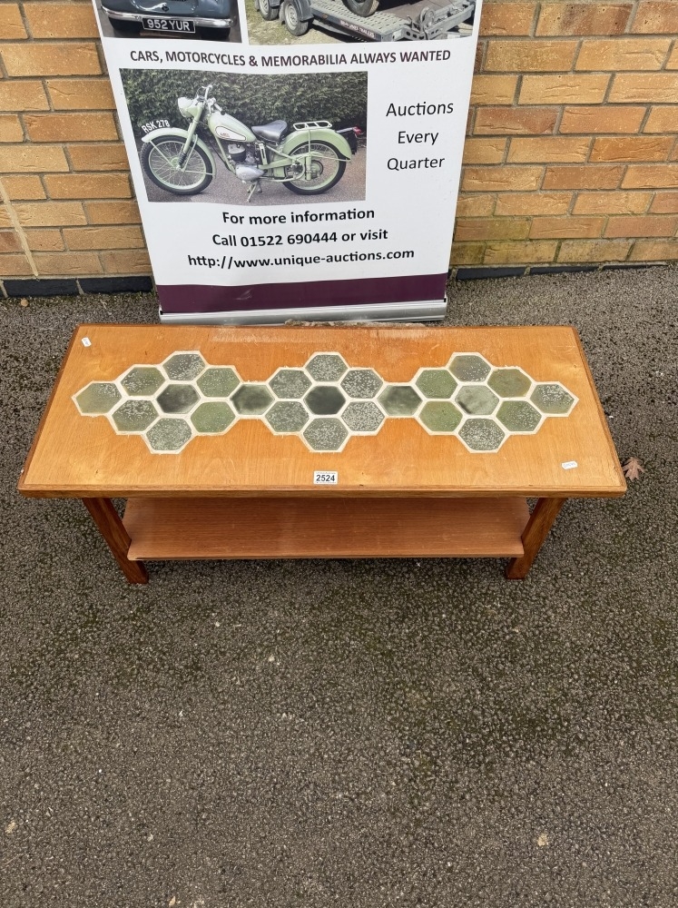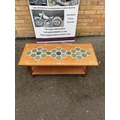 A mid-century coffee table featuring a tiled top with geometric patterns and a slatted lower shelf