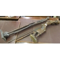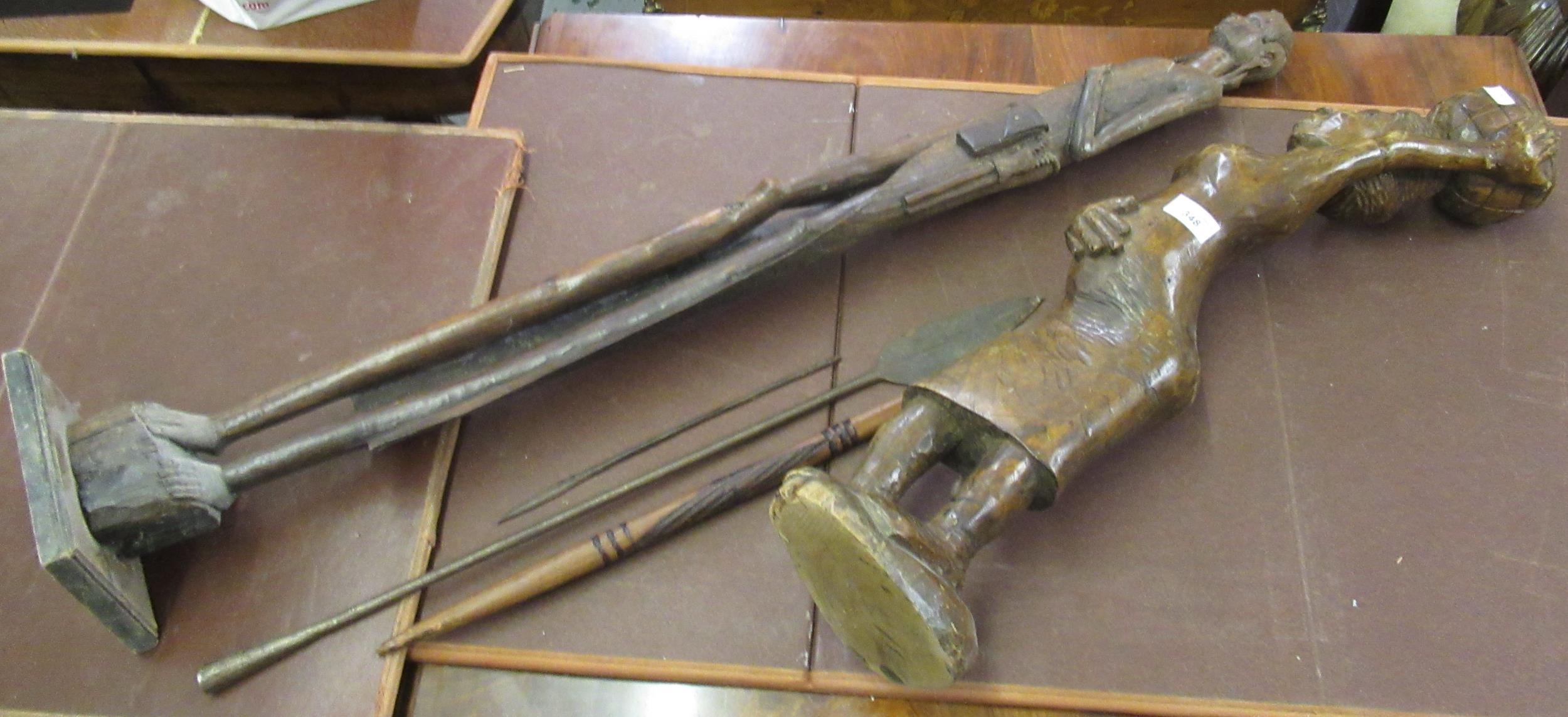 Two African native carved wooden figures, the tallest 102cm, together with an African native spear