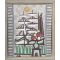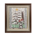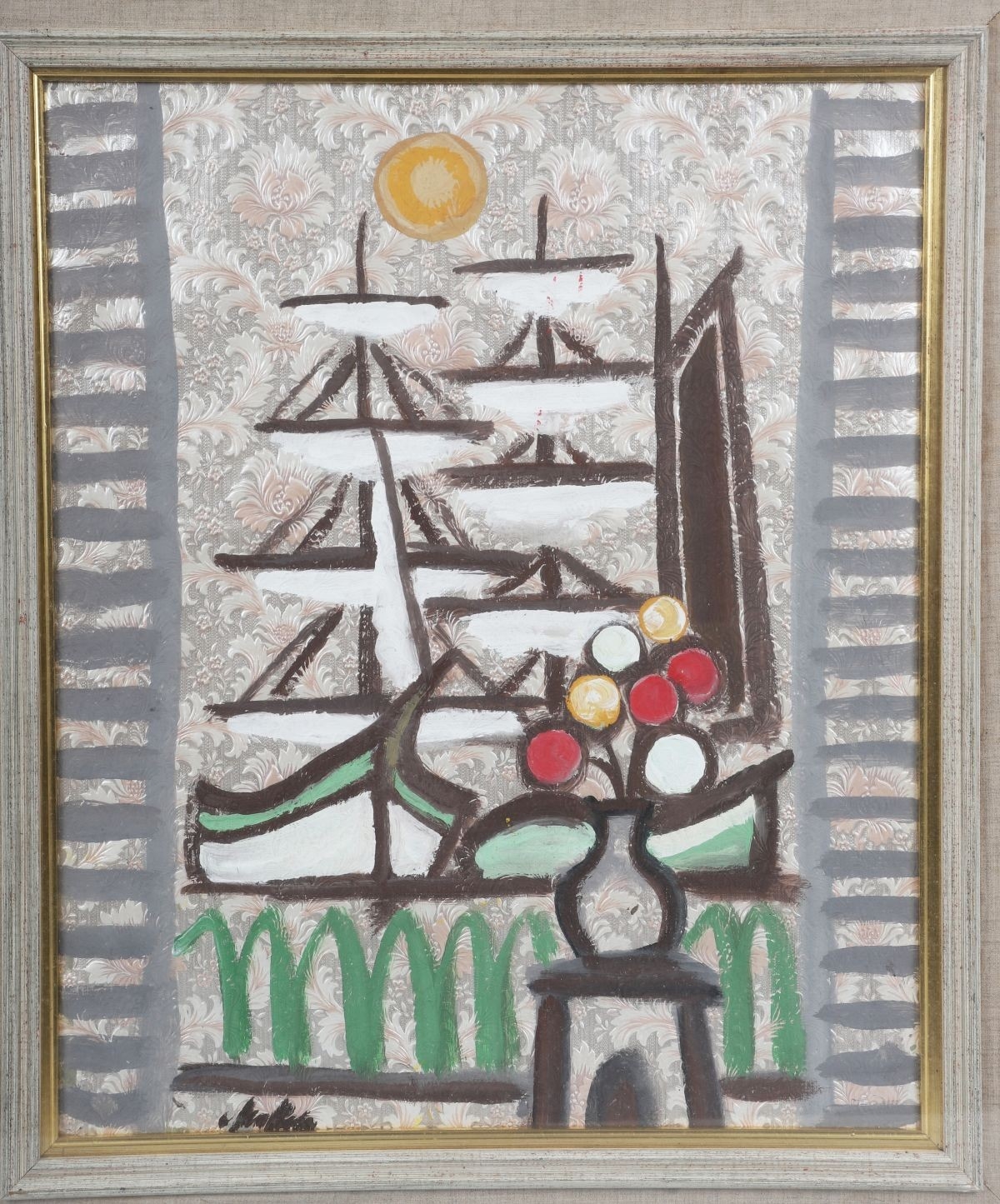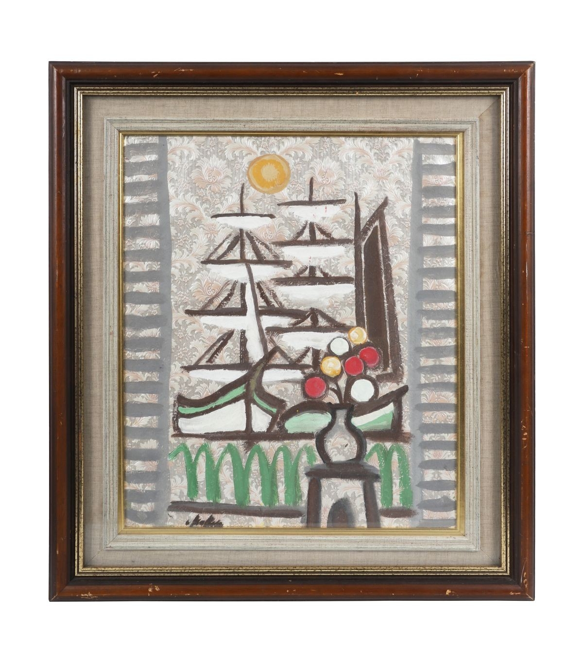 Depicting a stylised composition of a sailing ship with vase and flowers, set against a patterned ground. Executed in Robinson’s distinctive flattened modernist manner. Image: 62x 50 cm. Framed: 84 x 74 cm. PICTURES AND PRINTS Thursday 11th December 2025 19:26:48