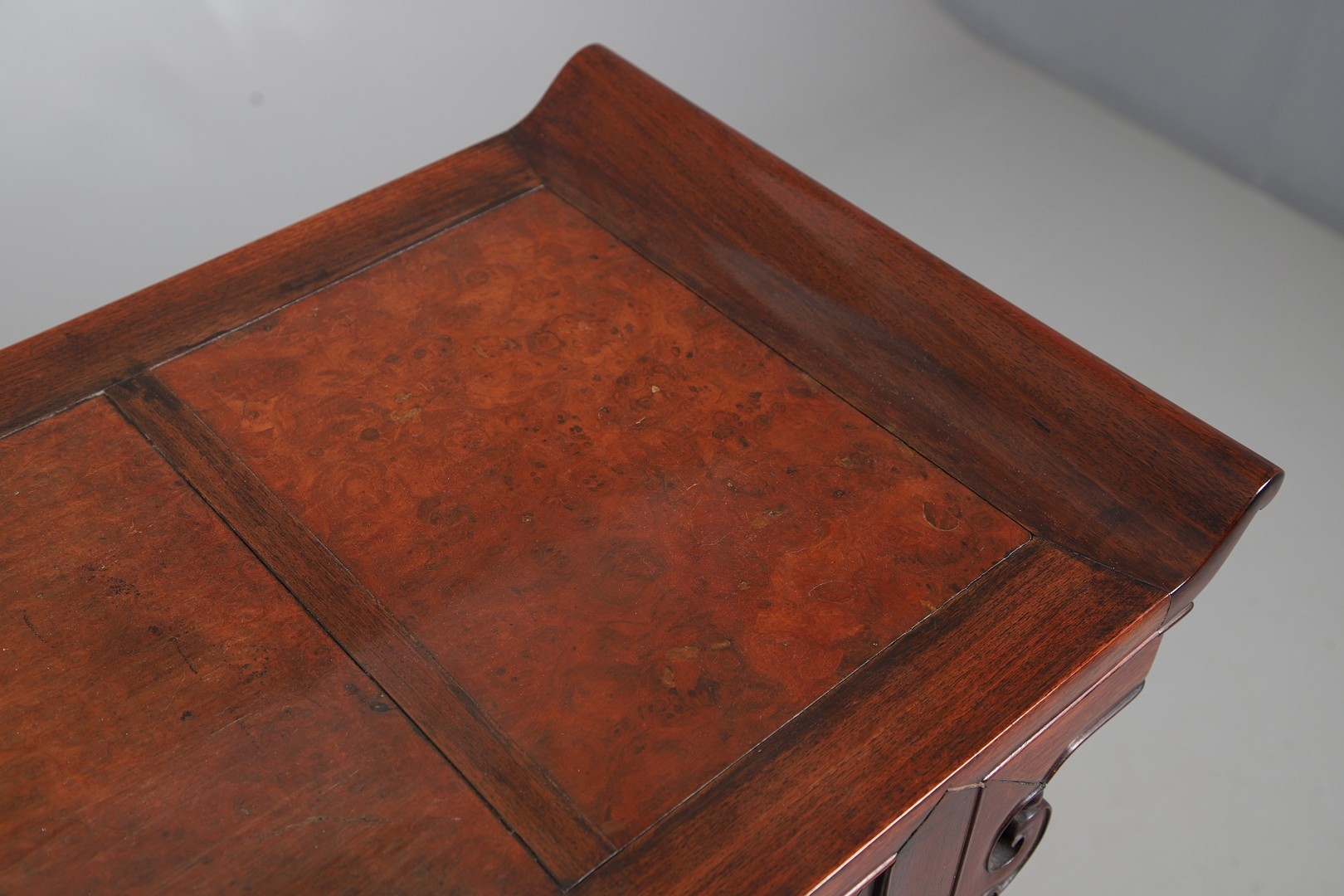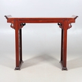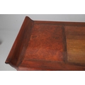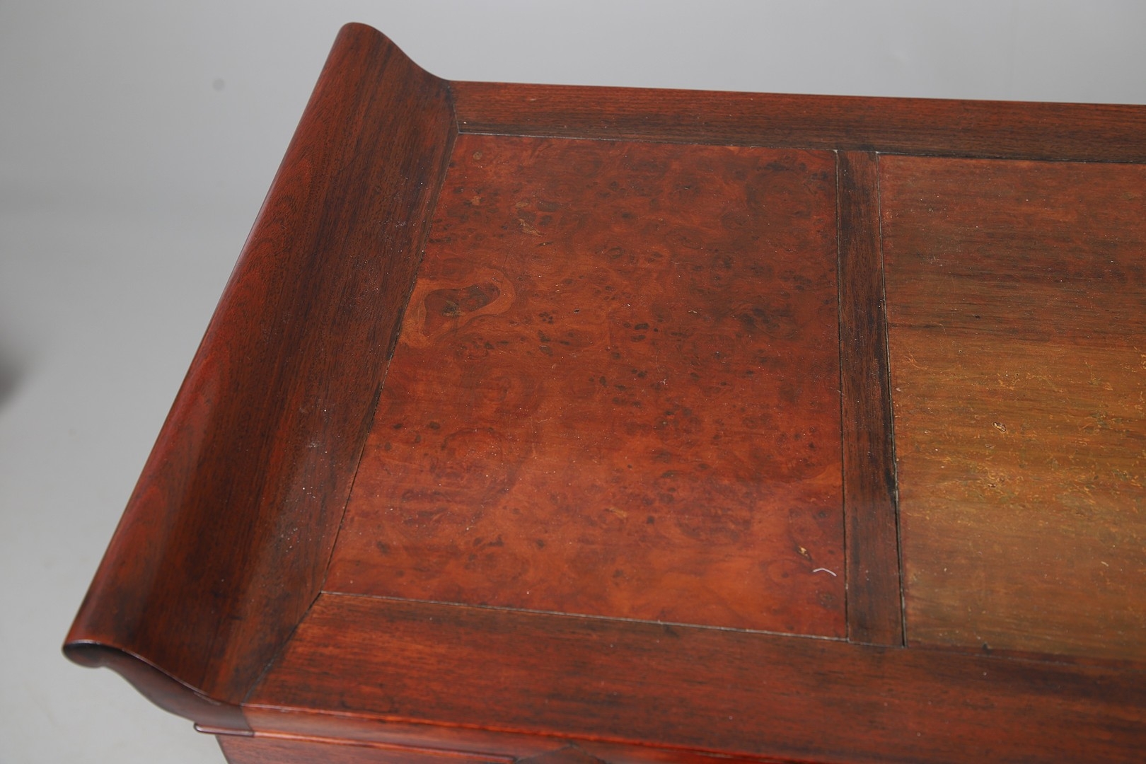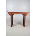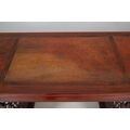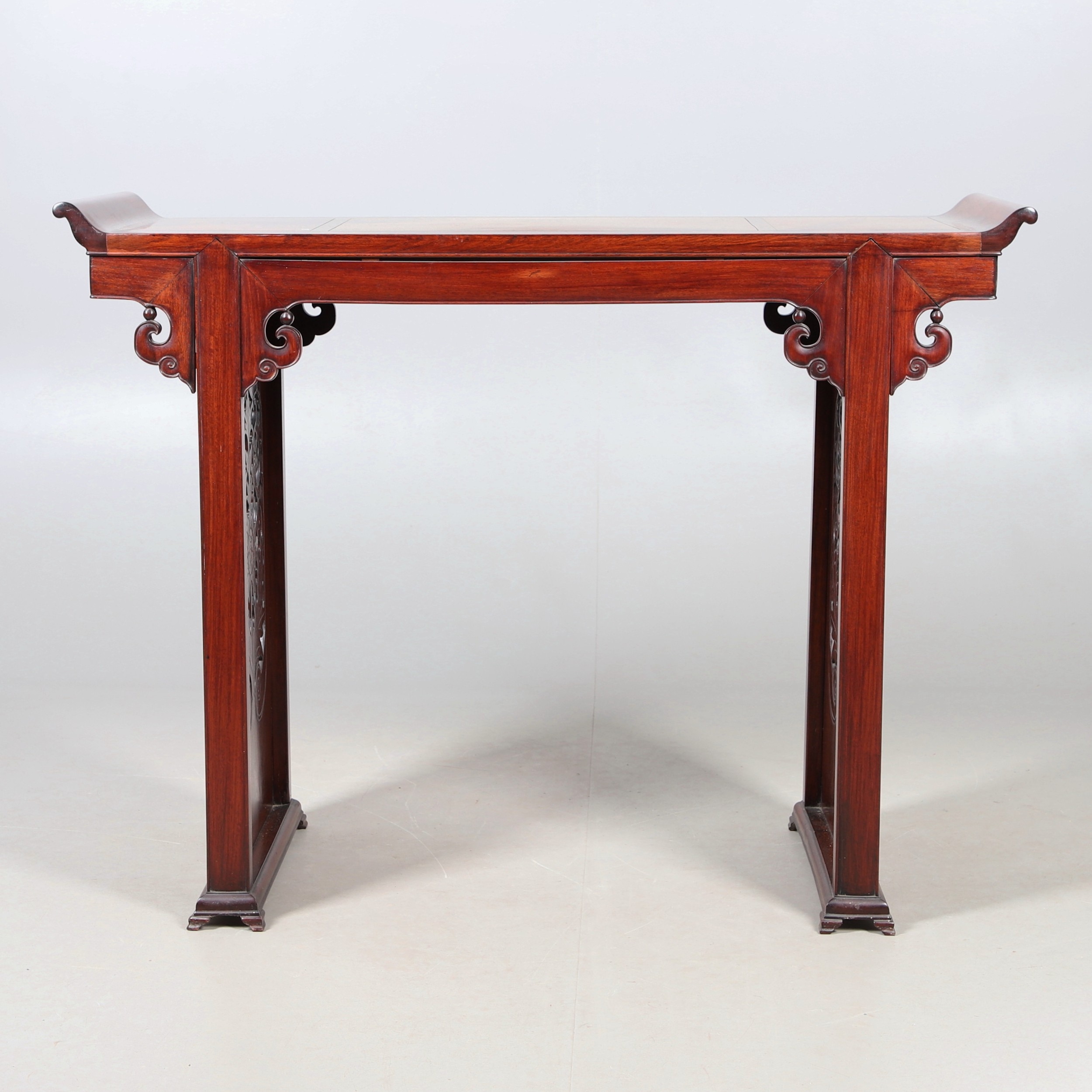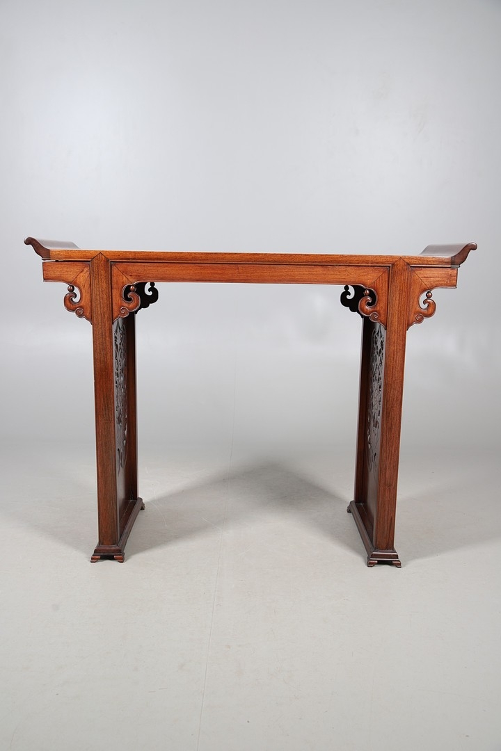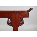 A CHINESE HUANGHUALI HARDWOOD ALTER STYLE TABLE. mid-late 20th century, the scroll ended top with inset burrwood panels to foliate pierced end supports, height 92cm, width 122cm, depth 45cm.