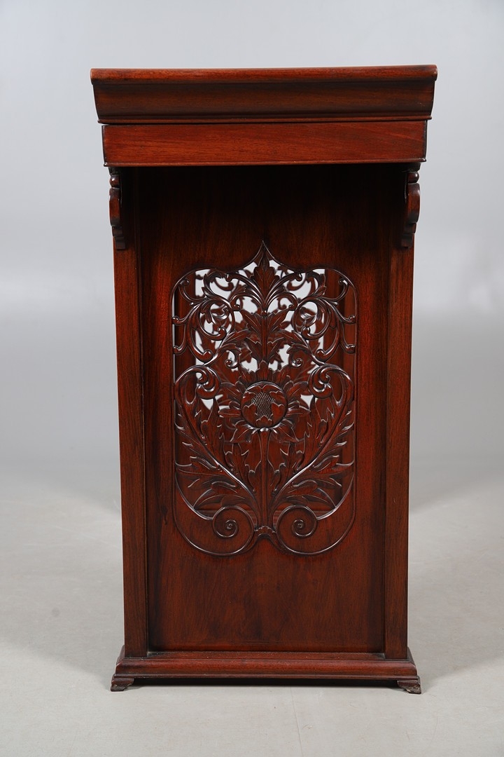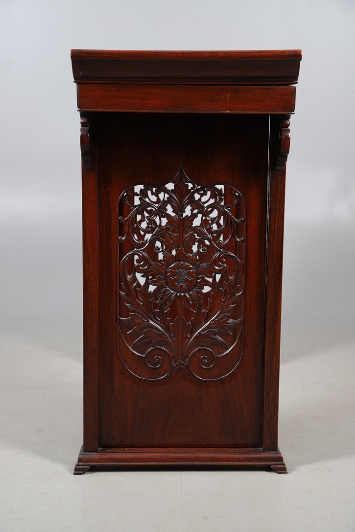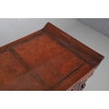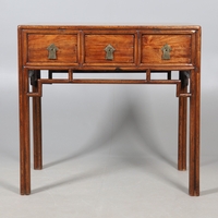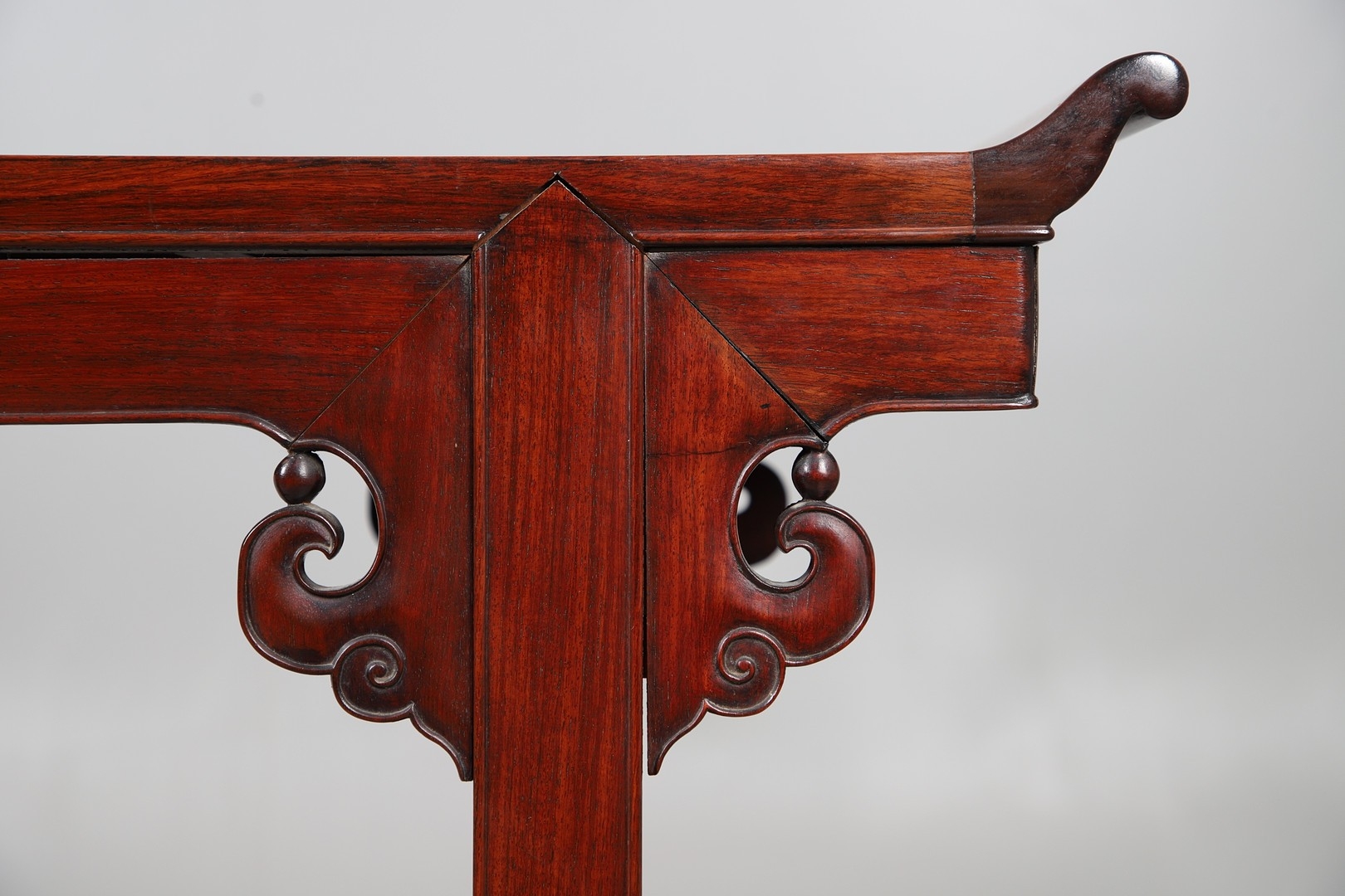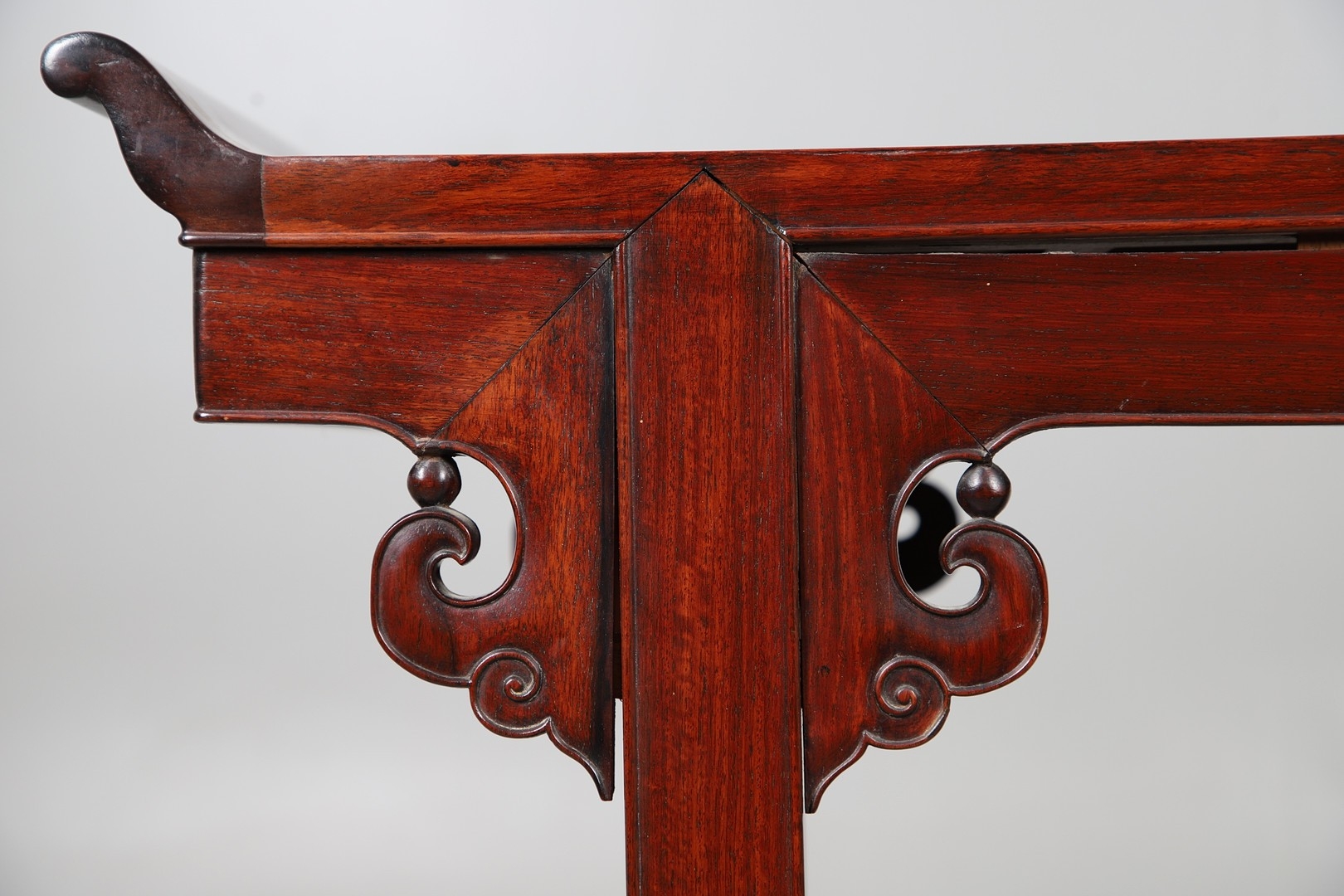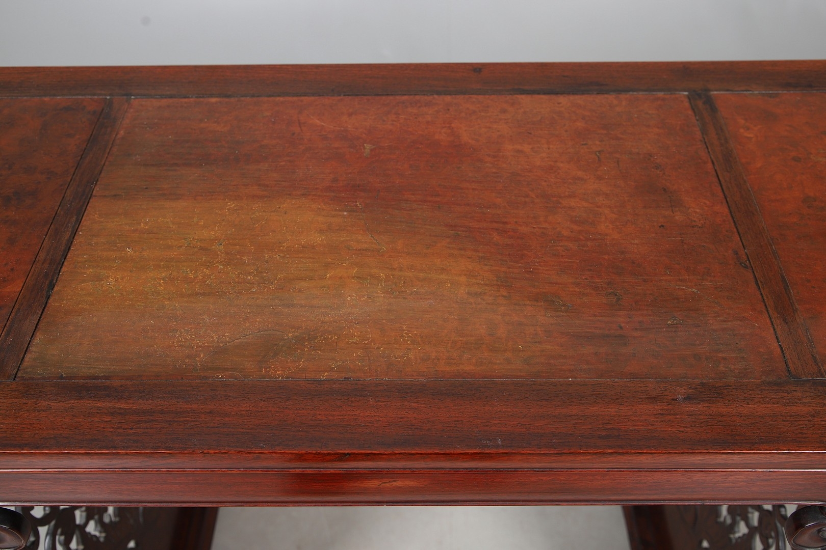 A CHINESE HUANGHUALI HARDWOOD ALTER STYLE TABLE. mid-late 20th century, the scroll ended top with inset burrwood panels to foliate pierced end supports, height 92cm, width 122cm, depth 45cm.
