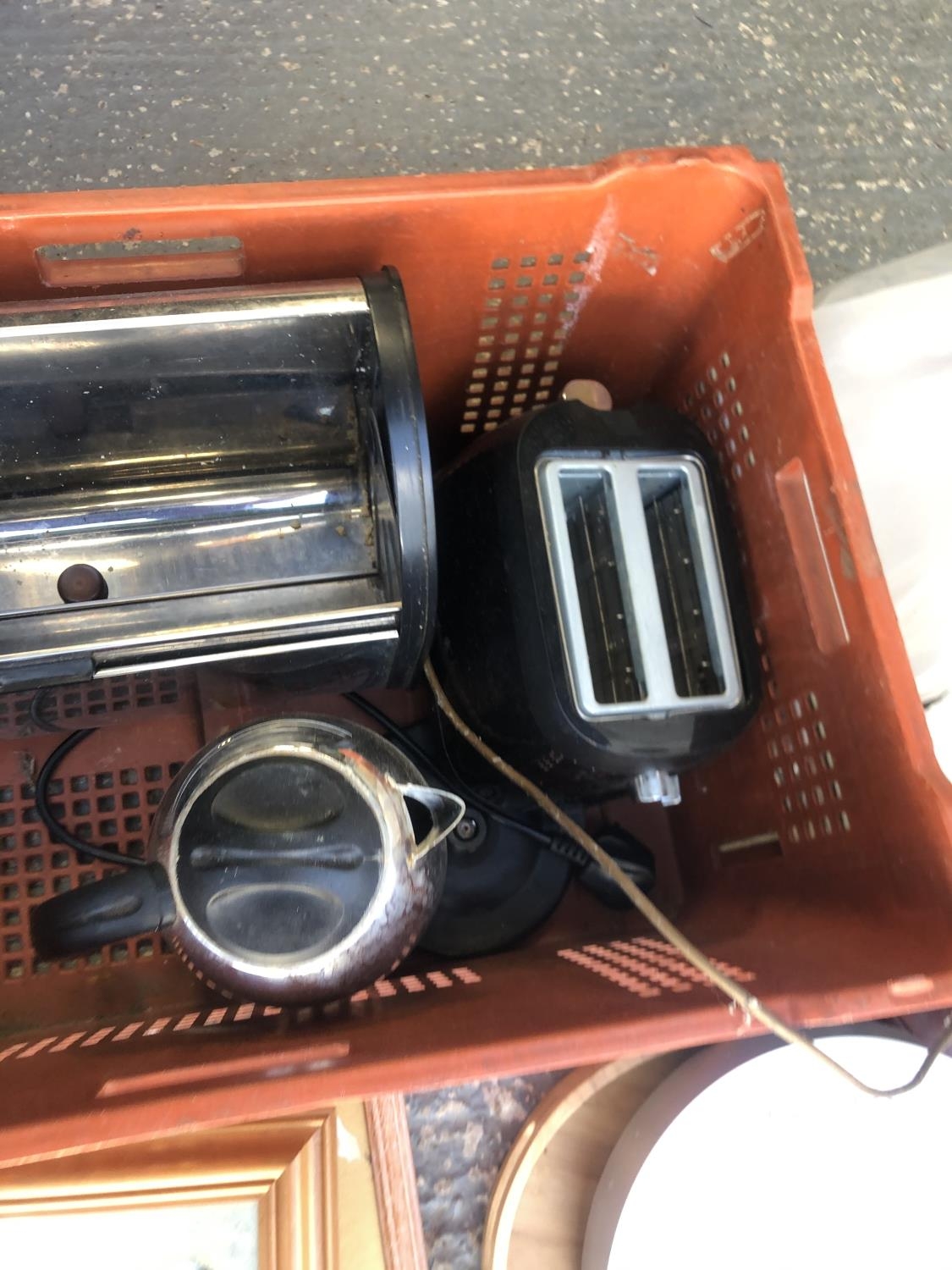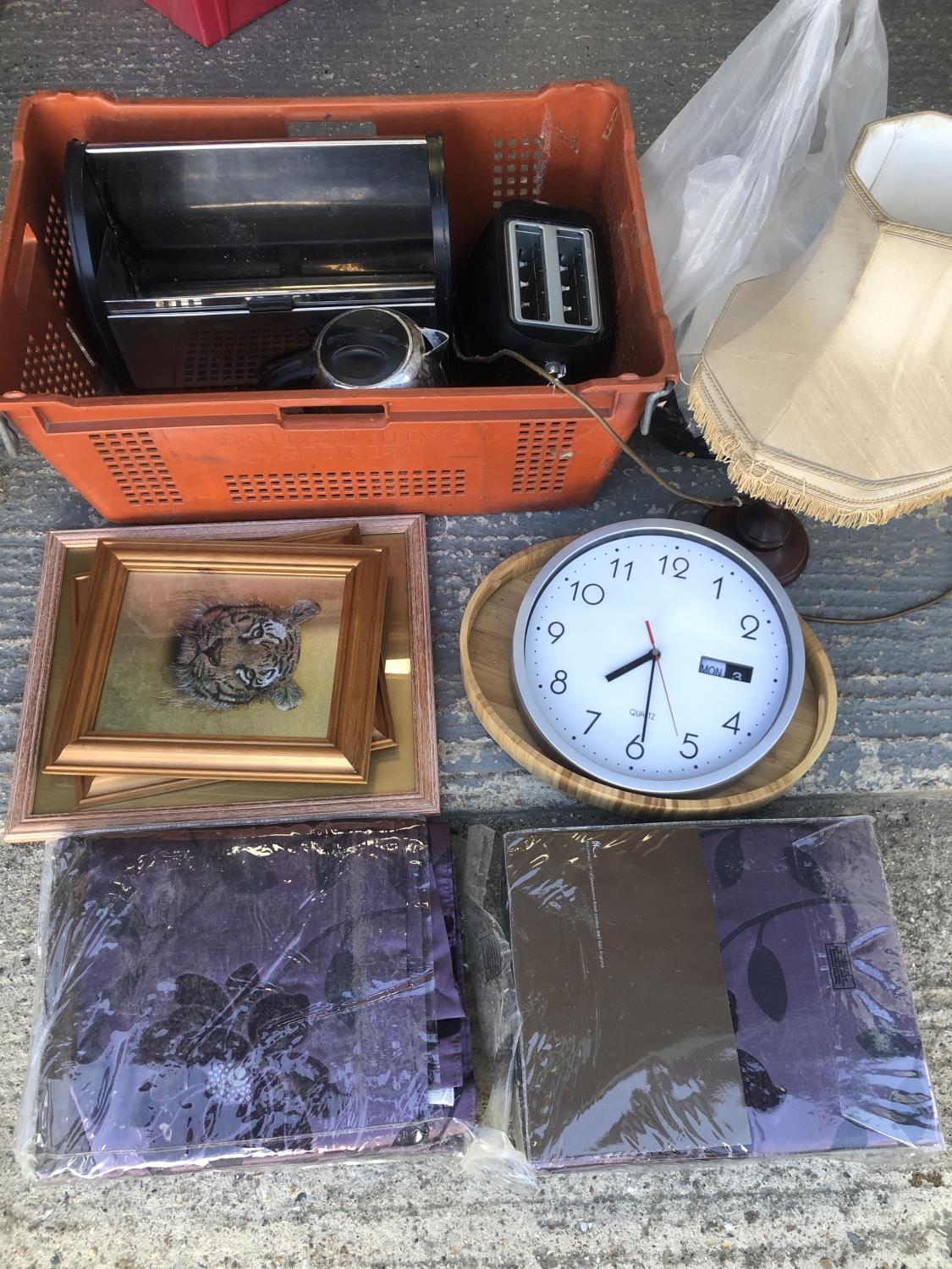Mixed homewares, curtains, pictures, clock, lamp, breadbin, toaster and kettle