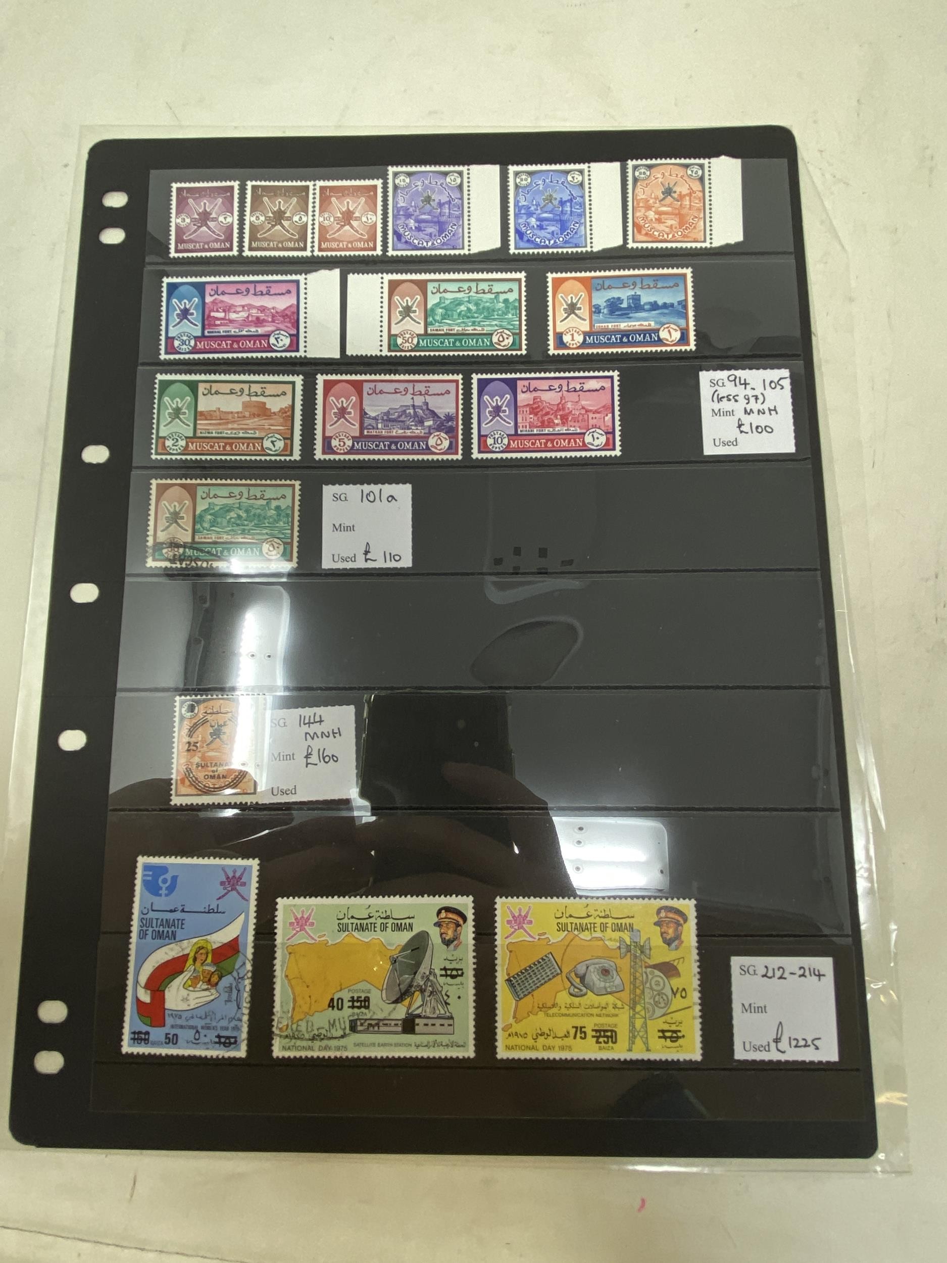 Oman- 1966-78 selection on stock card, with 1966 set, less 15b u/m , 50b type II used, 1972 25b on 1r u/m and the rare 1978 Surcharges set of three (used). SG94-105,144,212-214, cat. £1,595