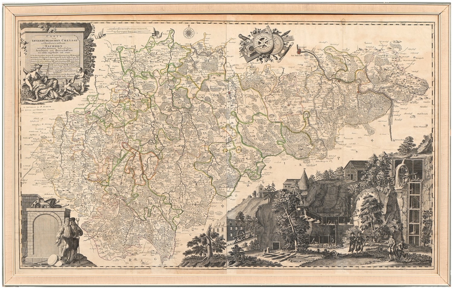 Geology & Mining. Adam Friedrich Zürner (1679-1742) - Carte von Ertzgebürgischen Creysse in Churfurstenthum Sachssen mit allen derinnen [...], [map of Saxony and the Ore Fields of Erzgebirge, Germany], Amsterdam: Pieter Schenk the Younger, 1752, cartographic allegories, the lower-right with a large view of a mine, engraving over two sheets, delineated in hand-colouring, 62 x 101cm