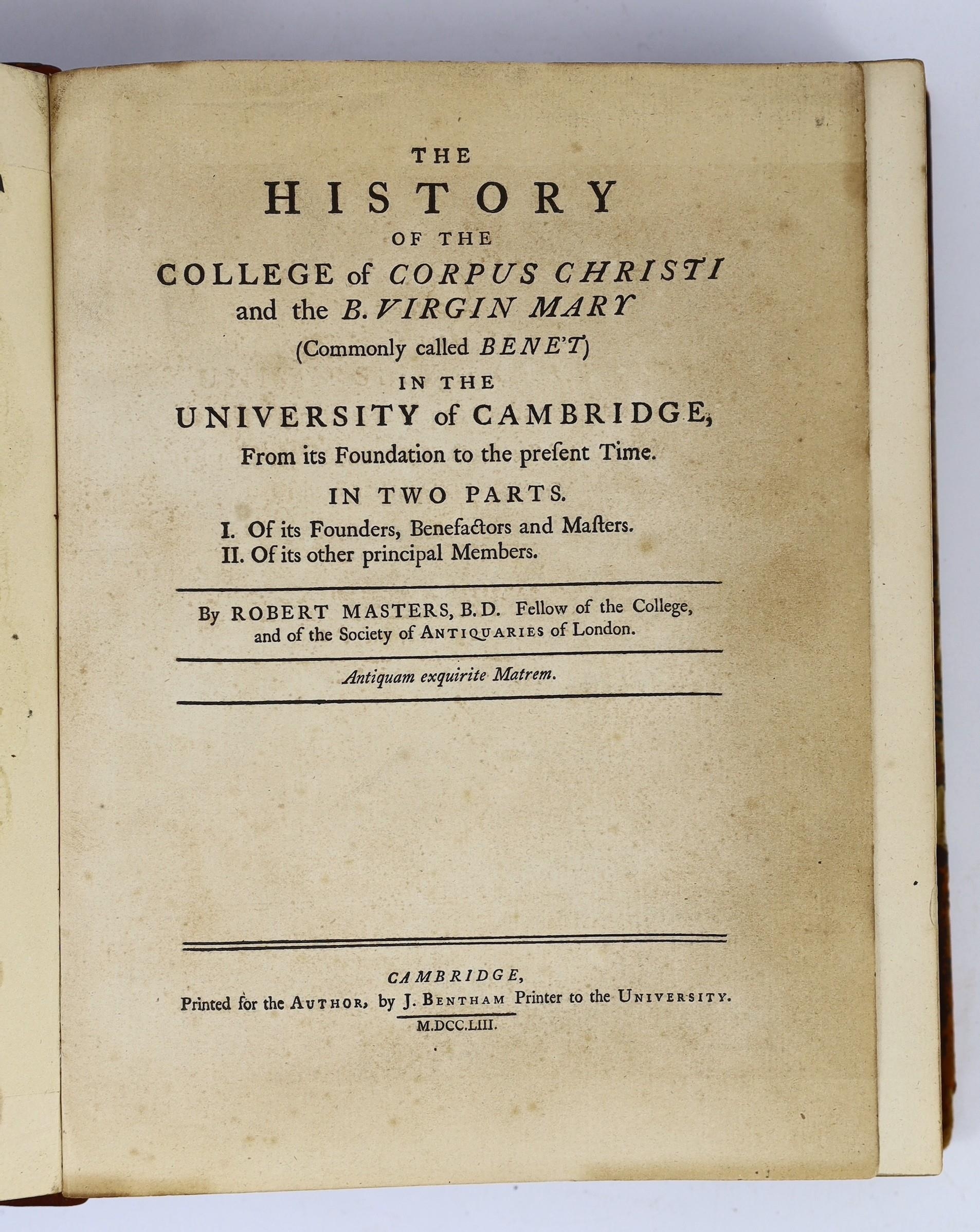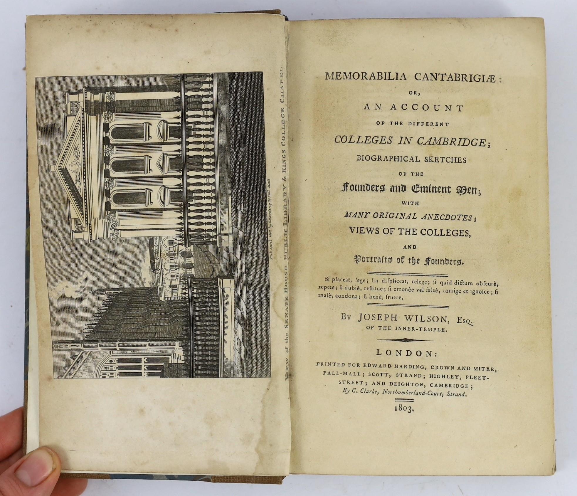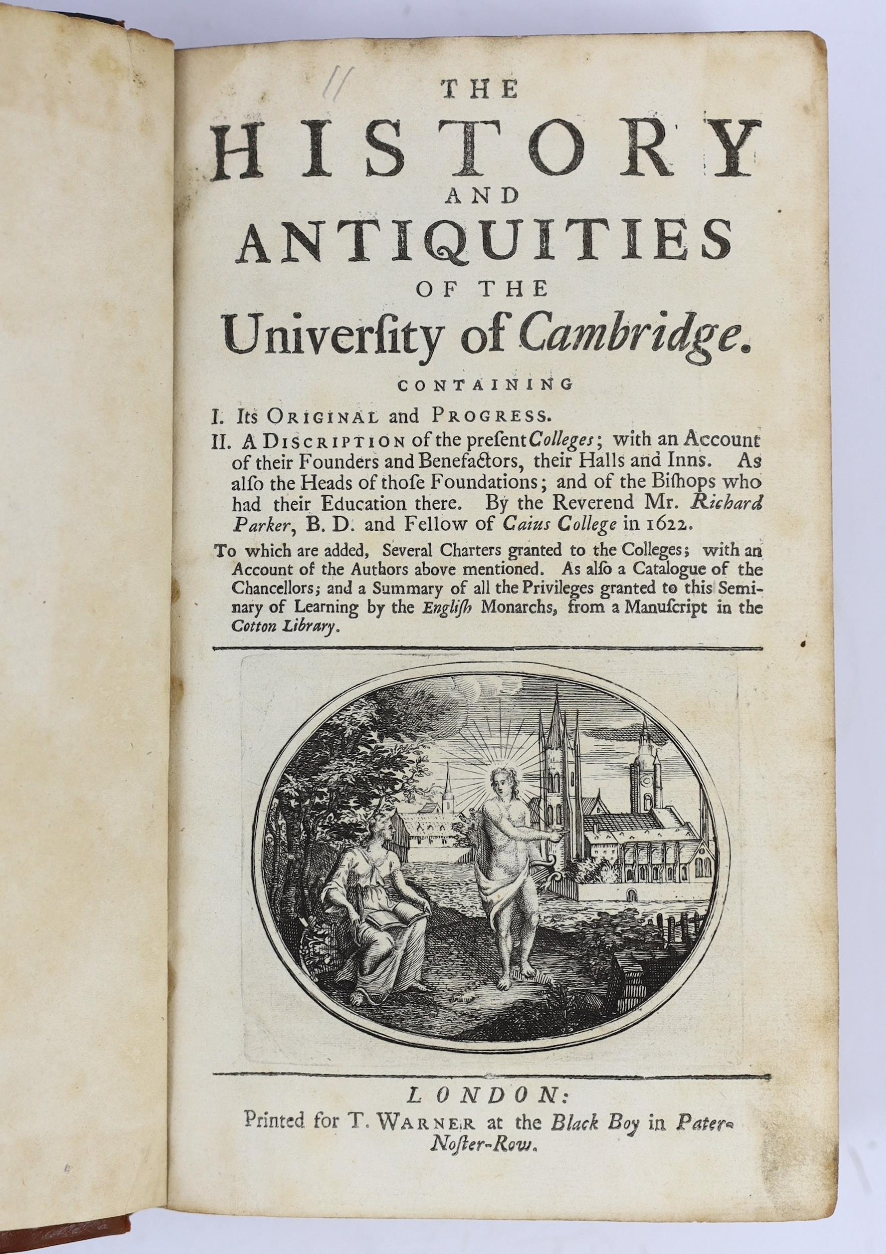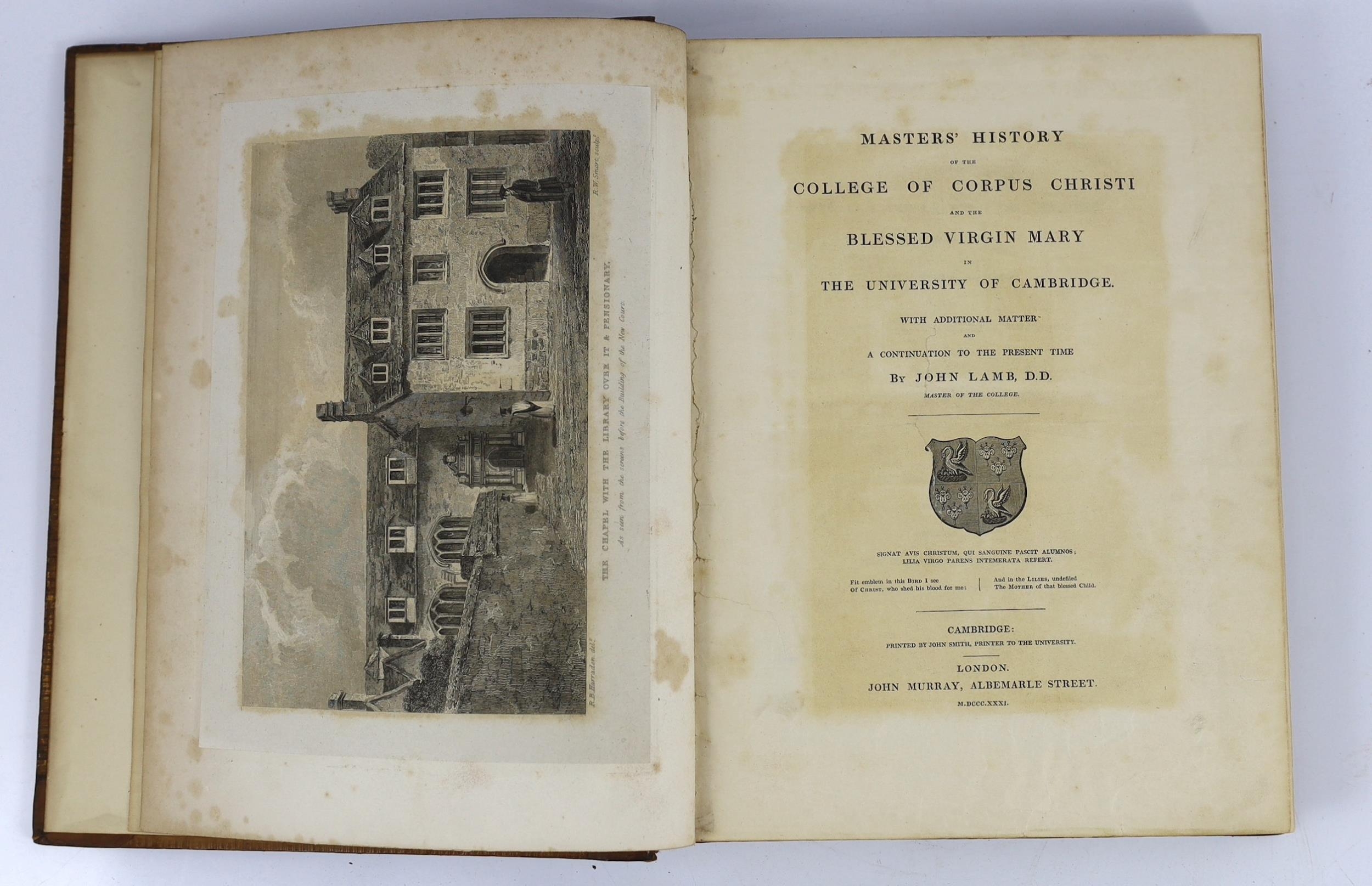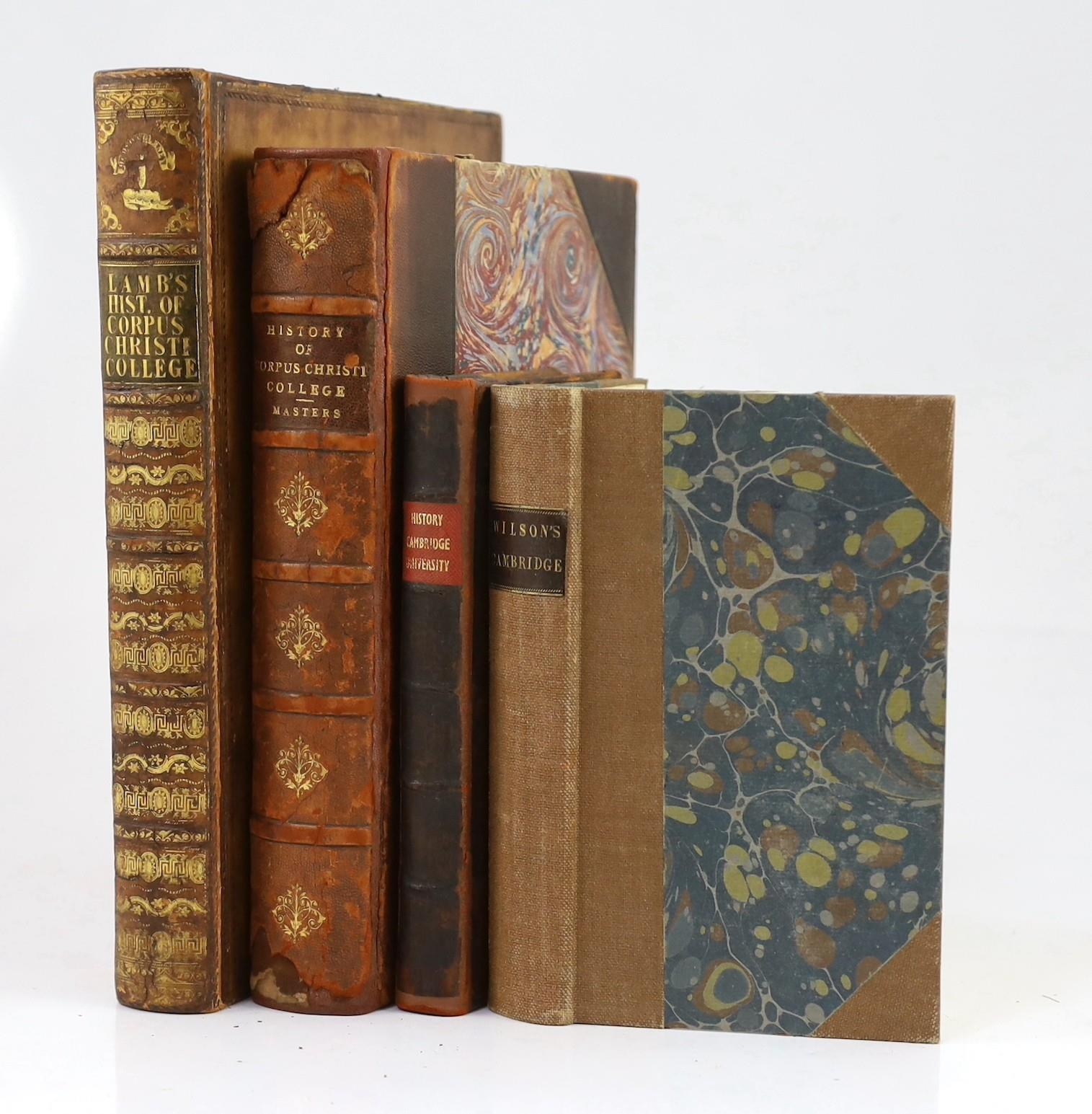 ° ° CAMBS: Lamb, John - Masters' History of the College of Corpus Christi; and the Blessed Virgin Mary in the University of Cambridge. With additional matter and a continuation to the present time ... 6 plates; contemp. gilt-ruled calf, gilt-decorated and panelled spine, 4to. Cambridge and London,1831; (Parker, Rev. Richard) - The History and Antiquities of the University of Cambridge ... engraved pictorial title, text decorations; contemp. blind-panelled calf (rebacked). printed for T. Warner, (?1721); Wilson, Joseph - Memorabilia Cantabrigiae: or, An Account of the different Colleges in Cambridge ... with many original anecdotes ... numerous plates. rebound half cloth and marbled boards. 1803: also a related book (4)