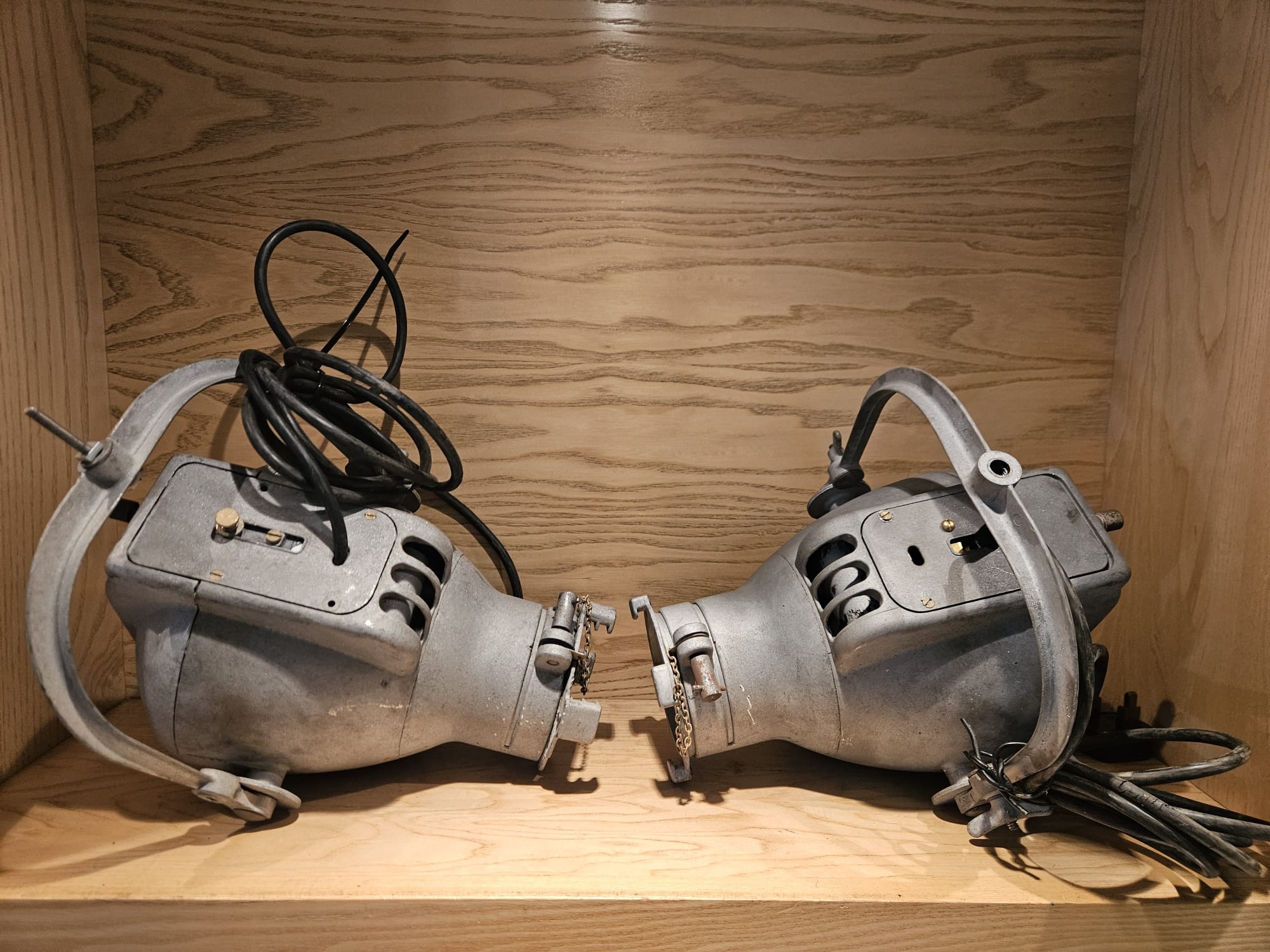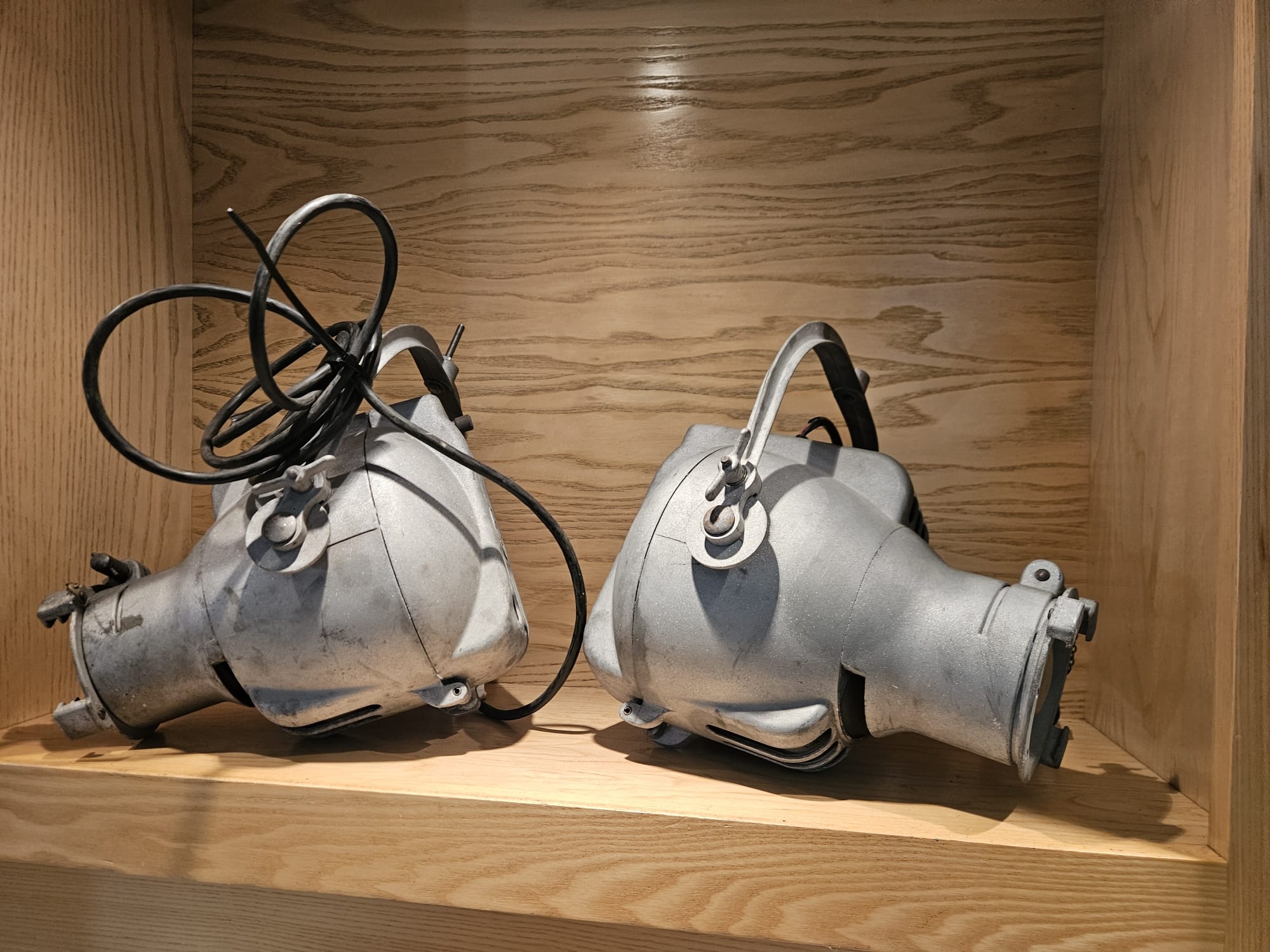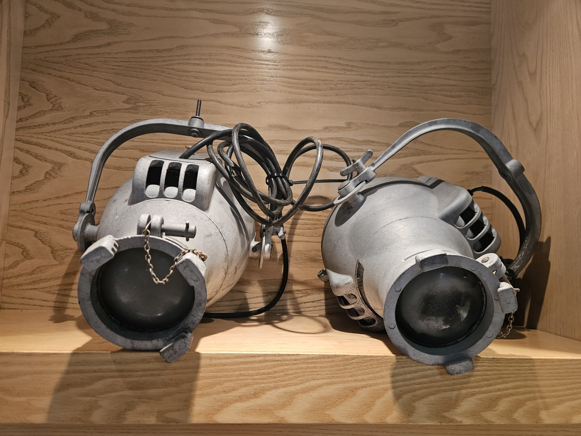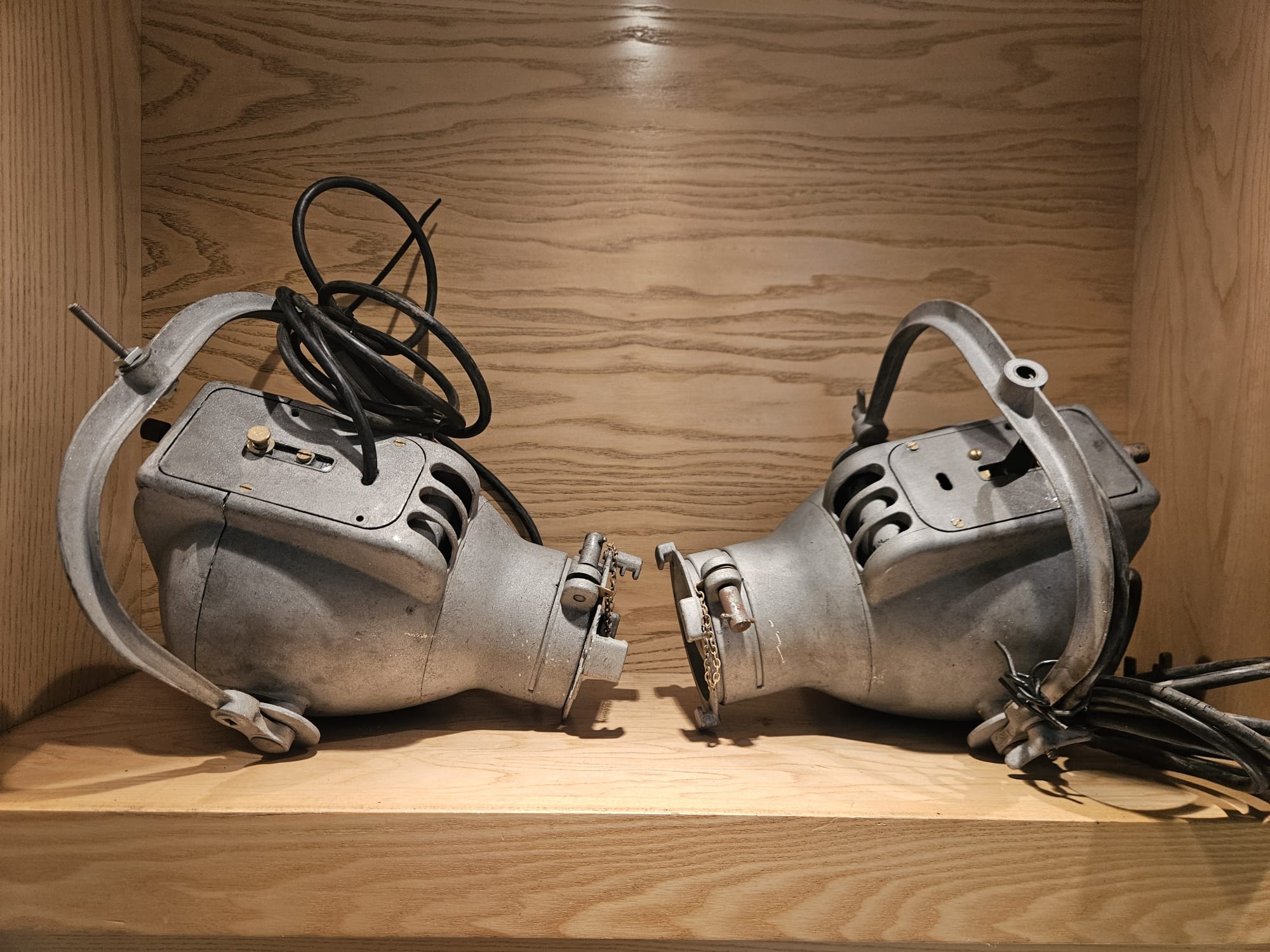 Two Strand Electric Theatre Spot Lamps, aluminium bodys, recently sandblasted.