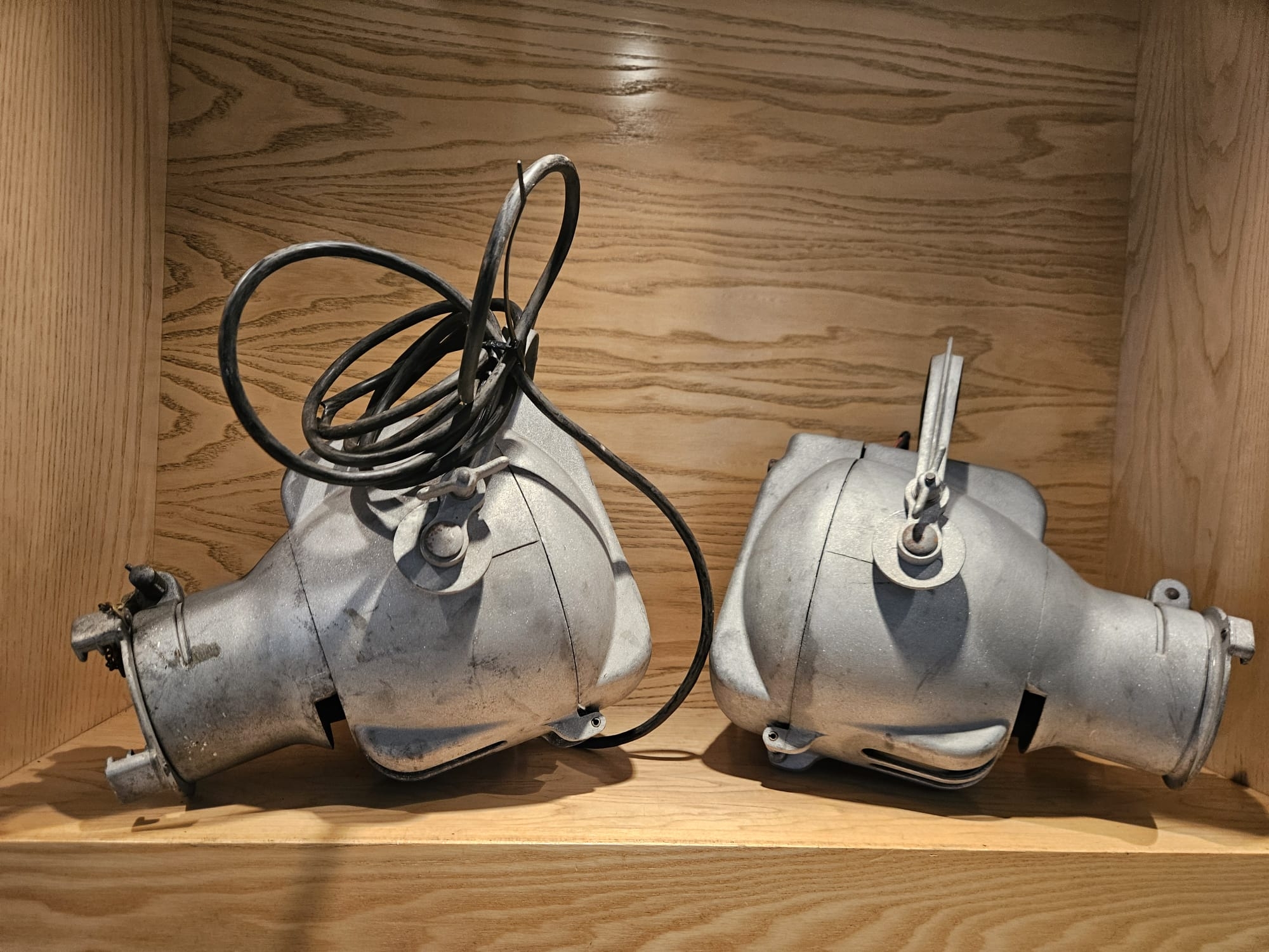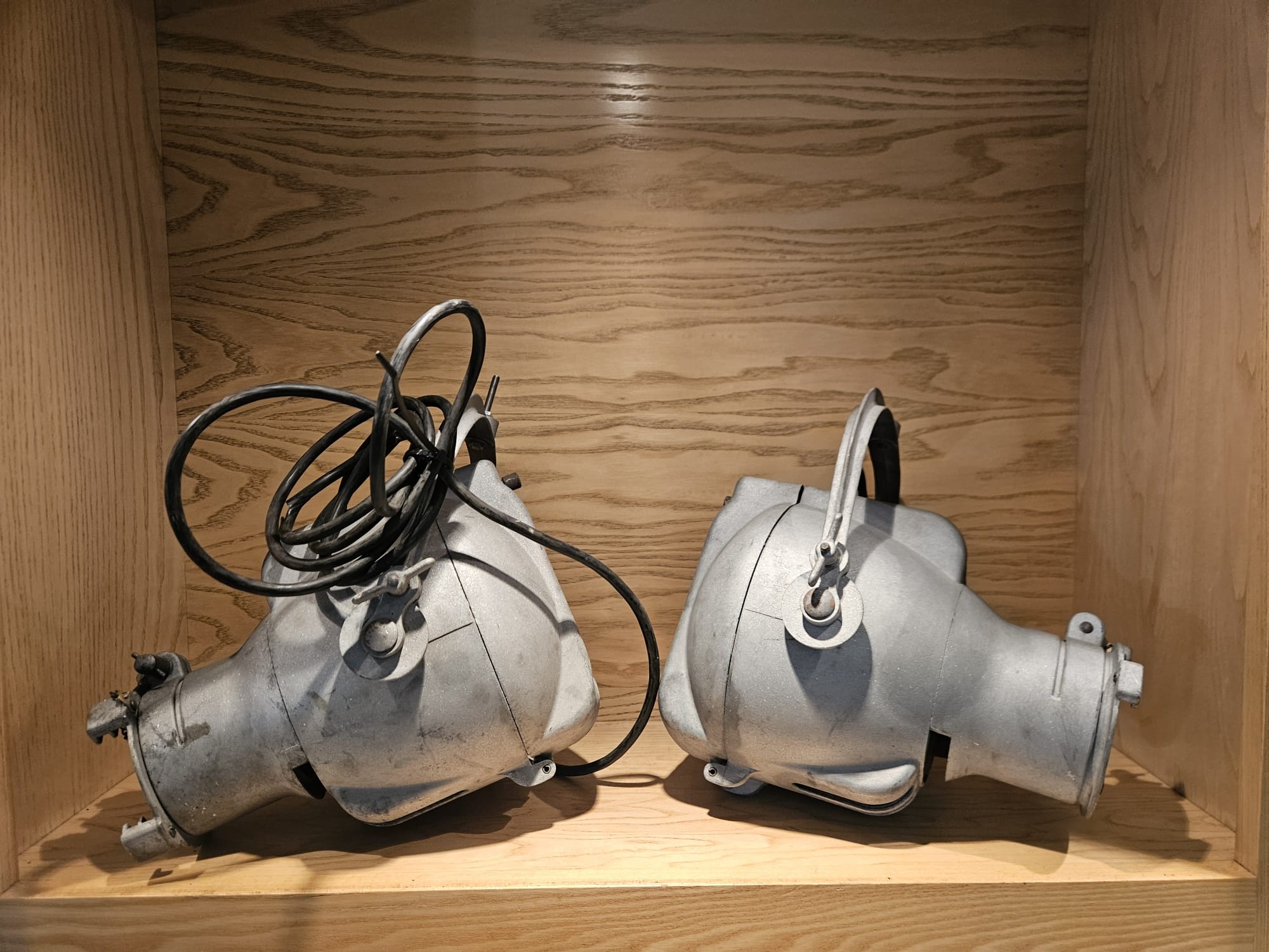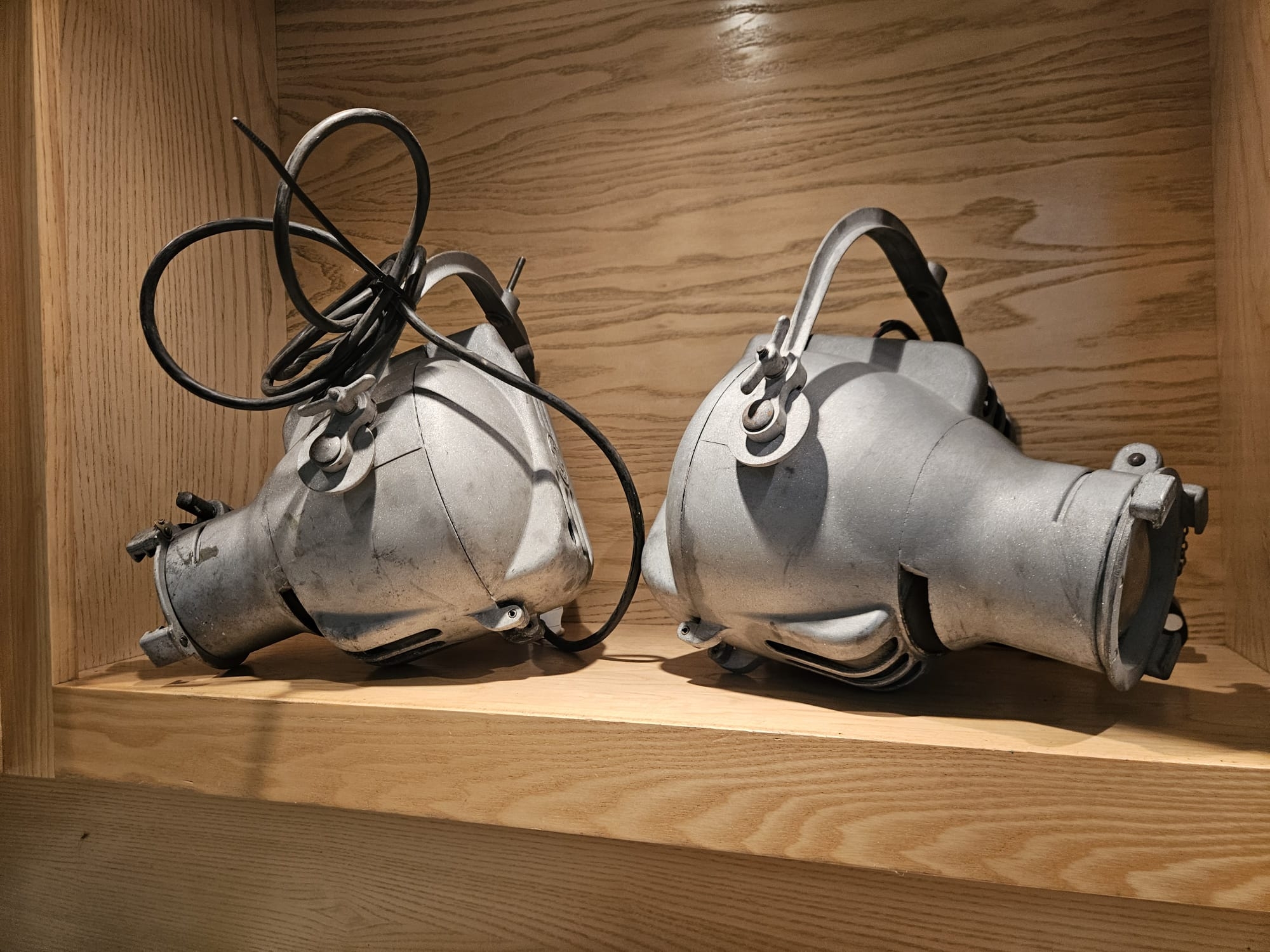 Two Strand Electric Theatre Spot Lamps, aluminium bodys, recently sandblasted.