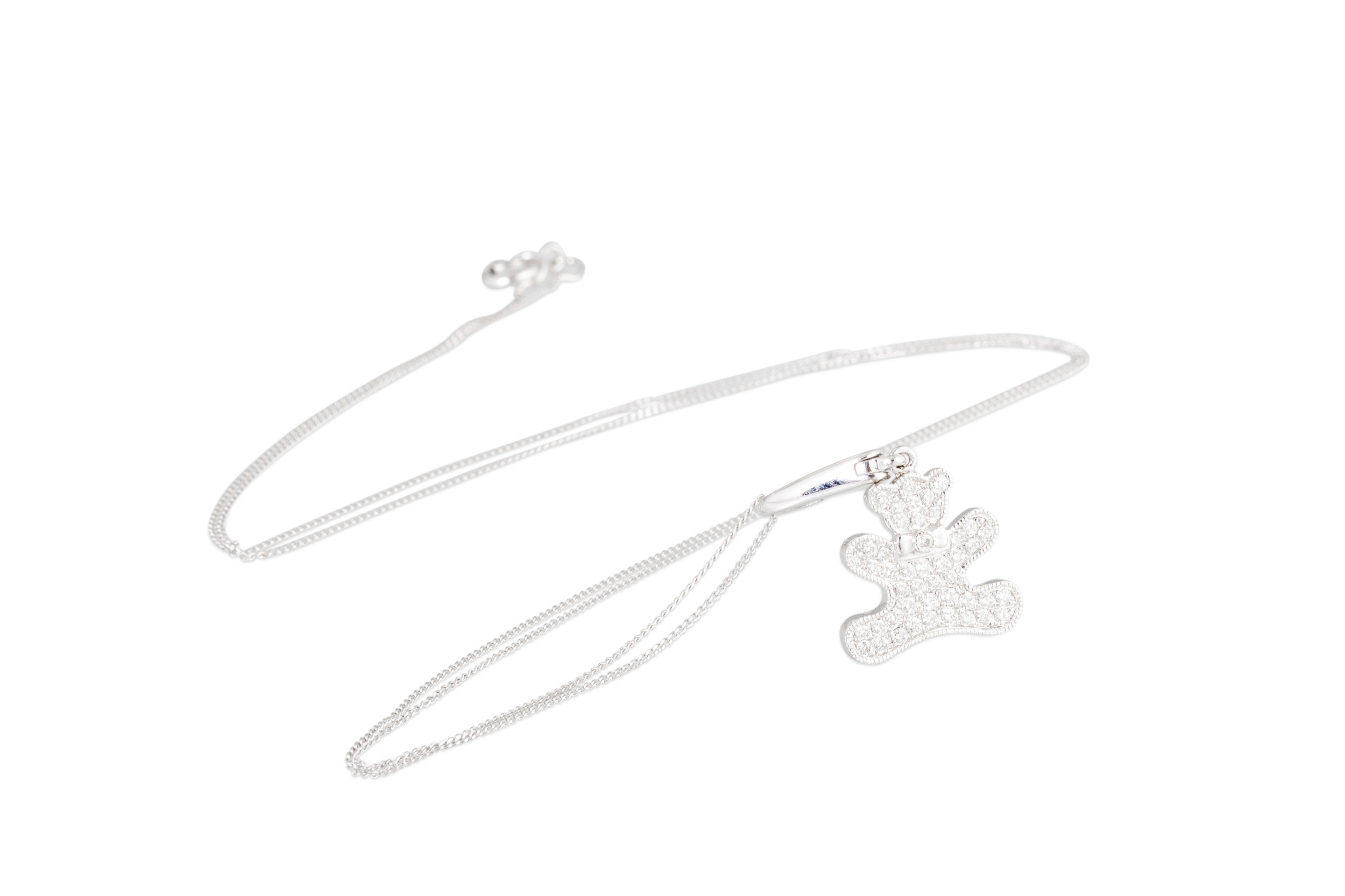 A DIAMOND SET PENDANT, modelled as a teddy bear with pavé-set diamonds mounted in 18ct white gold to a 9ct white gold chain