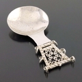 A large Arts and Crafts silver caddy spoon, Sandheim Brothers, London 1922, circular planished bowl on a triangular handle, reticulated with knotted hoop design and beaded borders, flanked by three rings to each side, 11cm long, 1.08ozt