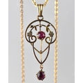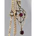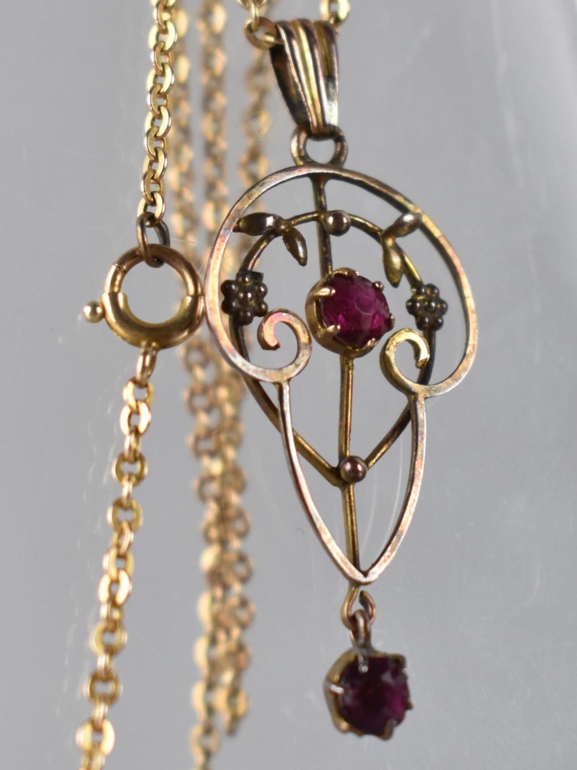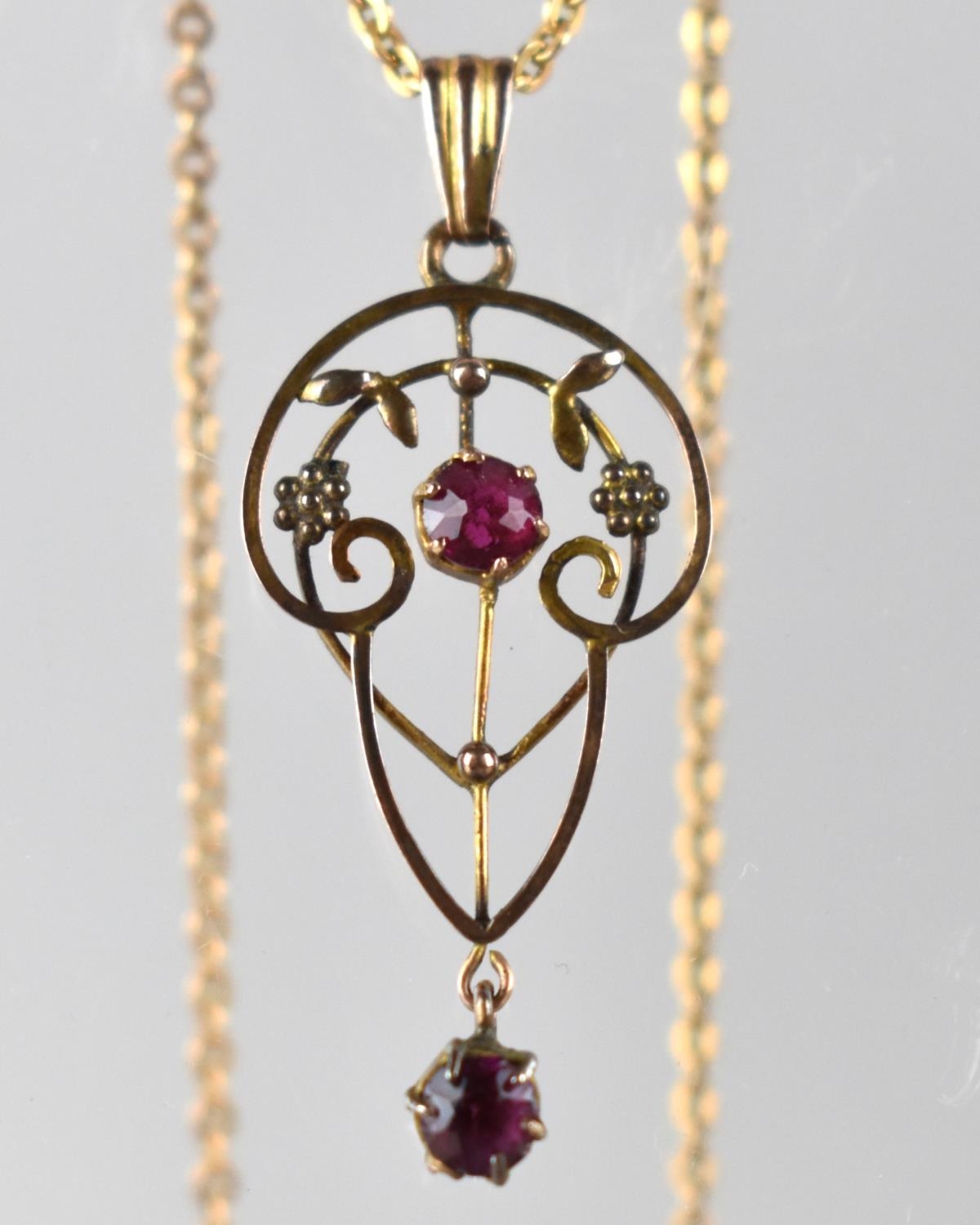A 9ct Gold Mounted Early 20th Century Pendant on a 9ct Gold Chain, Pendant with Central Round Cut Red Stone in Six Claws and with Similar Red Stone Drop Mounted on a Gold Art Nouveau Wirework Frame Featuring Pressed Metal Daisies, having Applied Plaque to the Reverse Stamped 9ct, Chain 45cms Long and Stamped to Clasp 9ct, 4.4gms Total