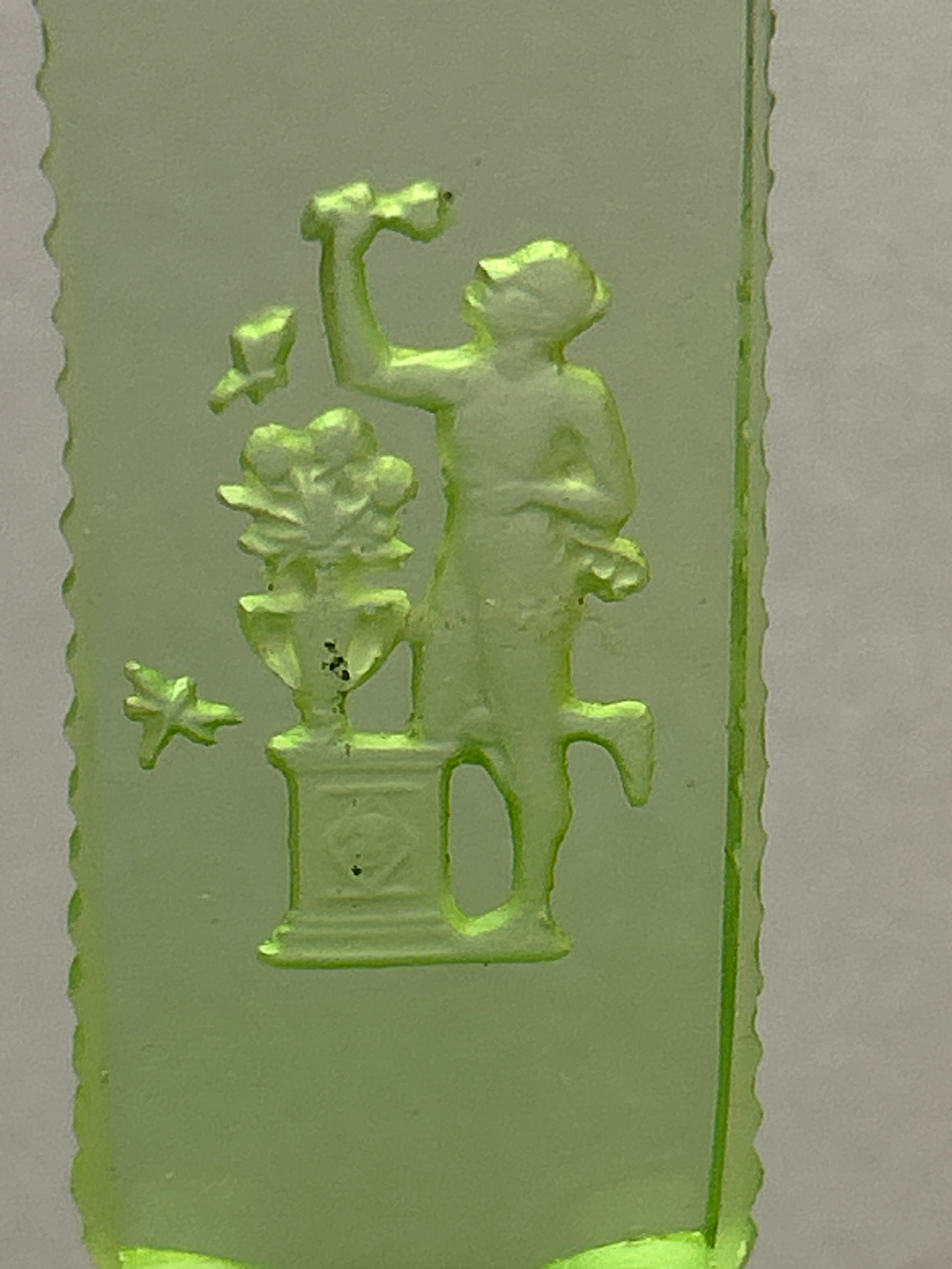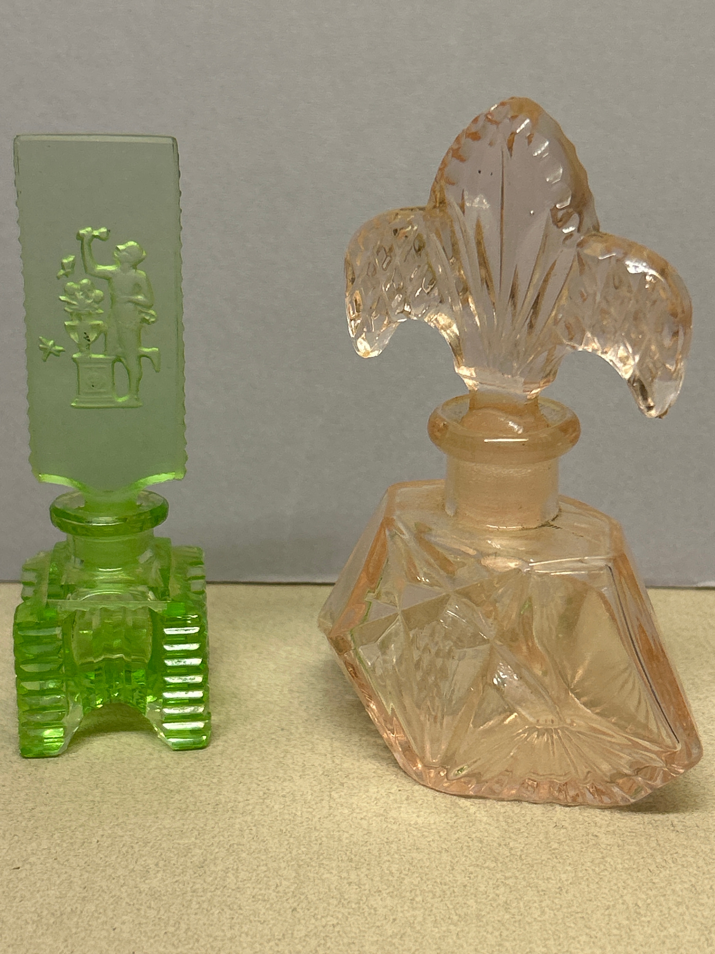 Two Art Deco glass scent bottles, the green one with intaglio design probably by Heinrich Hoffmann