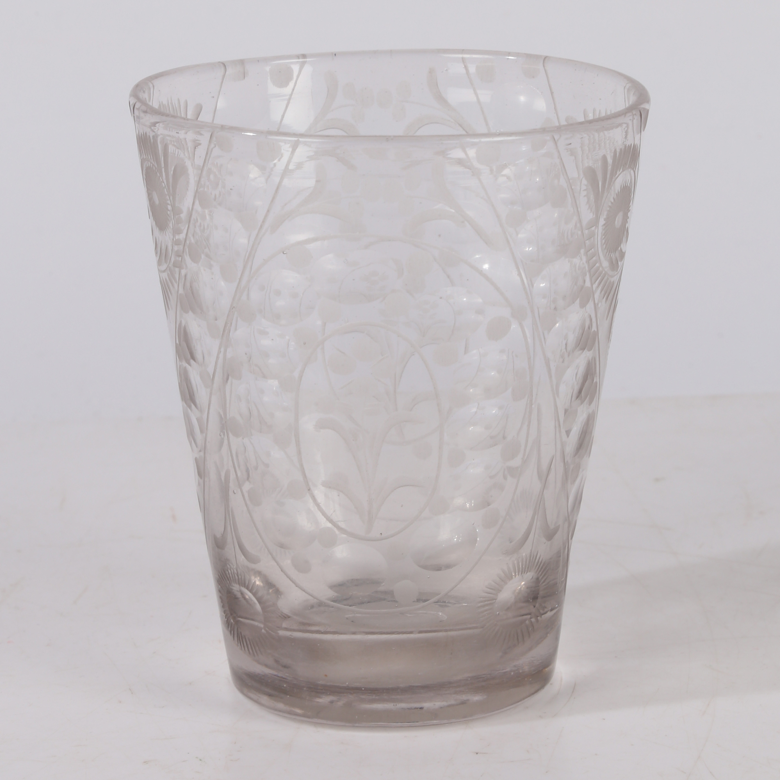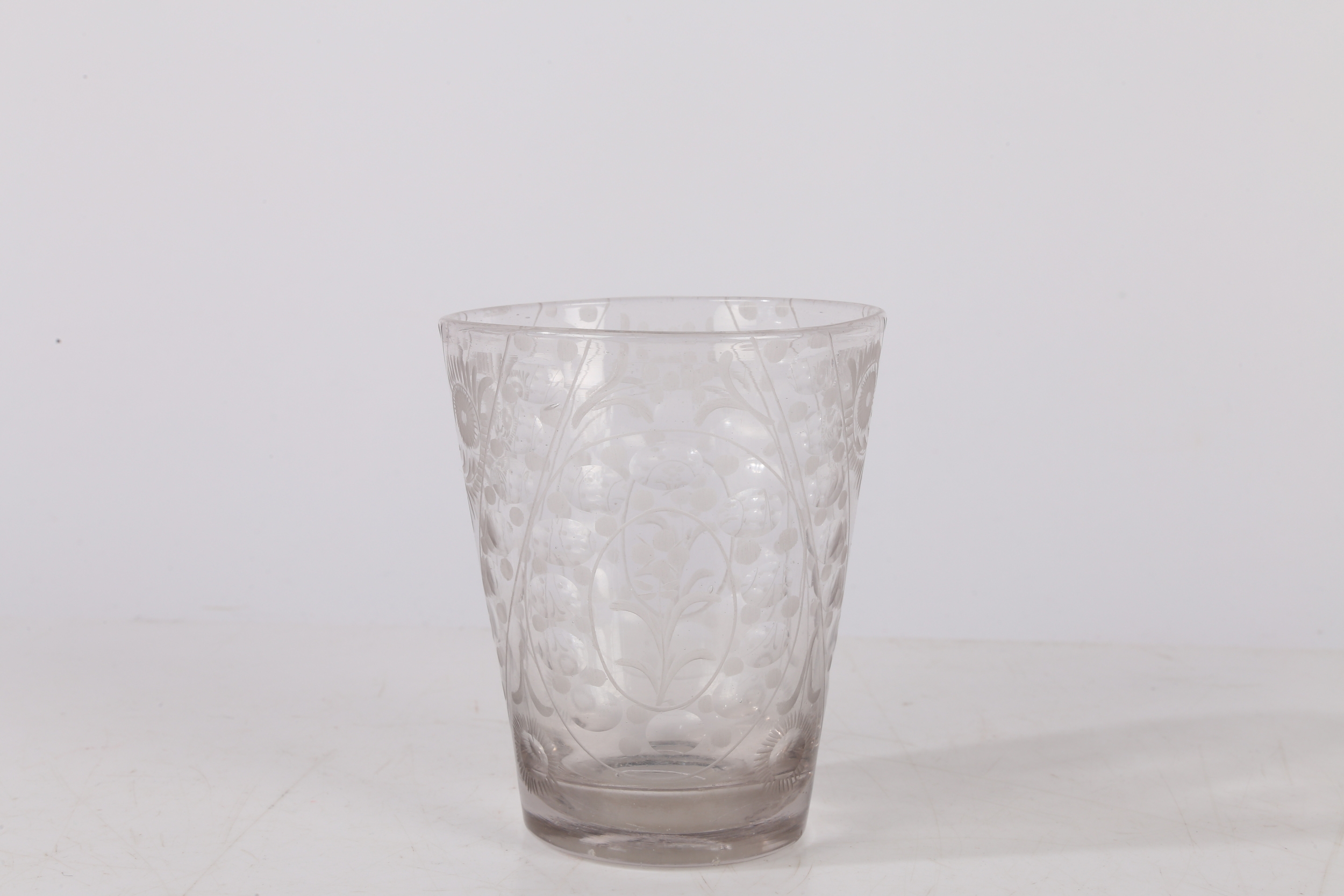A MID 18TH CENTURY BOHEMIAN ENGRAVED BEAKER. Circa 1740, engraved with floral patterns, 12cm high.