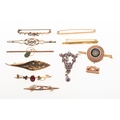 A mixed collection of vintage and antique jewellery, mainly brooches, including an openwork bar brooch, milgrain collet set with a circular-cut sapphire and two seed pearls, unmarked yellow metal, metal pin, length approx. 5.3cm, 2.2grams; a bar brooch set with a pear shaped opal doublet, unmarked yellow metal, metal pin, length approx. 5.0cm, 1.9grams; a plain bar brooch, marked 9ct, metal pin, length approx. 4.3cm, 1.8grams; two bar brooches of varied design set with stones, some stones missing, both pins missing, both marked 9ct, 1.4grams; a 9ct gold bar brooch set with a circular plaque of sunstone and a floral micro mosaic, UK hallmark, Chester, 1914, pin missing, length approx. 3.5cm, 3.2grams; a rolled gold Lily of the Valley brooch; a gilt & enamelled brooch in the form of a pen; a gilt bow brooch set with a seed pearl; a watch ribbon bracelet clasp marked 9ct, 0.9grams; and an Art Nouveau style double sided, purple enamelled floral pendant / earring? attachment, unmarked white metal, length approx. 4.0cm, 2.0grams, (Qty).