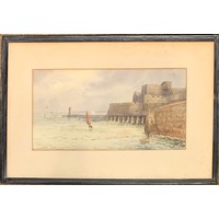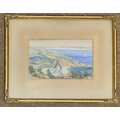 Naftel school, 19th century, Fermain Bay Guernsey, with Sark, Jethou, Herm and Alderney in the distance, watercolour heightened with white, 14.5 x 23cm.