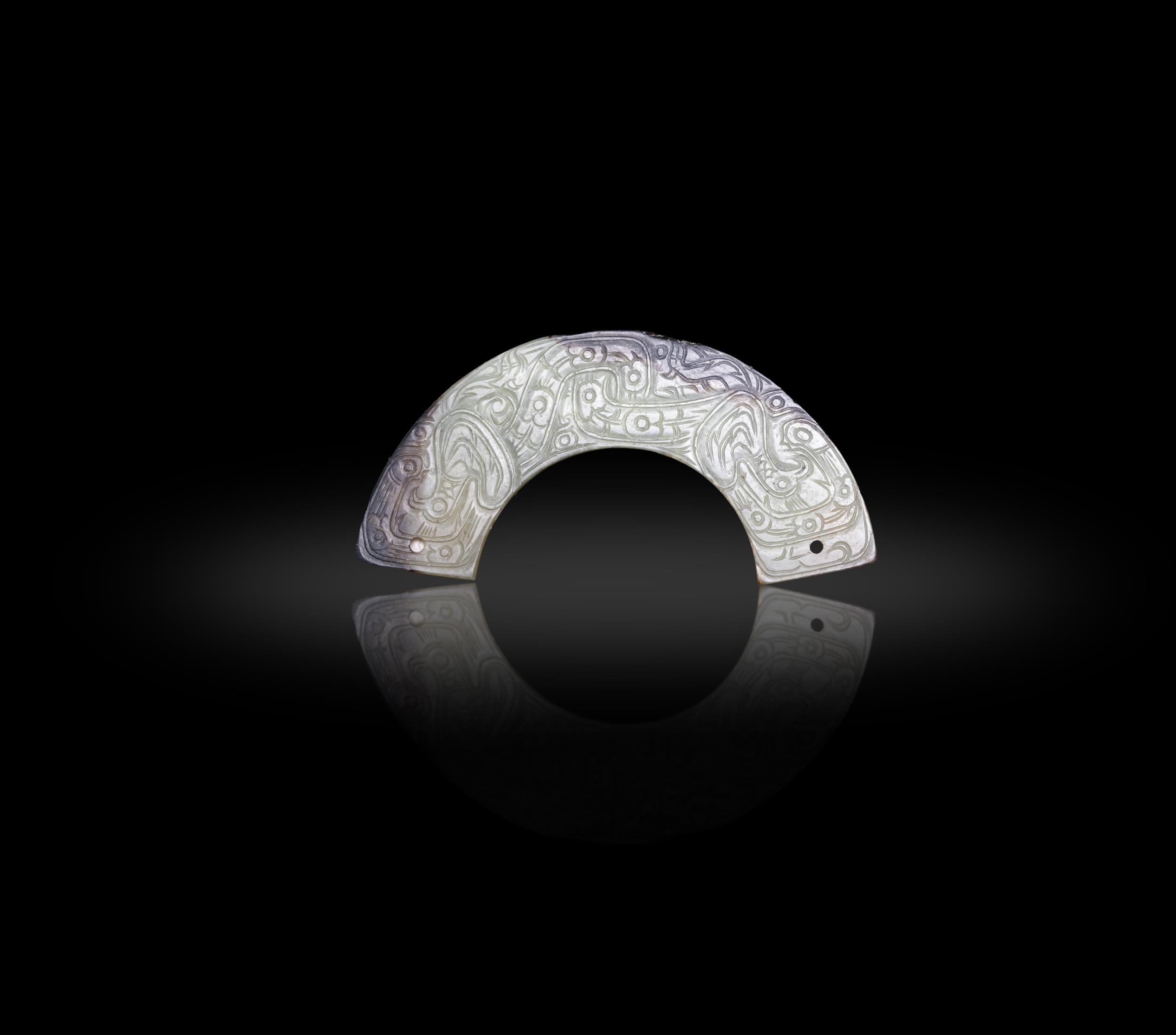 A YELLOW JADE WITH BLACK RUSSET CARVING OF HUANG, DECORATED WITH ARCHAISTIC BIRDS ???? ?????? China, Western Zhou or later. L. 10.4cm