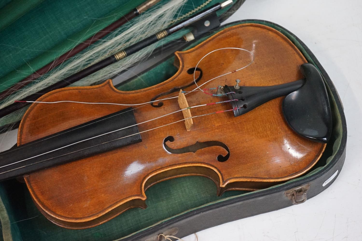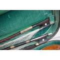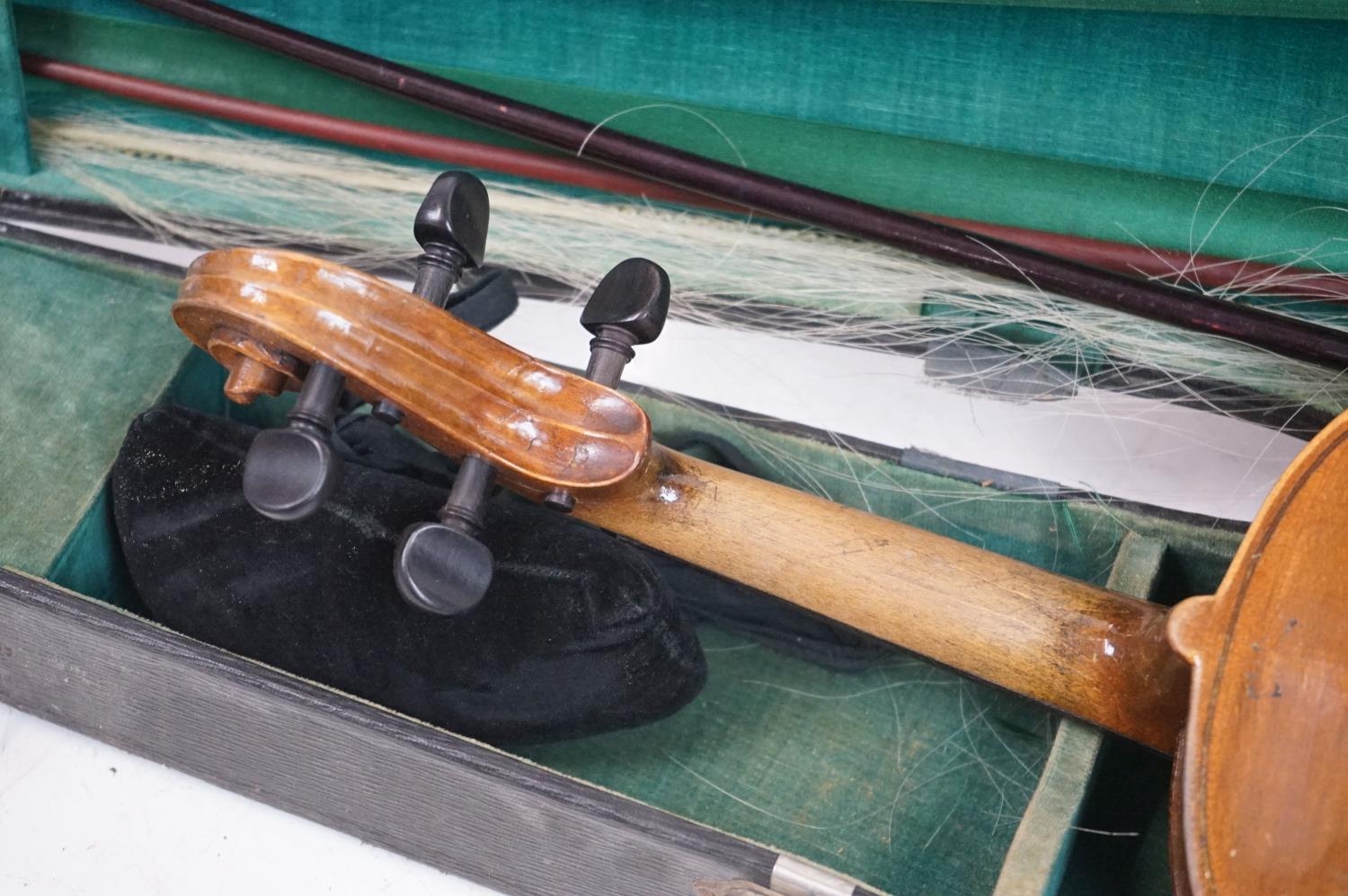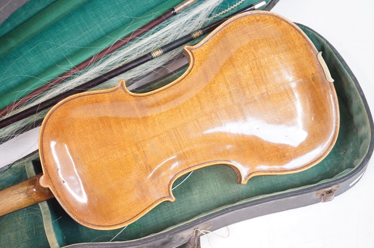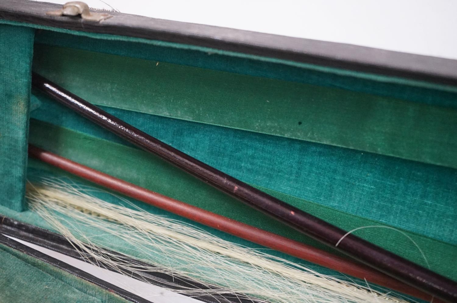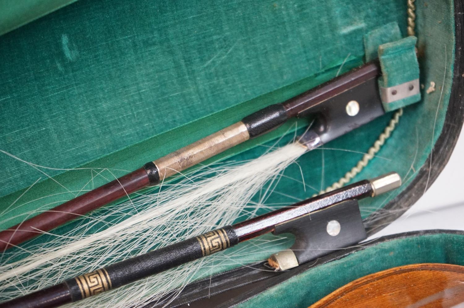 A violin together with two violin bows, cased, label suggests this was possibly the property of Frank Maddox, Theatre Royal Bath