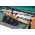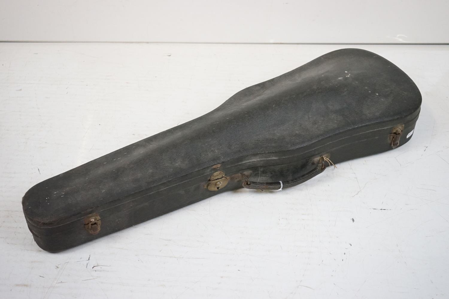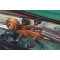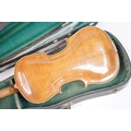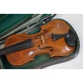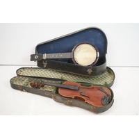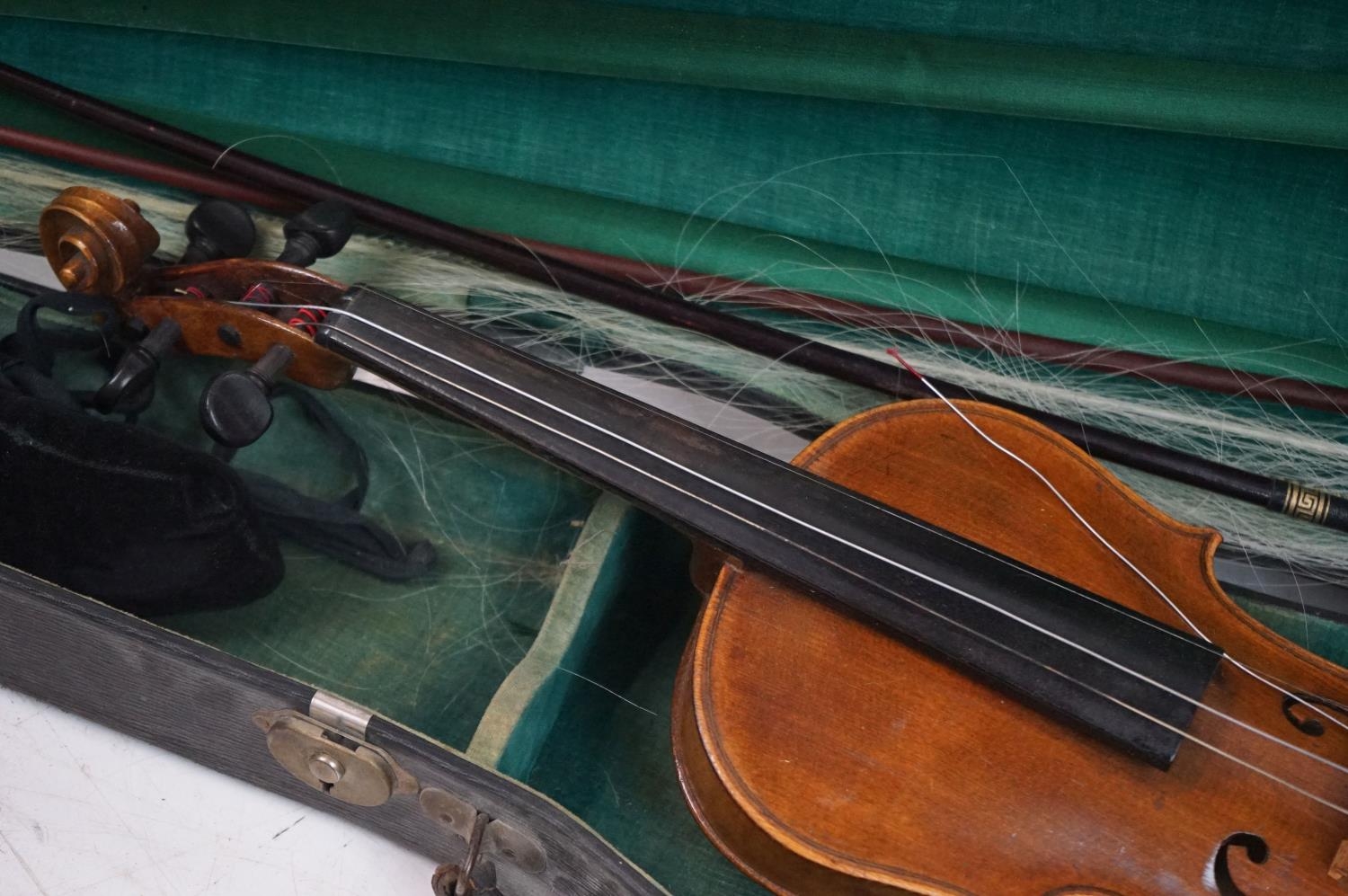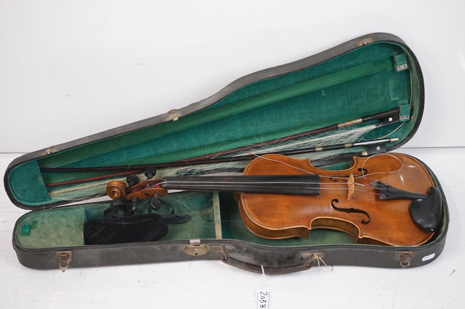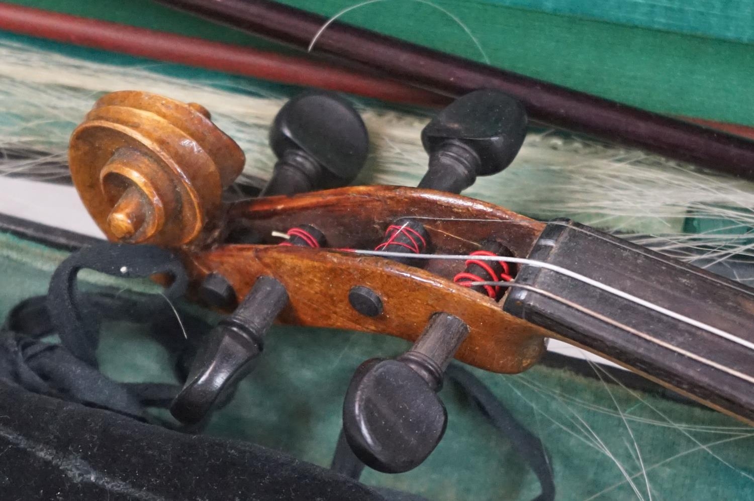 A violin together with two violin bows, cased, label suggests this was possibly the property of Frank Maddox, Theatre Royal Bath