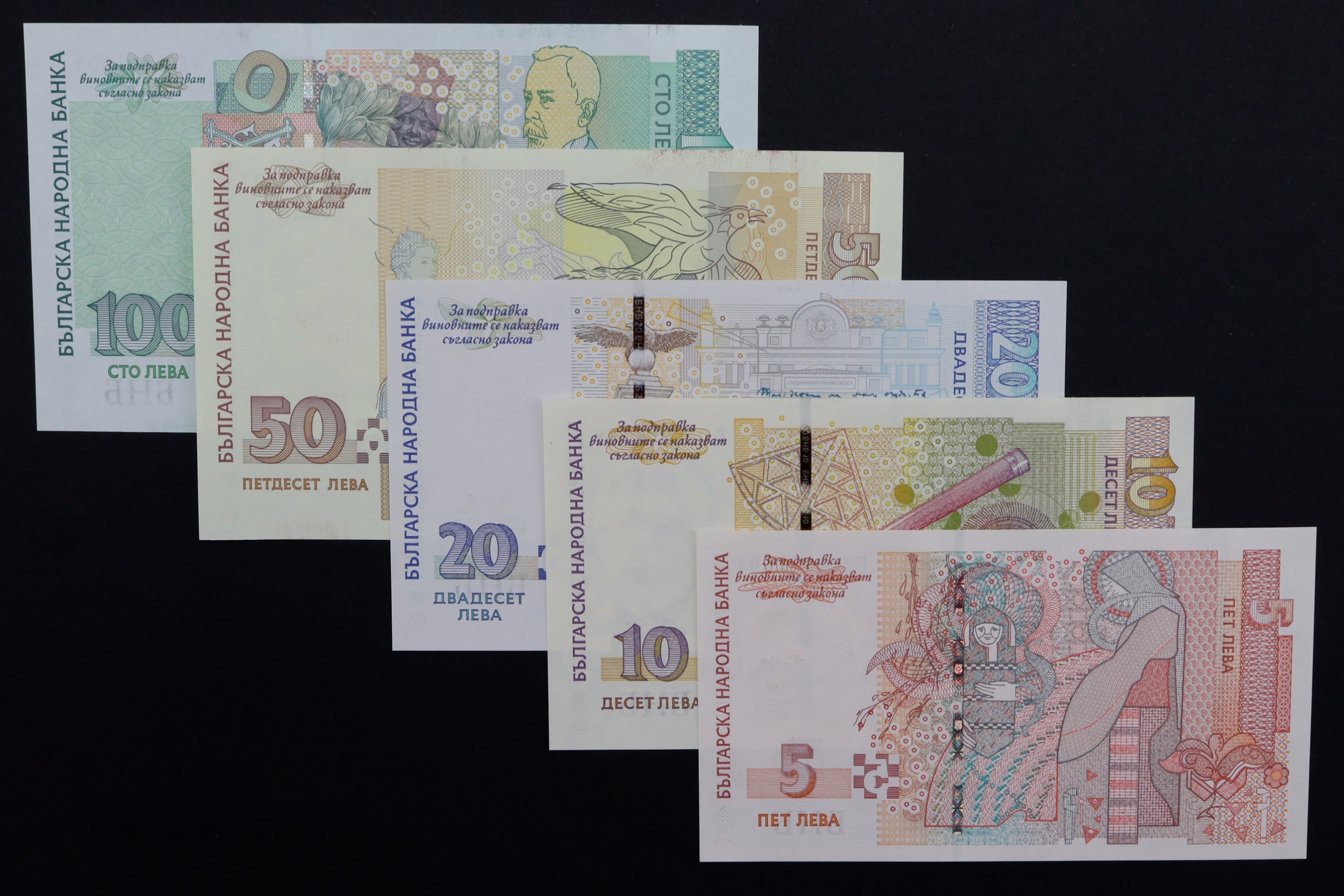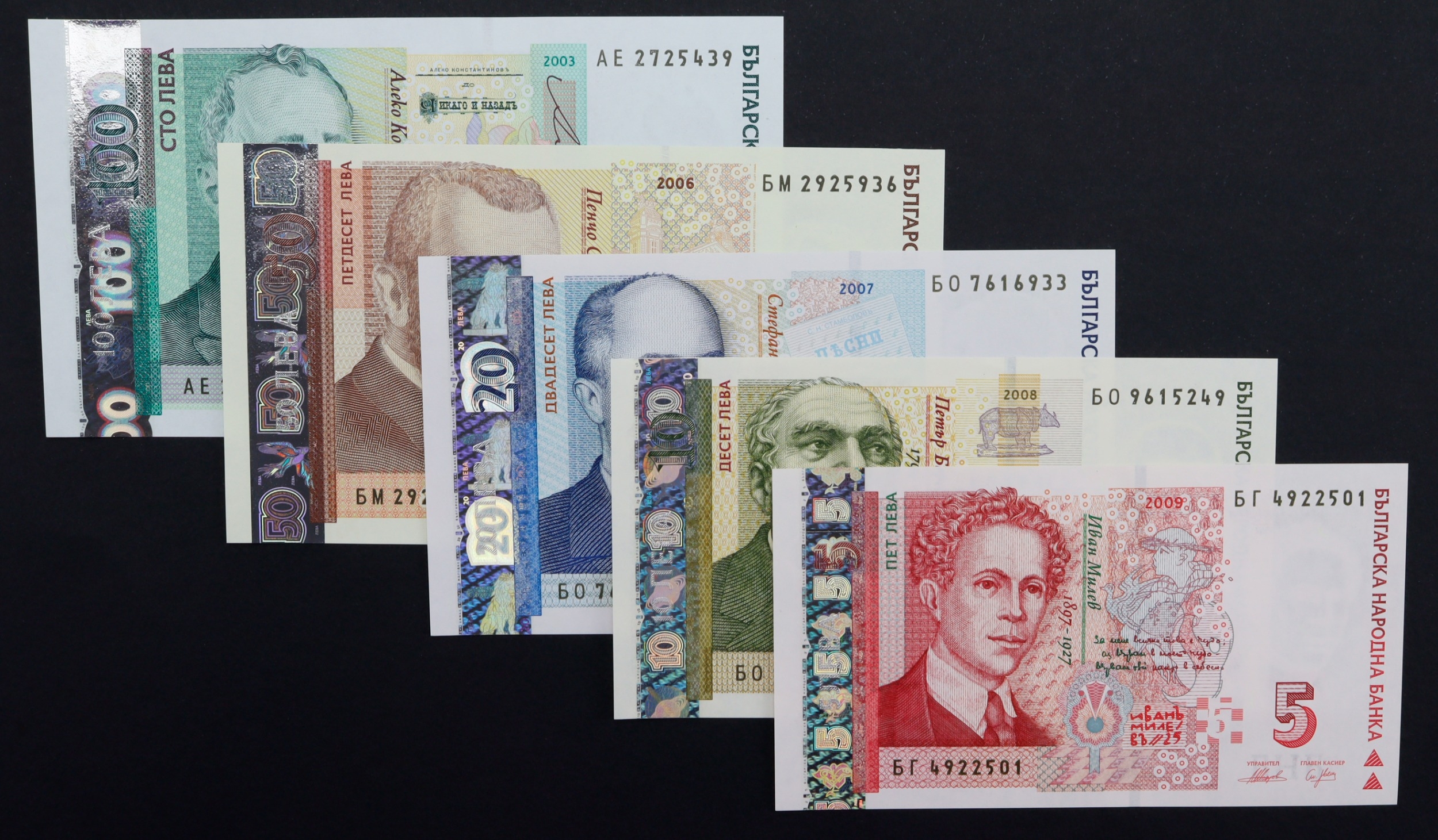 Bulgaria (5), 100 Leva dated 2003, 50 Leva dated 2006, 20 Leva dated 2007, 10 Leva dated 2008, 10 Leva dated 2009 (BNB B229a, B231 - B234, Pick116 - 120) Uncirculated