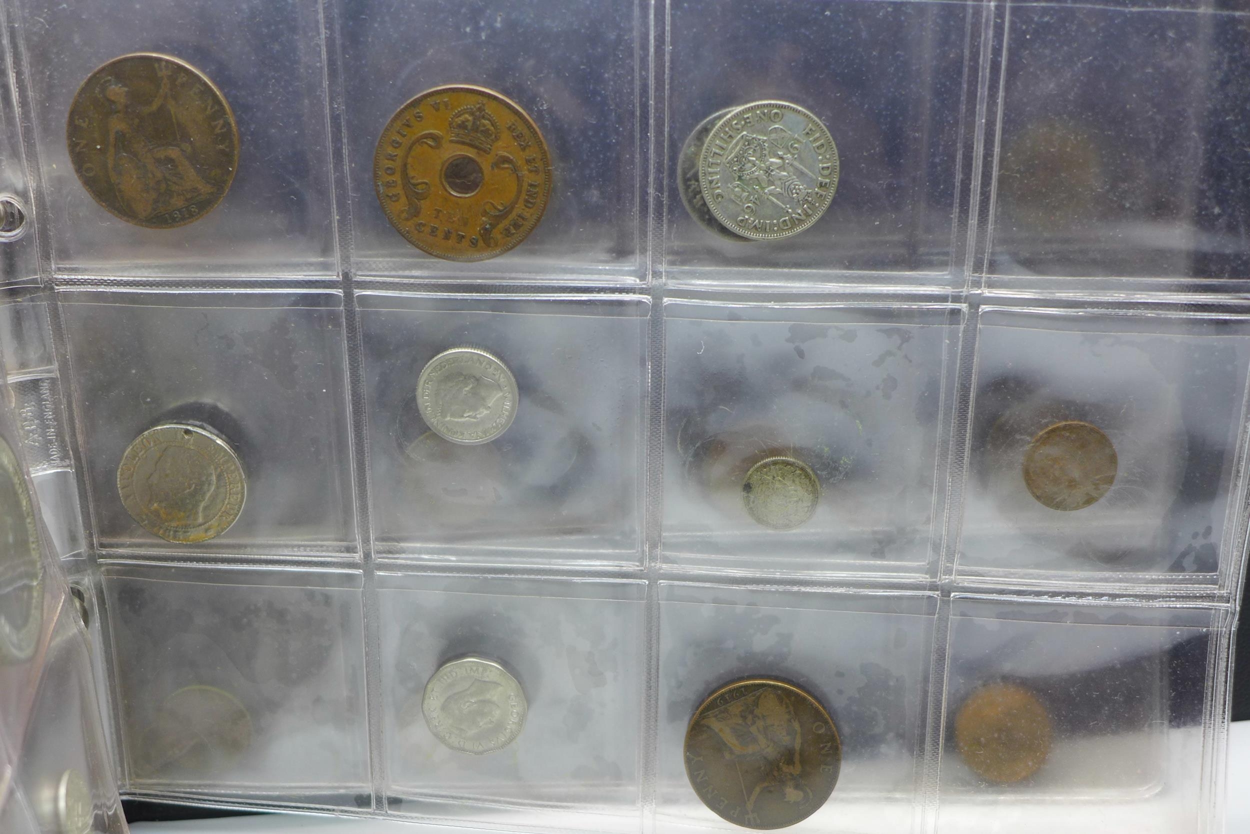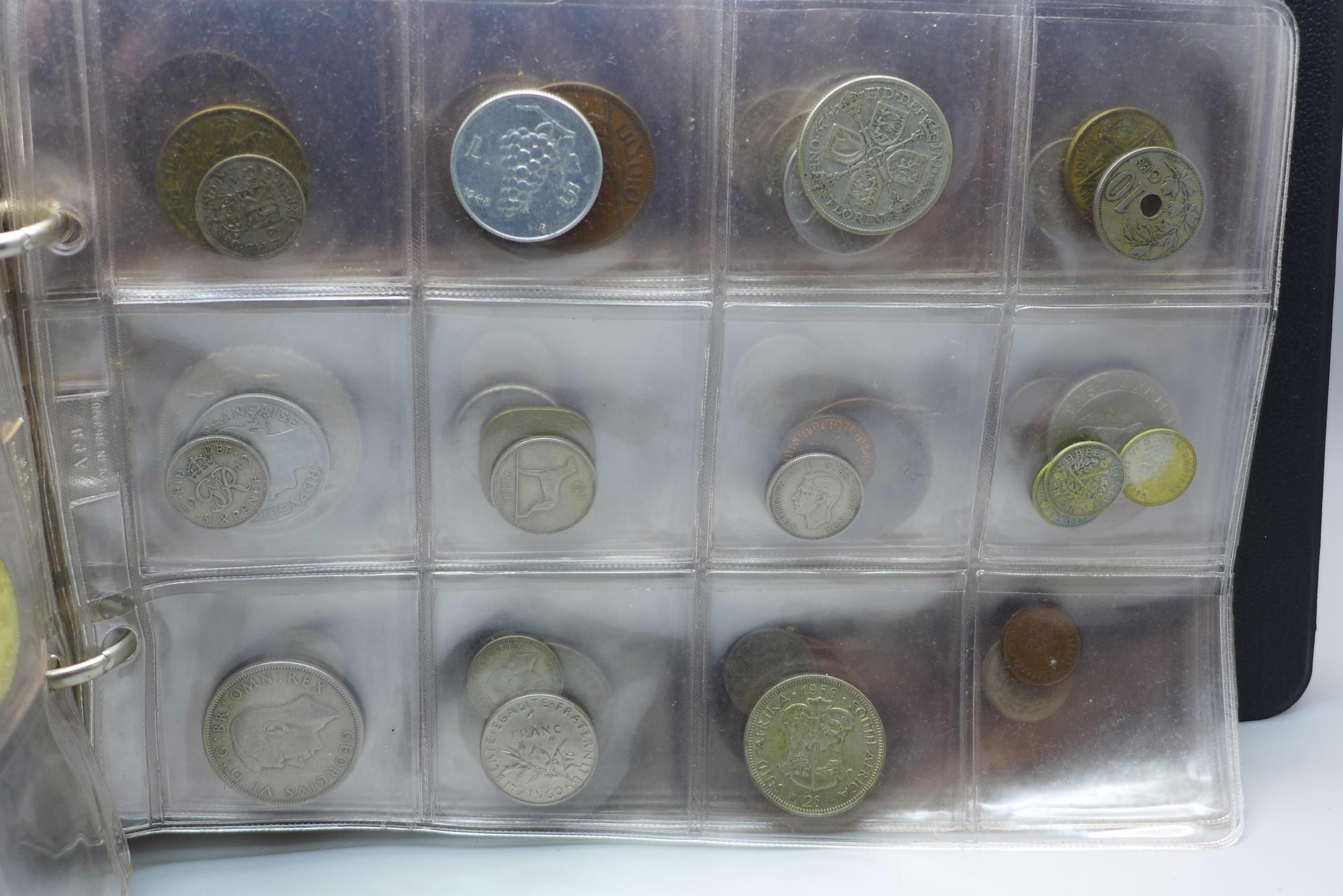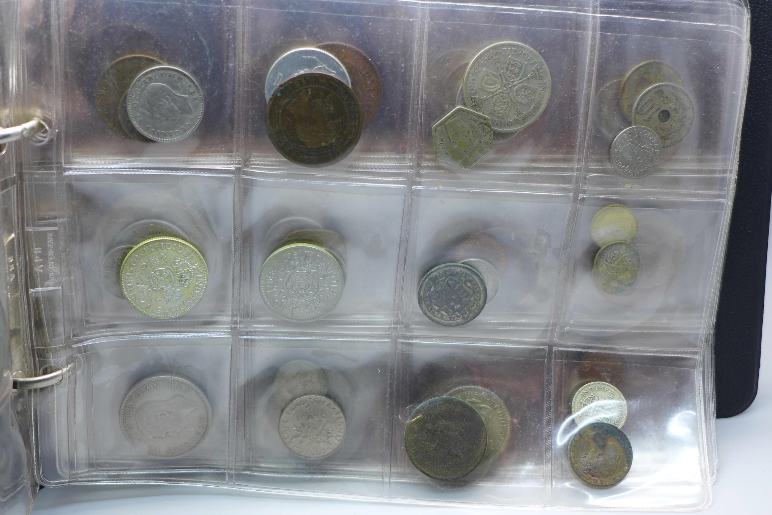 An album of assorted coins including a Victorian shilling