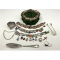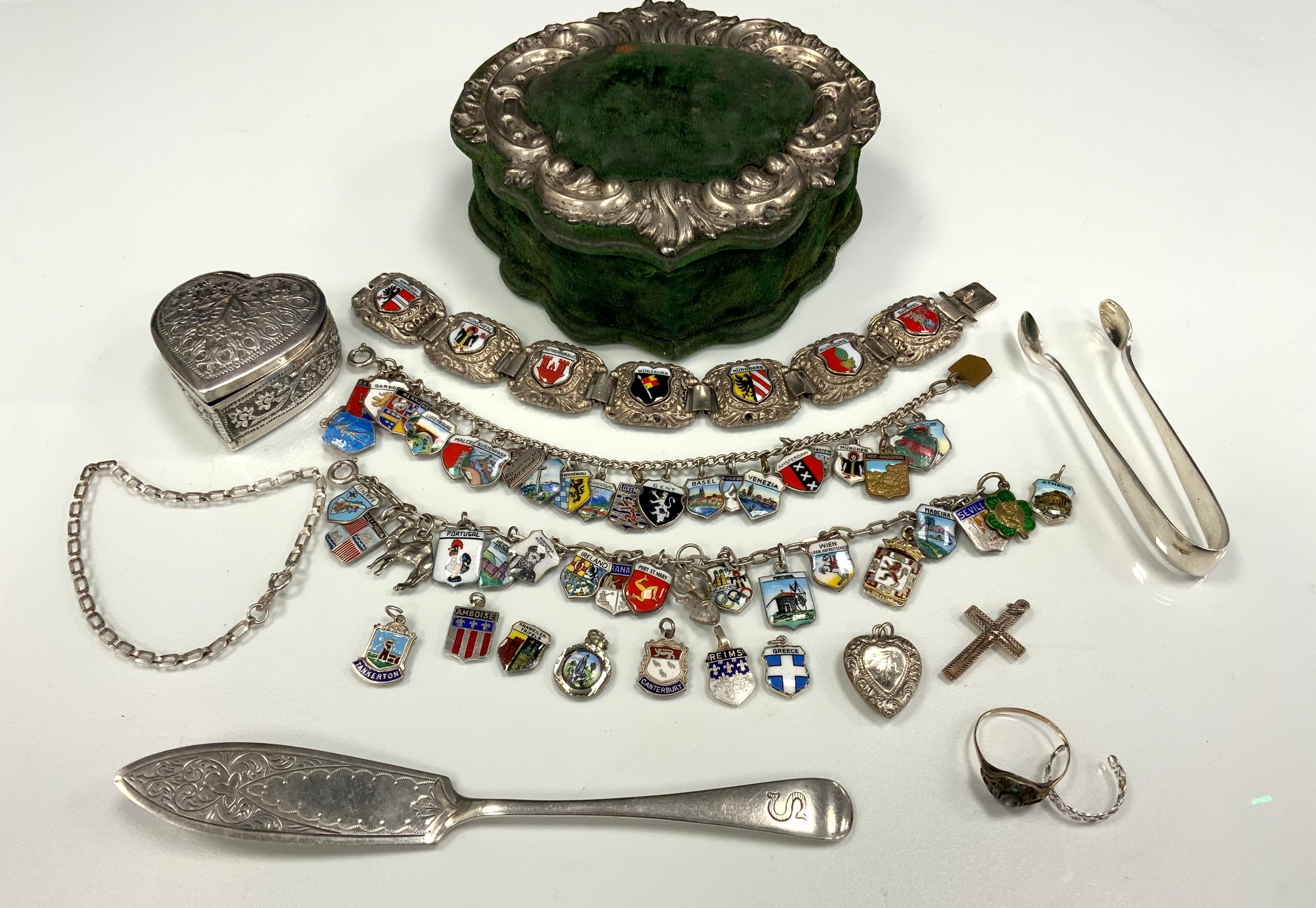 An Edwardian silver mounted green felt jewellery box, Chester 1904; silver metal heart pill box; 925 silver enamelled shield charm bracelets, etc