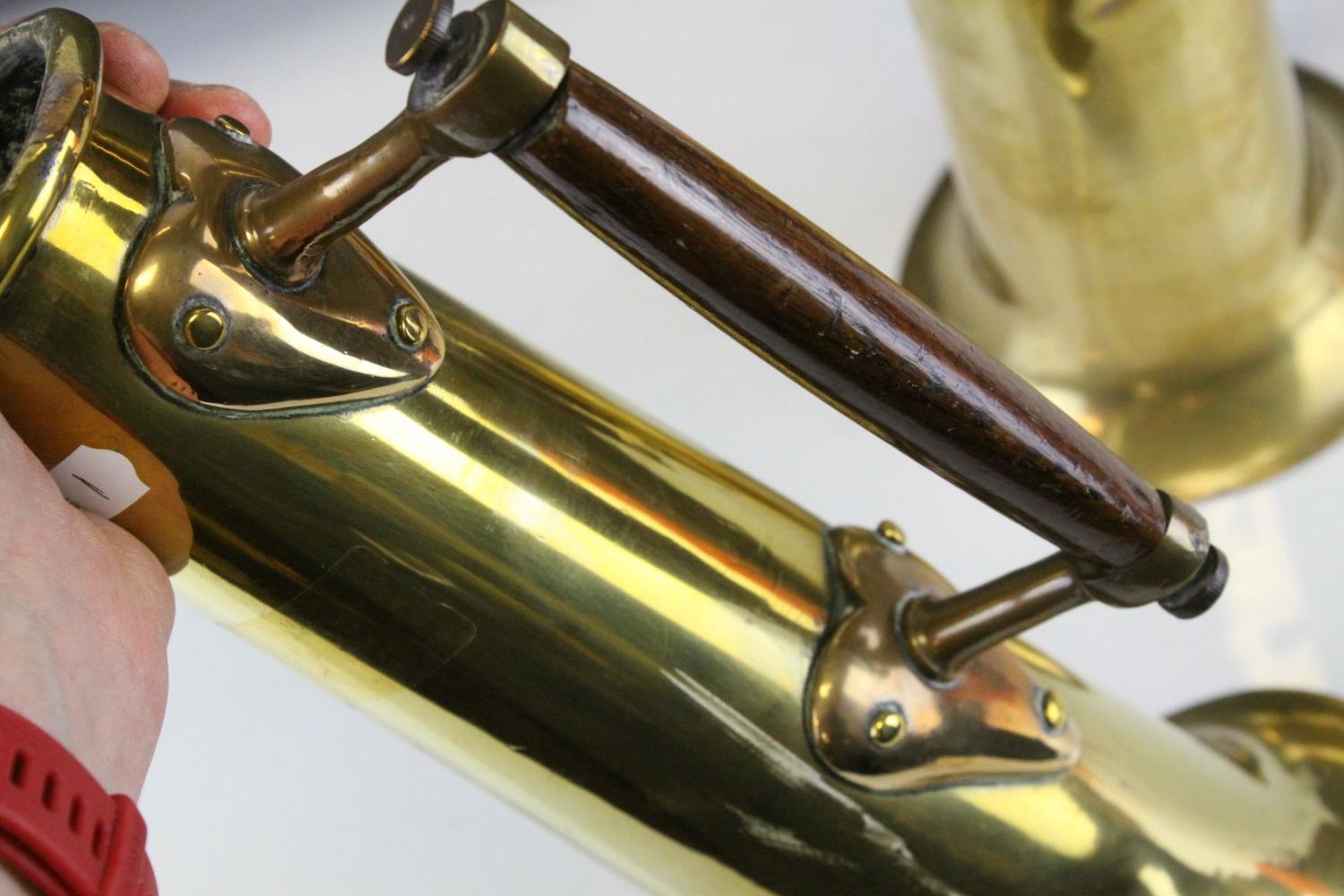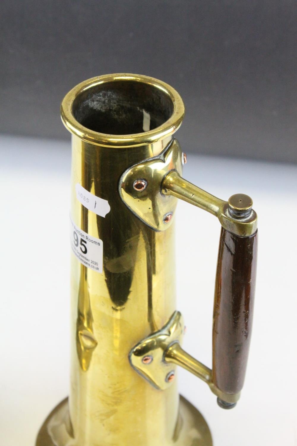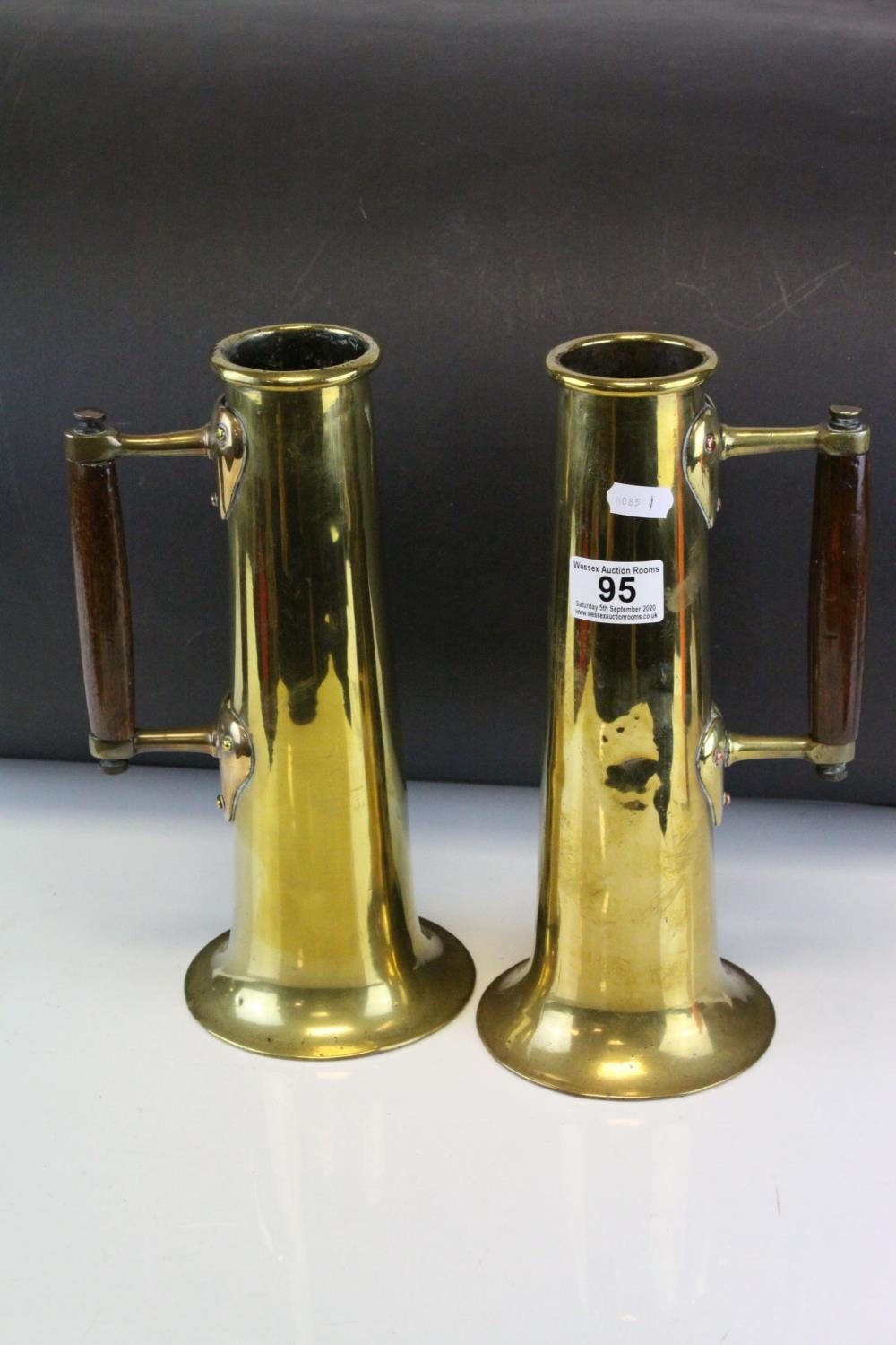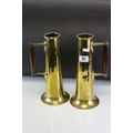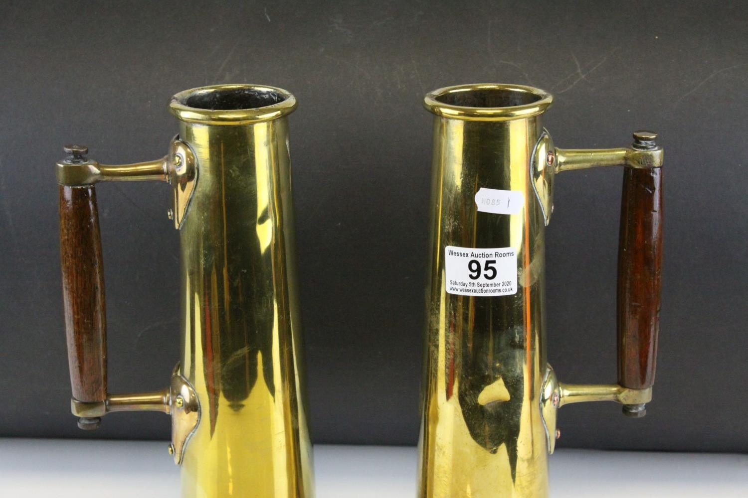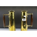 Pair of World War I Trench Art Brass Shells formed into Tankards with Arts & Crafts Oak Handles, each 29.5cm high